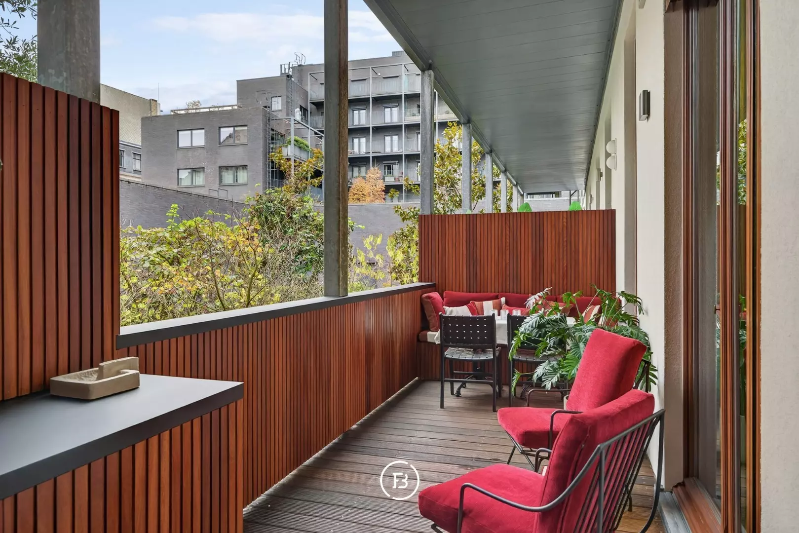 De volledig geïnstalleerde keuken met ontbijthoek vormt het kloppend hart van de woning en geeft uit op het zuidoost gerichte terras met uitzicht op de binnentuin en de historische Handelsbeurs, een oase van rust midden in de stad.