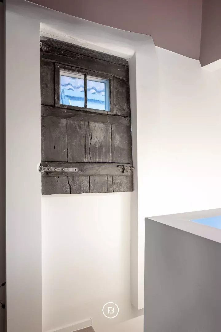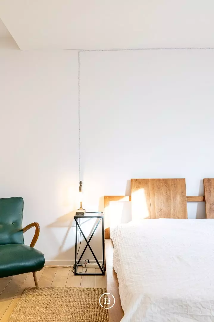 De bovenste verdieping is toegankelijk via twee aparte trappen. Achteraan leidt een trap naar een comfortabele logeerkamer, terwijl vooraan een tweede trap uitgeeft op een ruime en charmante slaapkamer met mezzanine en een open bureauruimte met ingemaakte kasten.