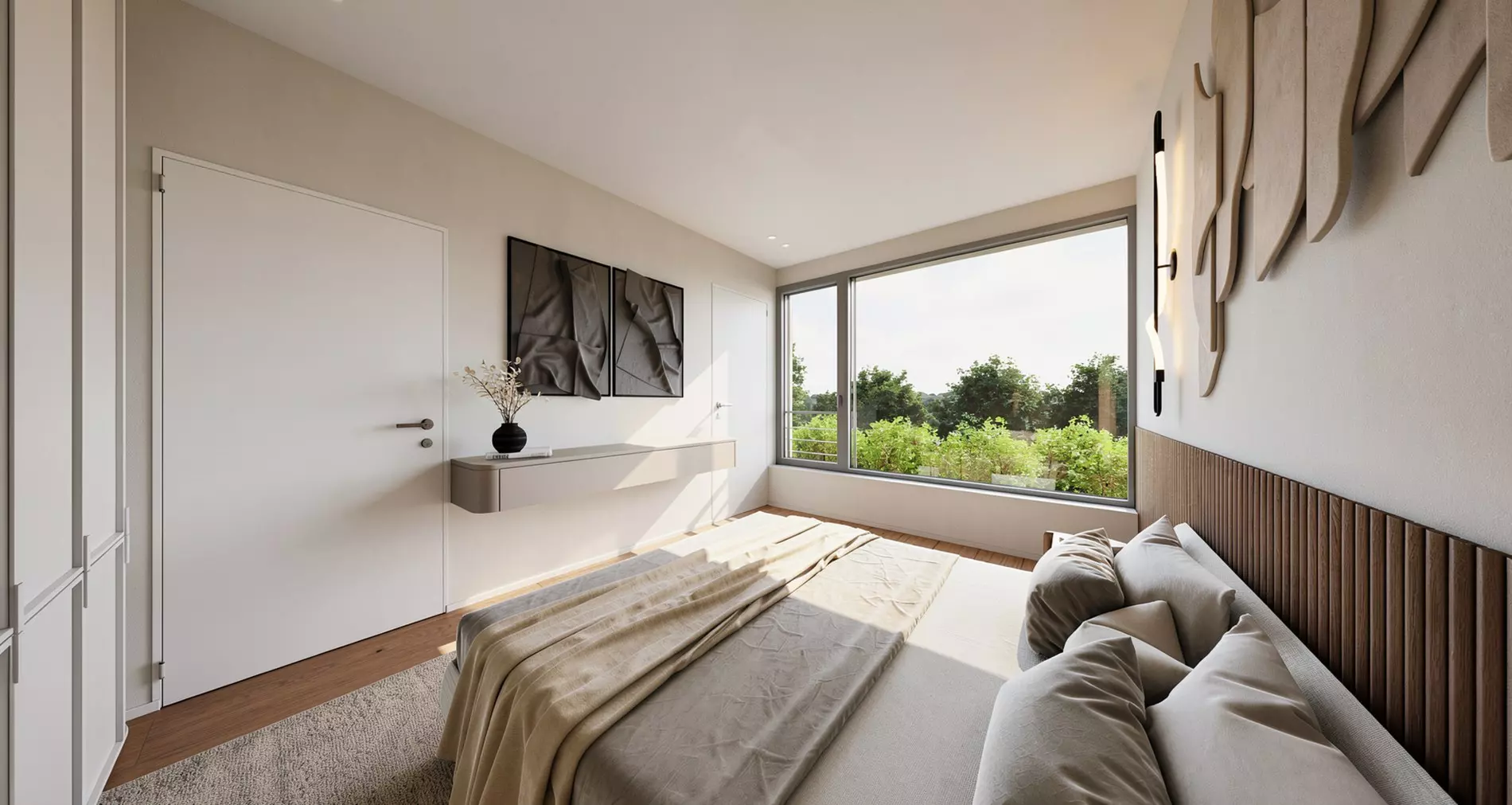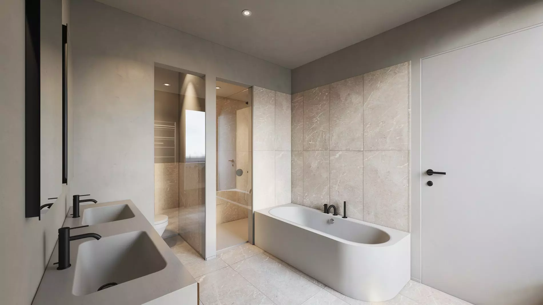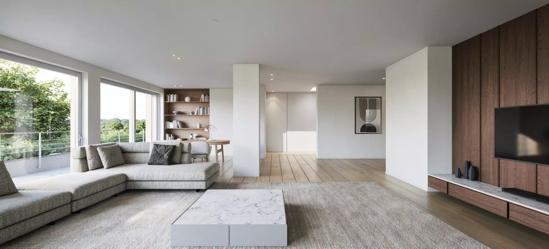 De leefruimtes zijn royaal en harmonieus ingedeeld, met grote raampartijen die uitgeven op ruime terrassen en/of privatieve tuinen. Dit zorgt voor een aangename overgang tussen binnen en buiten, met behoud van volledige privacy.