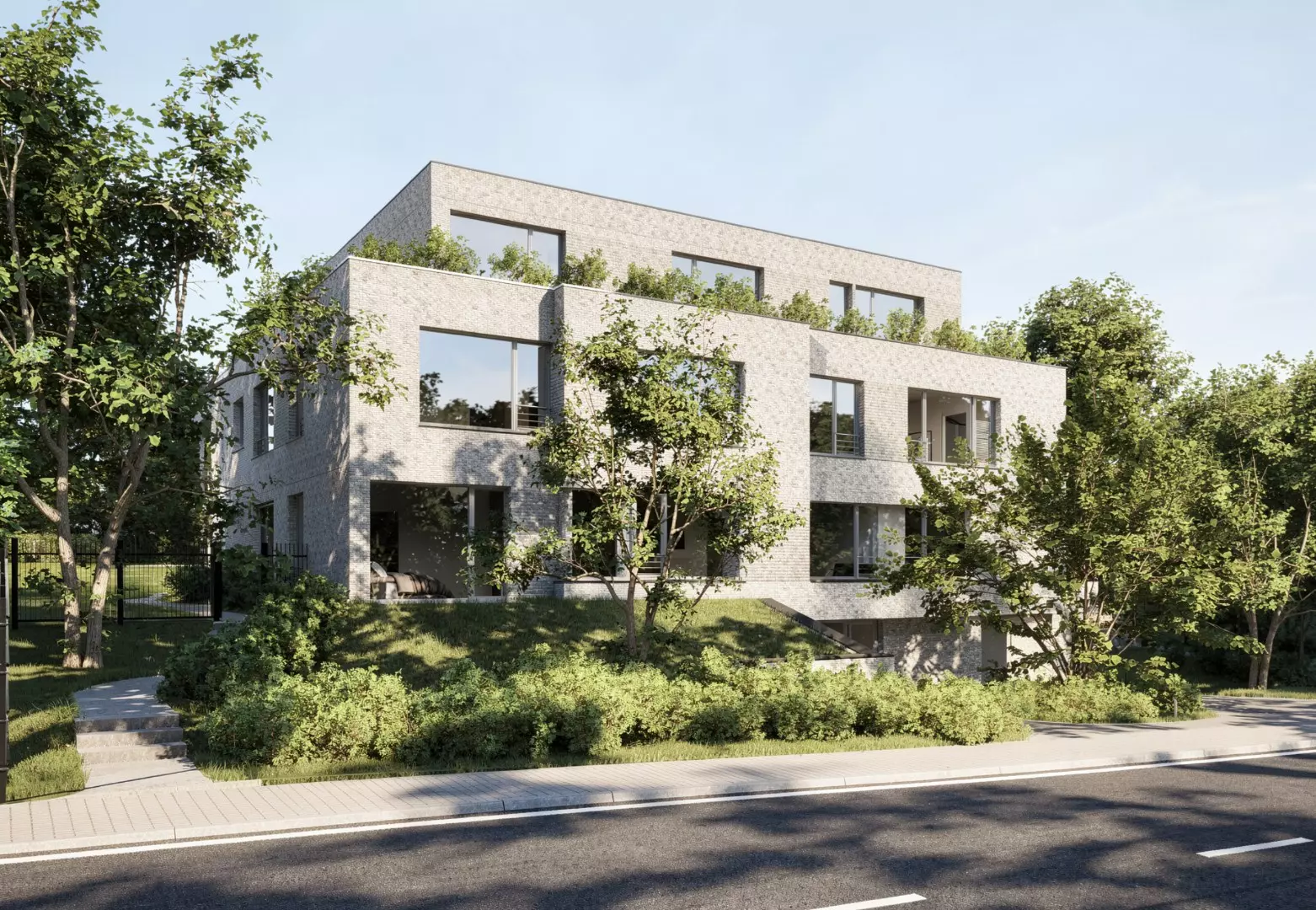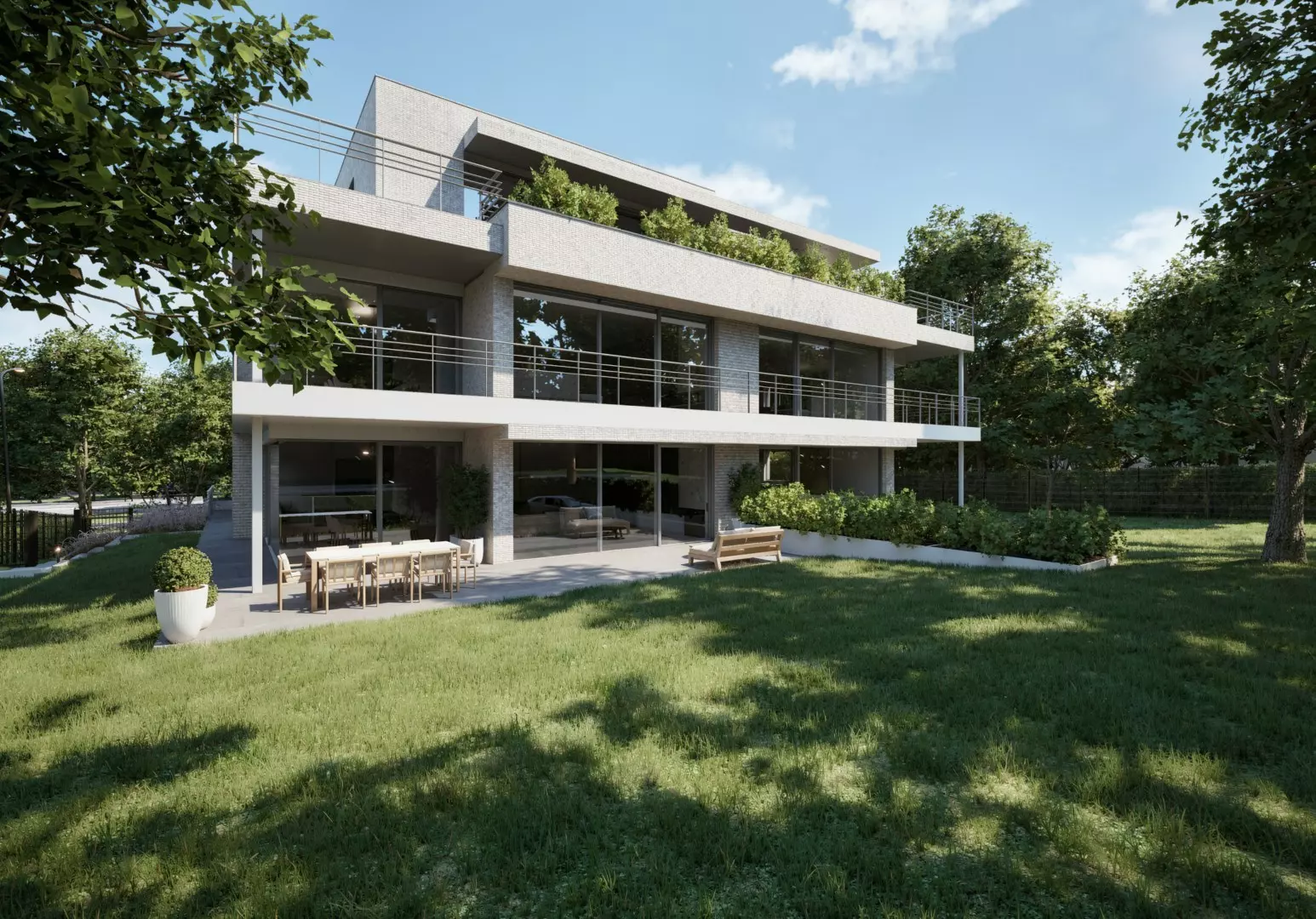 Deze hedendaagse villa, ontworpen door Marc Corbiau, omvat vijf ruime appartementen waaronder dit penthouse van 278 m² met 98 m² terrassen. De architectuur wordt gekenmerkt door haar heldere lijnen en horizontale opbouw, waardoor elk appartement geniet van maximale lichtinval en een sterke connectie met de groene omgeving.