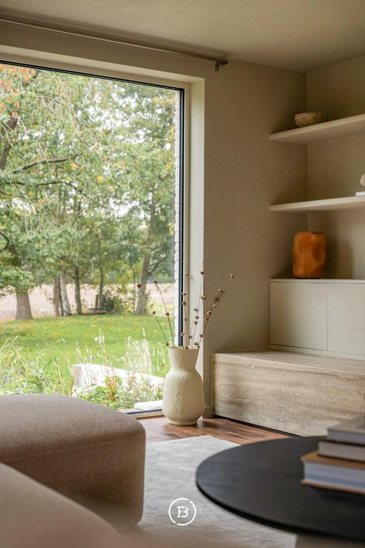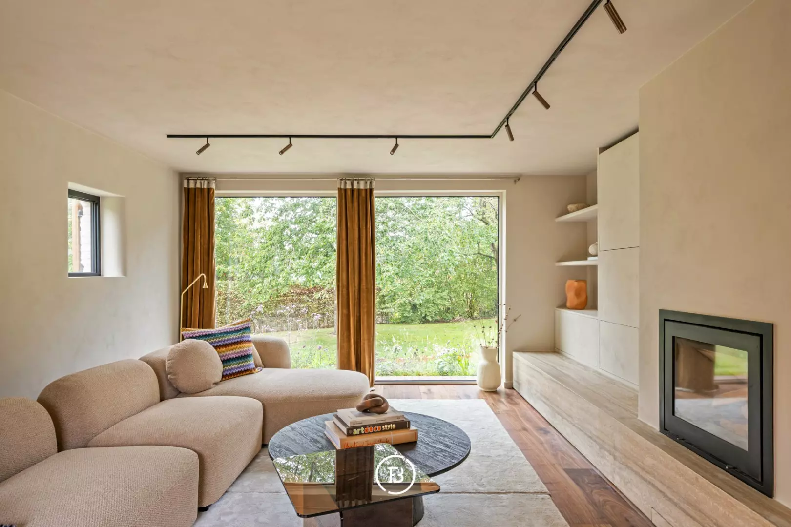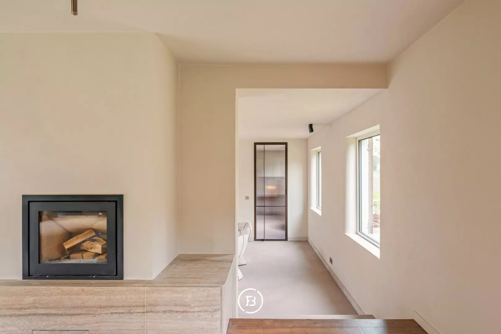 • De gezellige living met houthaard sluit naadloos aan bij de stijlvolle eetplaats.