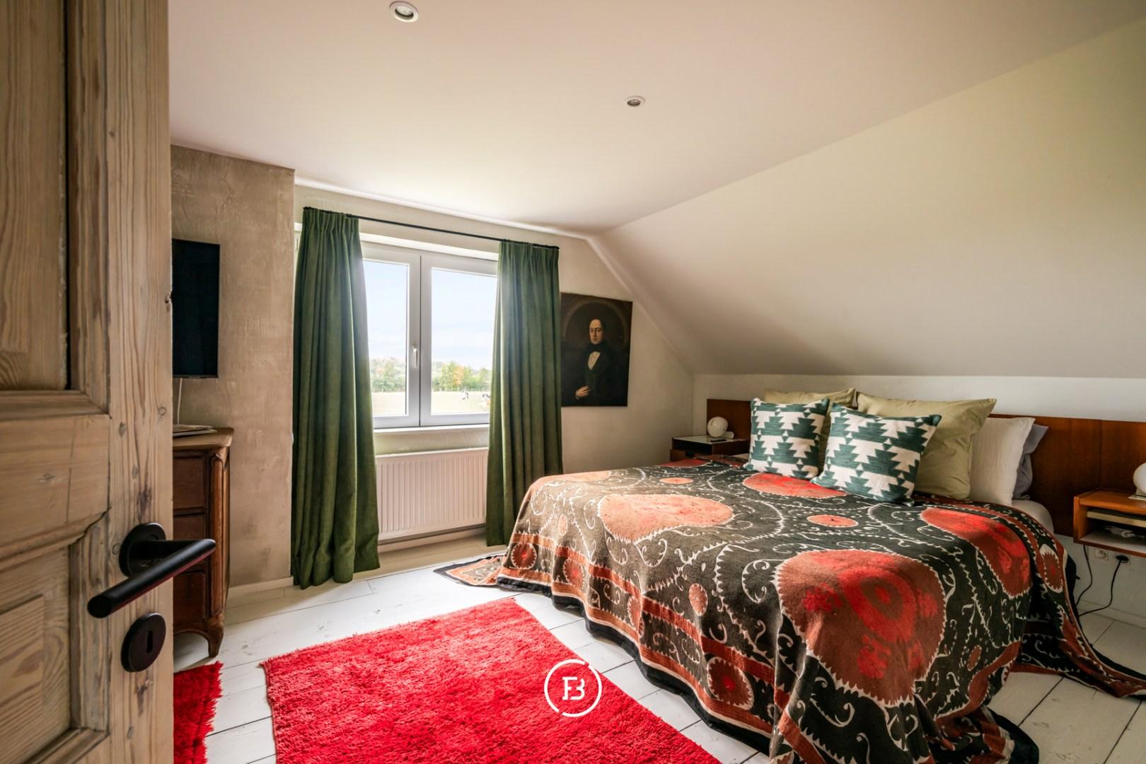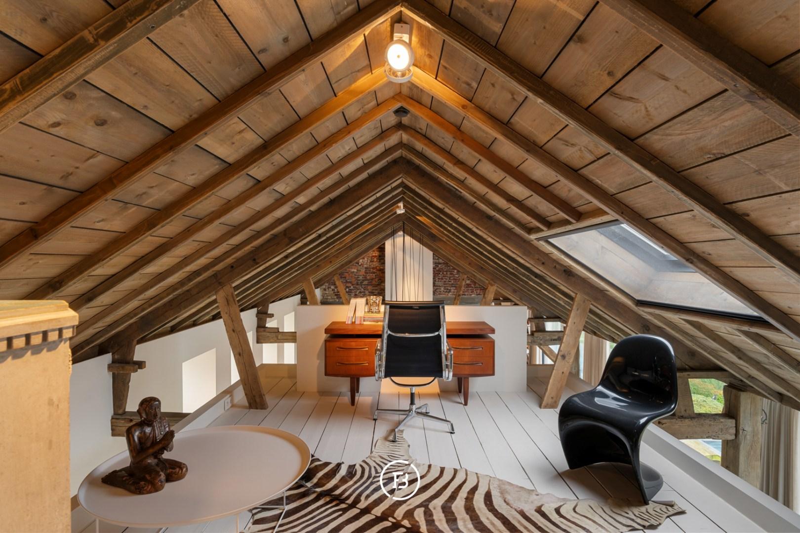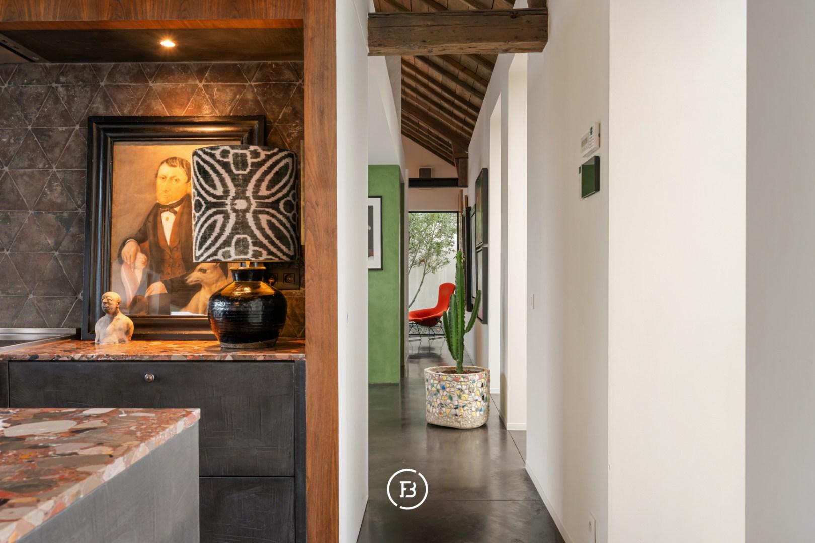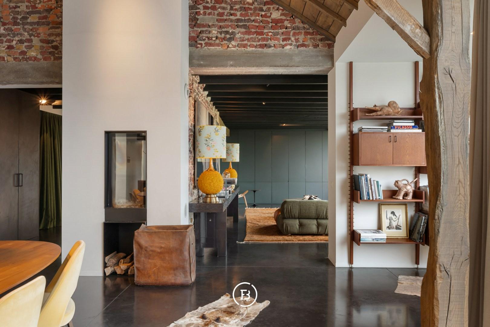 De leefruimte is indrukwekkend in haar openheid en sfeer: een gezellige zithoek met open haard, een uitnodigende leeshoek, een eetplaats met tweede haard en een perfect uitgeruste keuken vormen samen het kloppend hart van de woning. Elk detail is doordacht, elk zicht een meerwaarde. Op het gelijkvloers bevinden zich bovendien een polyvalente master bedroom, een dubbele regendouche en een luxueuze badkamer met ligbad en uitzicht op een intieme binnentuin. De mezzanine leent zich uitstekend als bureau, atelier of extra slaapkamer. Op de verdieping vervolledigen twee slaapkamers, een douchekamer en wasruimte het geheel.