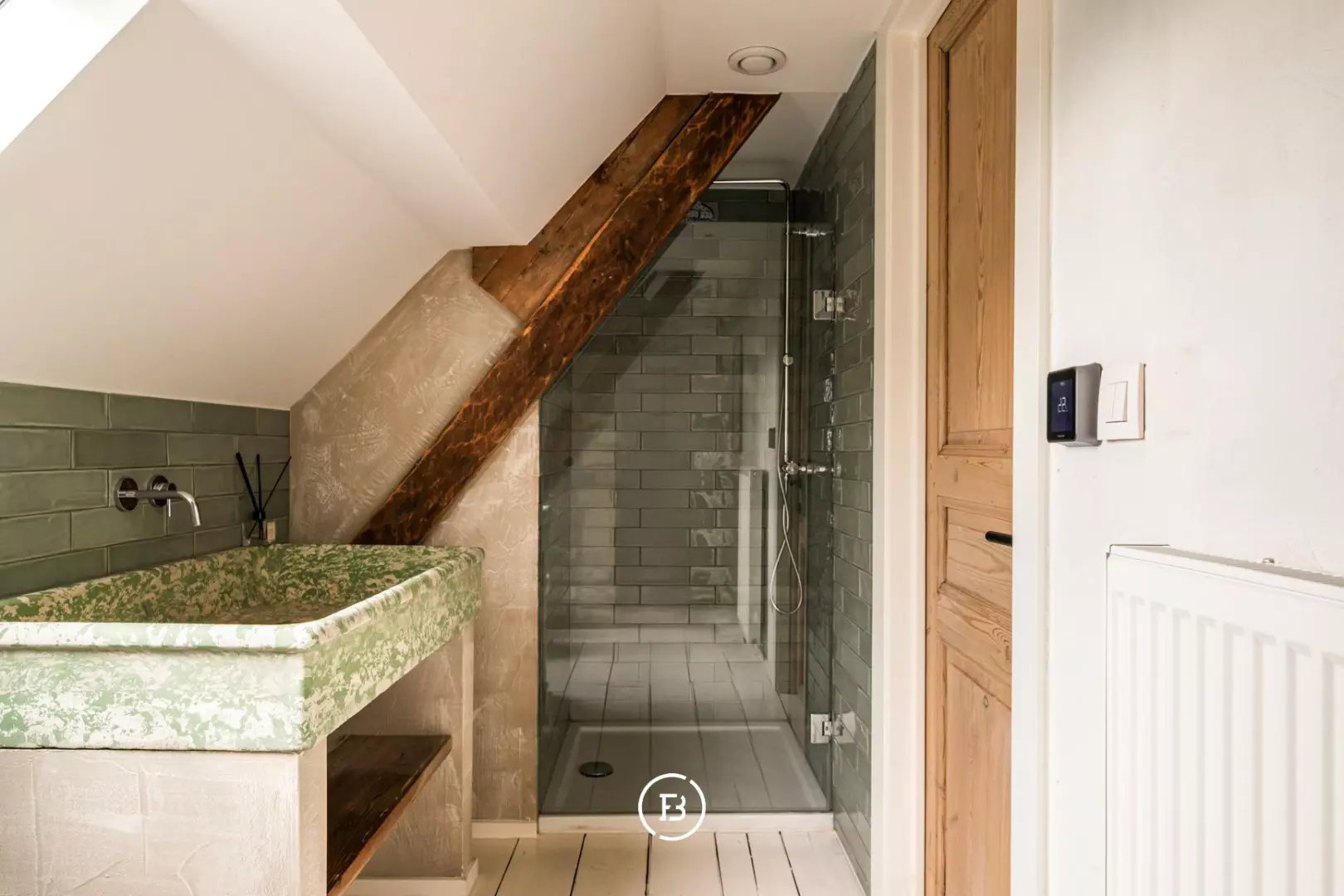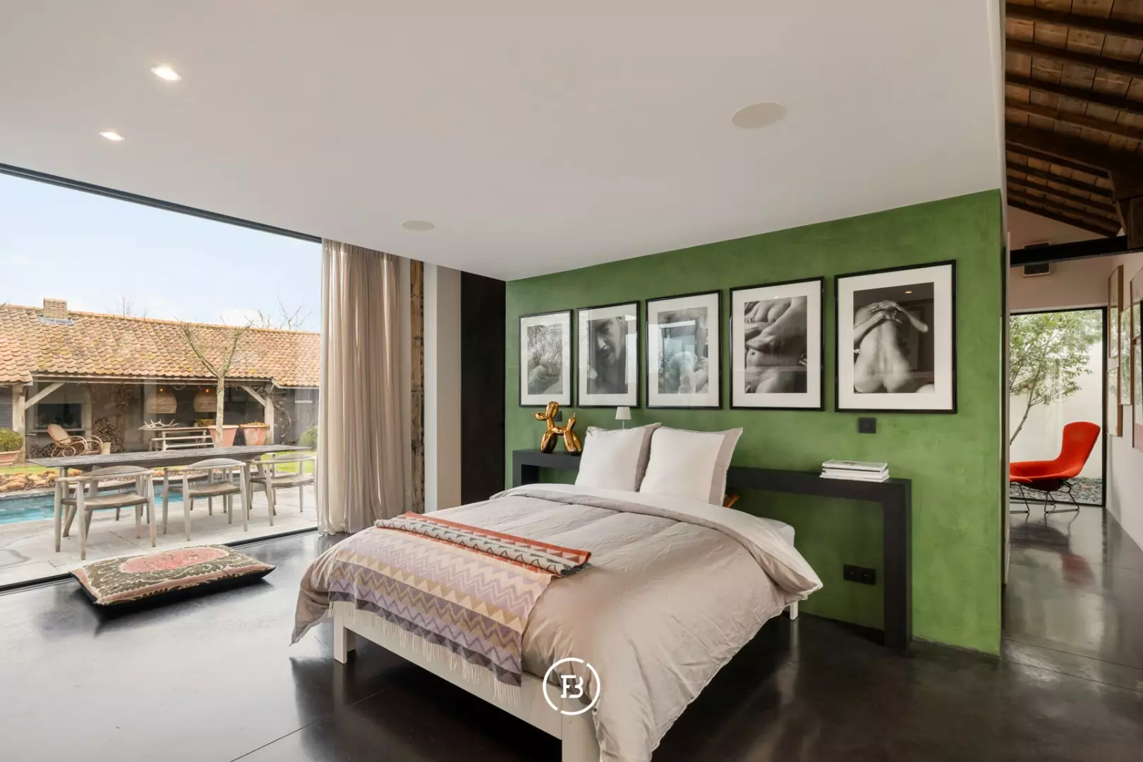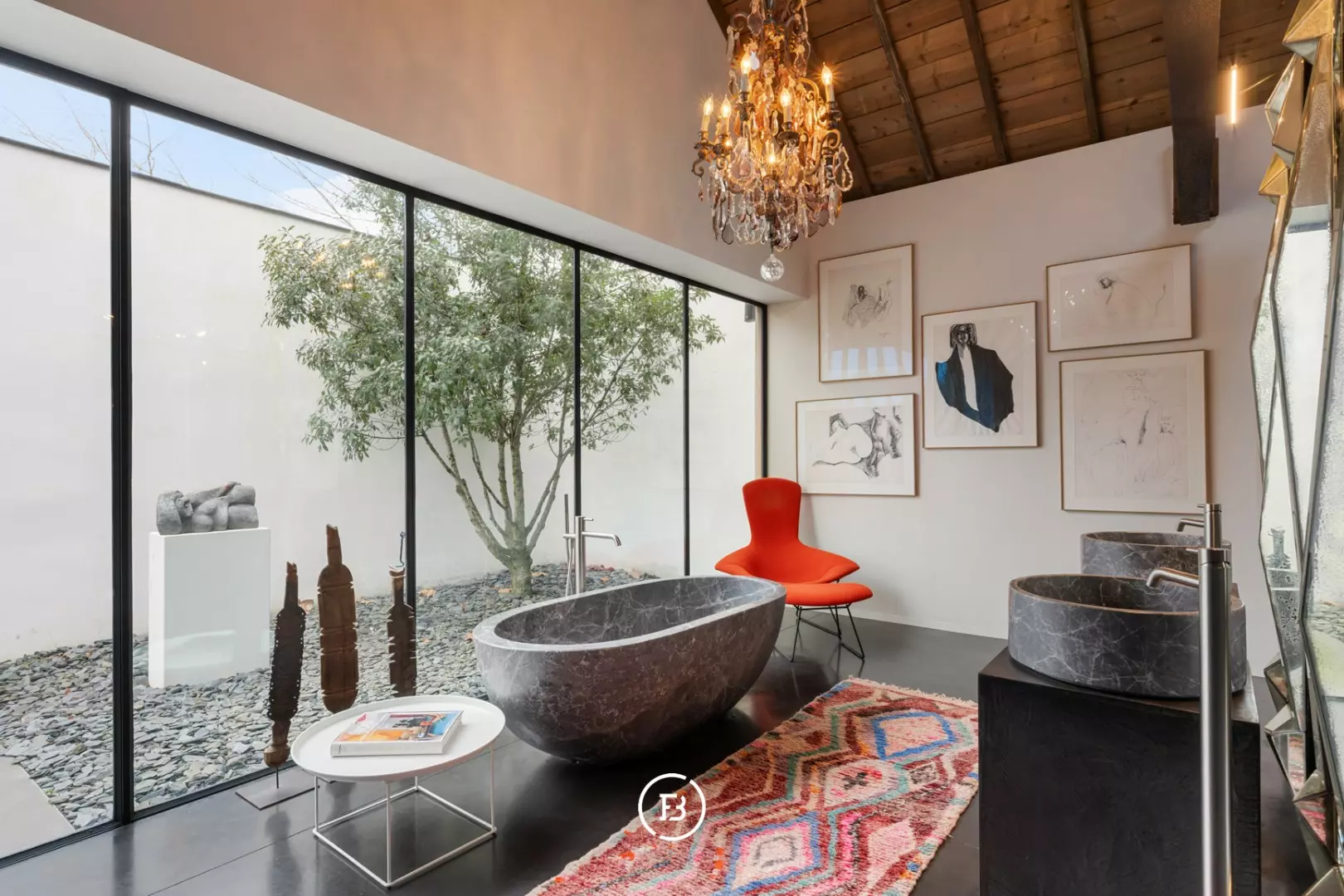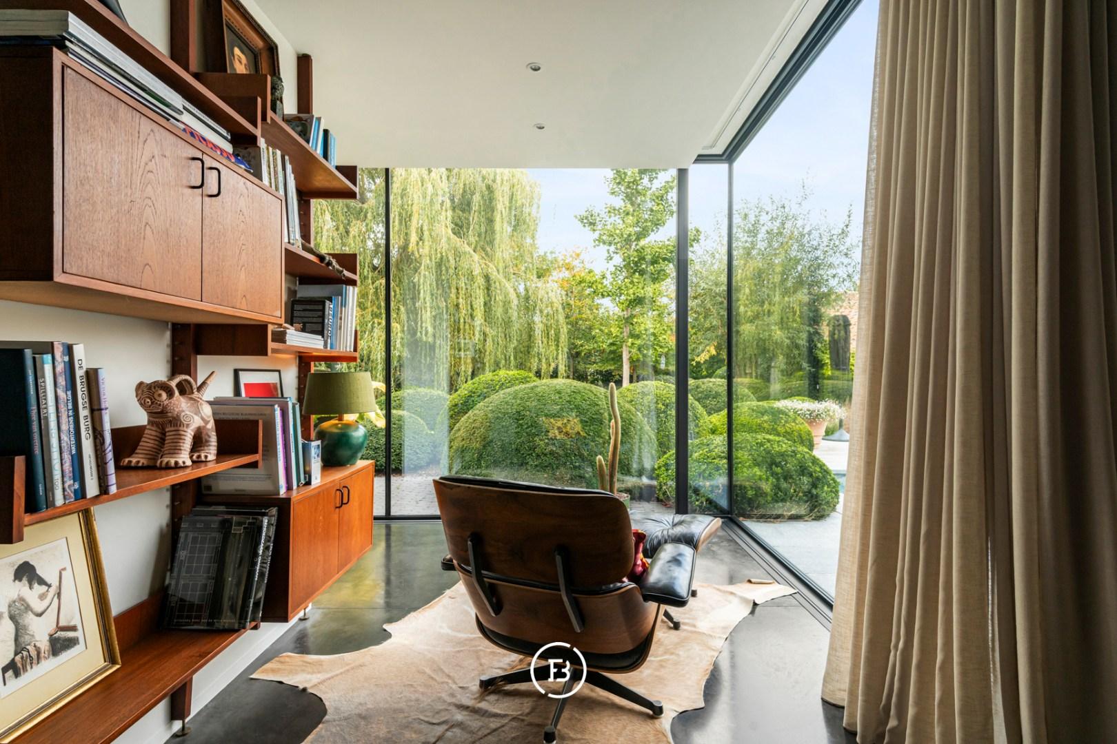 De leefruimte is indrukwekkend in haar openheid en sfeer: een gezellige zithoek met open haard, een uitnodigende leeshoek, een eetplaats met tweede haard en een perfect uitgeruste keuken vormen samen het kloppend hart van de woning. Elk detail is doordacht, elk zicht een meerwaarde. Op het gelijkvloers bevinden zich bovendien een polyvalente master bedroom, een dubbele regendouche en een luxueuze badkamer met ligbad en uitzicht op een intieme binnentuin. De mezzanine leent zich uitstekend als bureau, atelier of extra slaapkamer. Op de verdieping vervolledigen twee slaapkamers, een douchekamer en wasruimte het geheel.