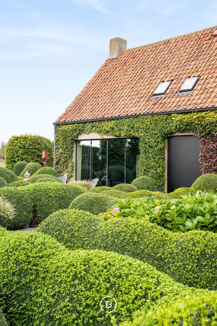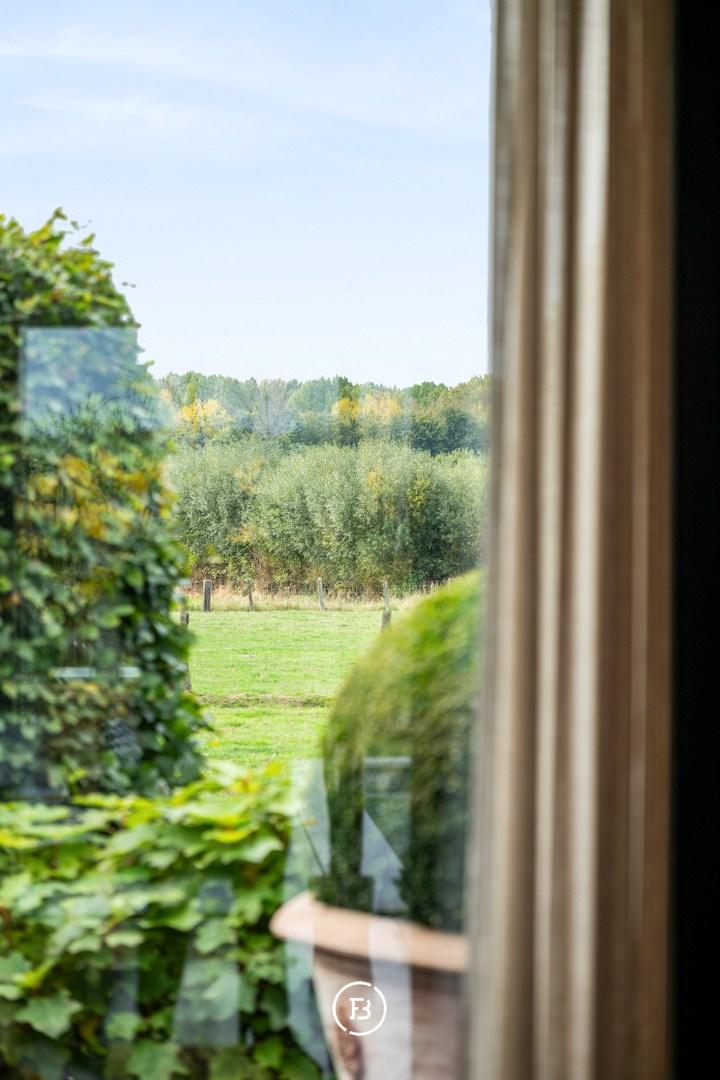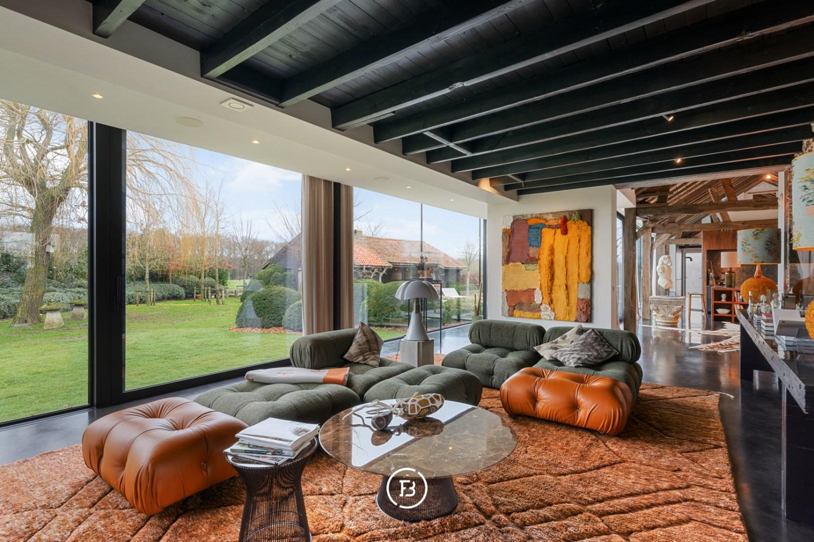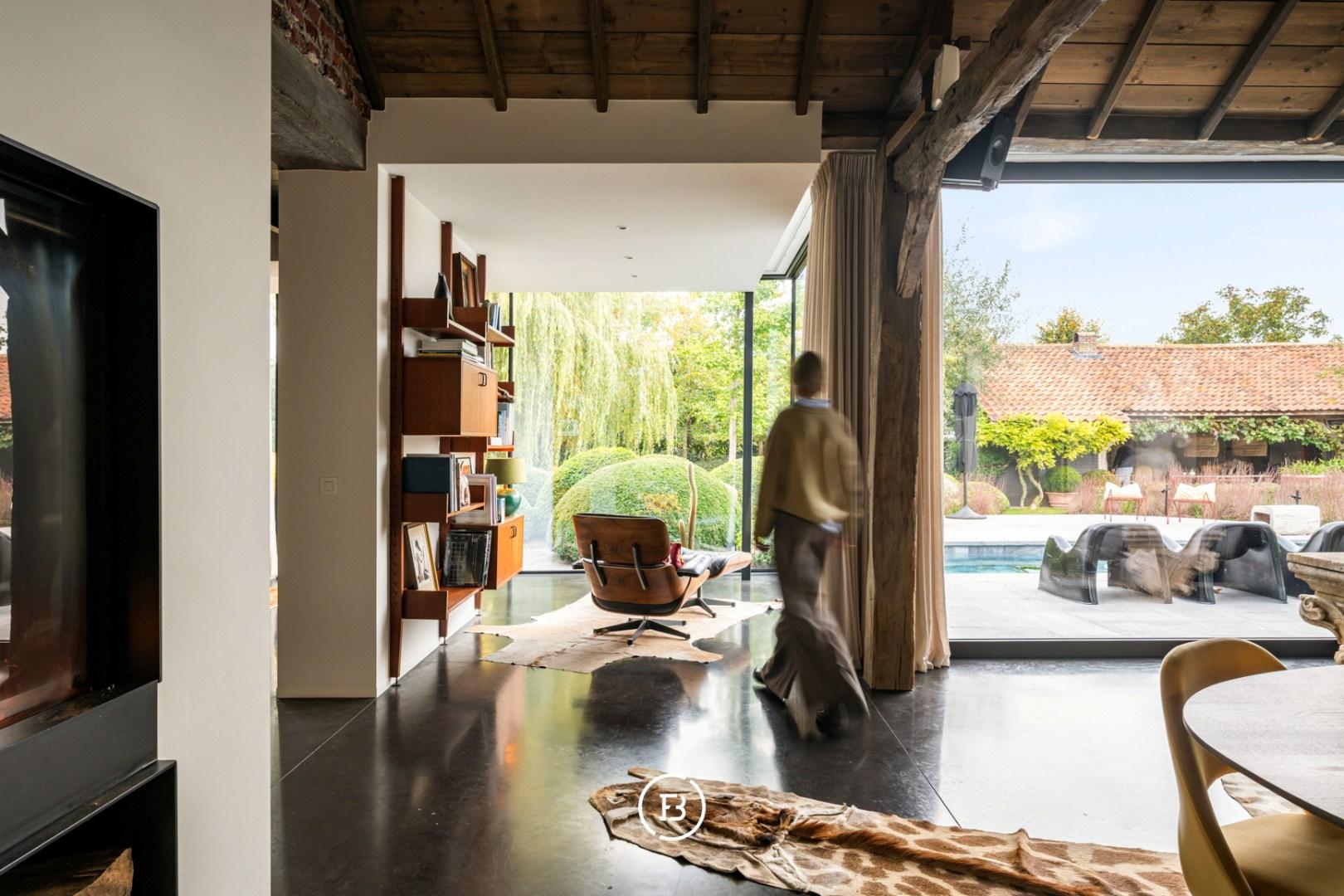 De hoeve werd volledig herbouwd met oog voor energiezuinigheid en hedendaags wooncomfort. Het resultaat is een unieke woonbeleving waarin loftgevoel, verfijnde materialen en warme accenten elkaar versterken. Grote raampartijen baden de woning in natuurlijk licht en creëren een permanente connectie met de tuin en het omliggende landschap.