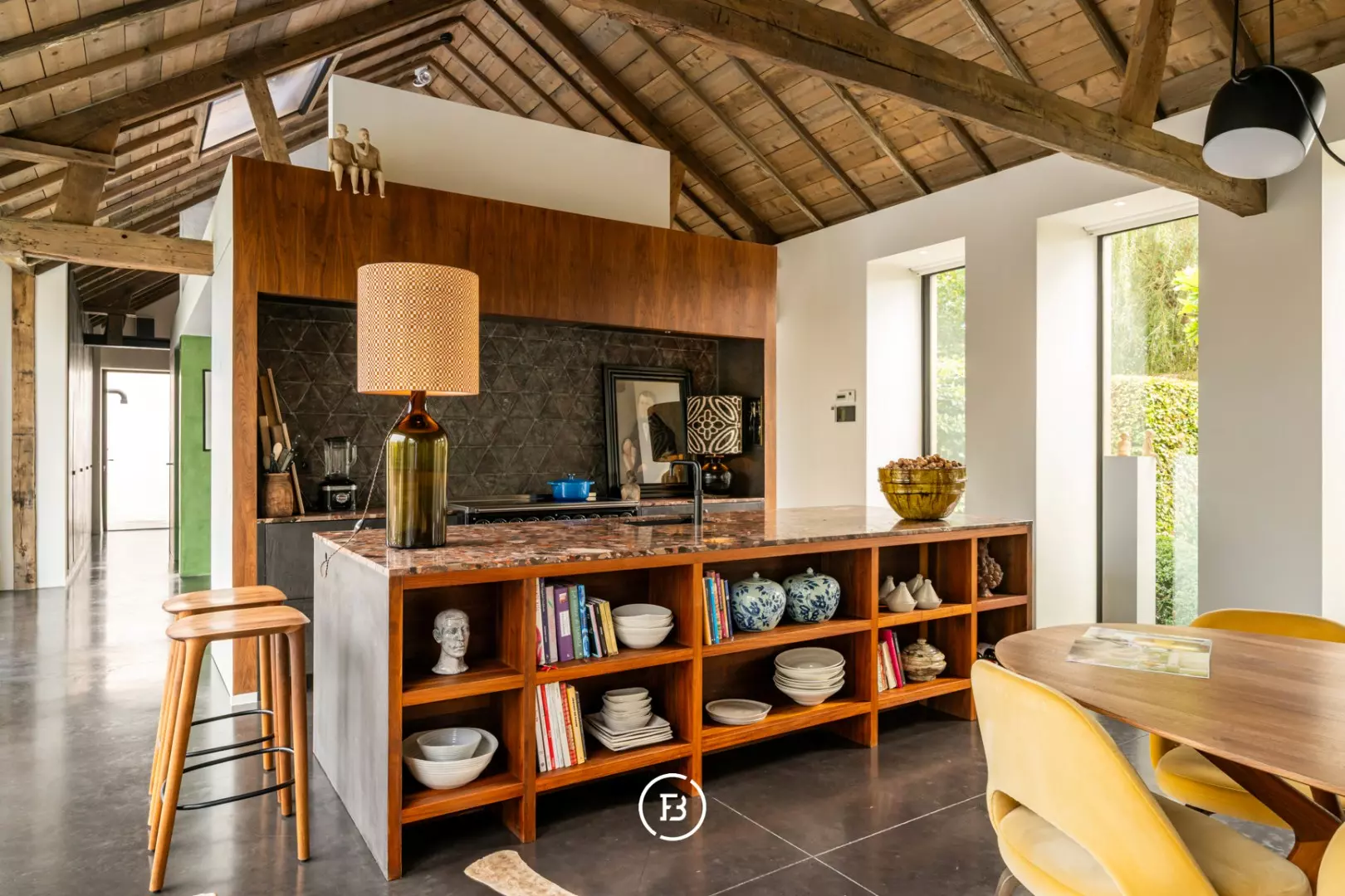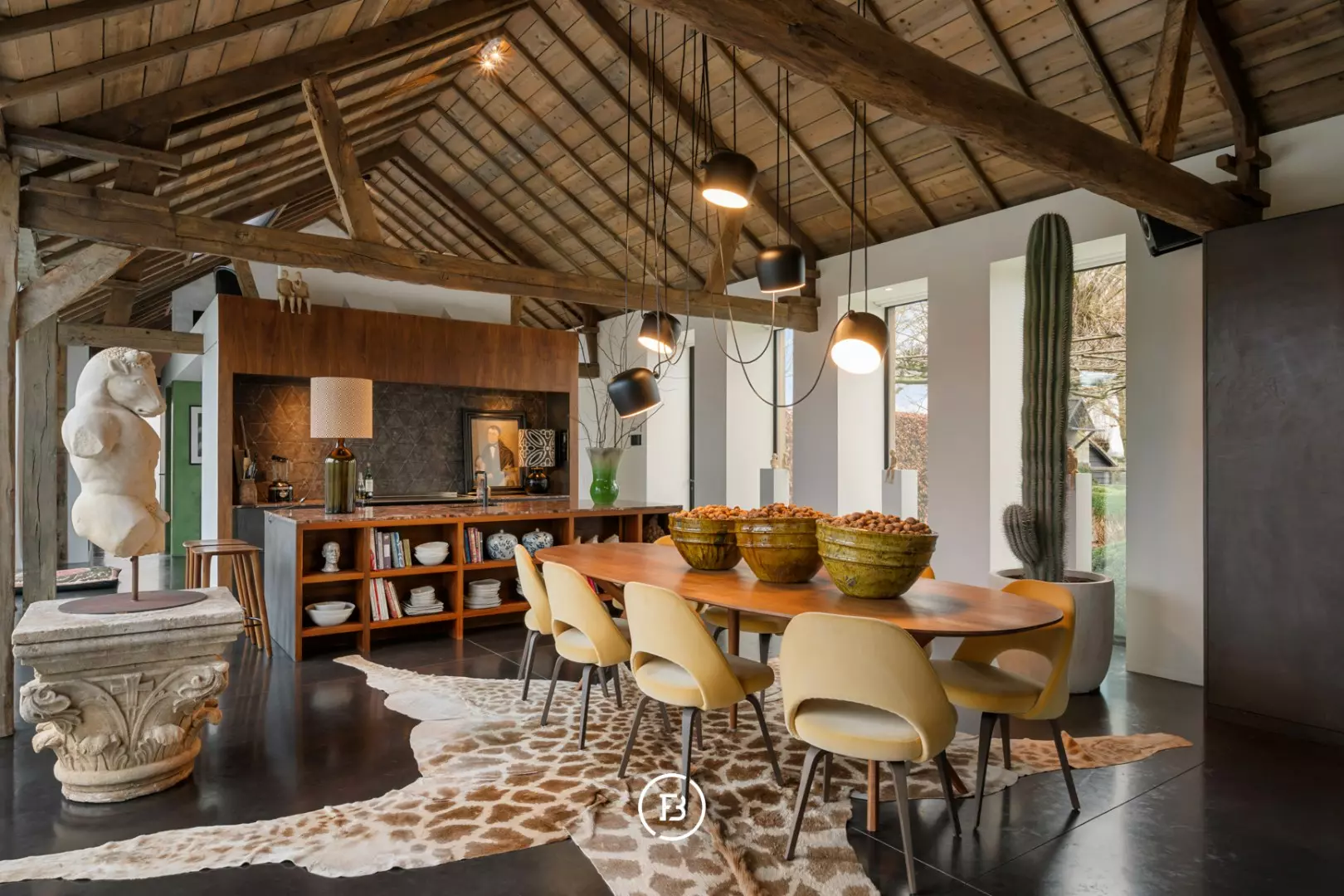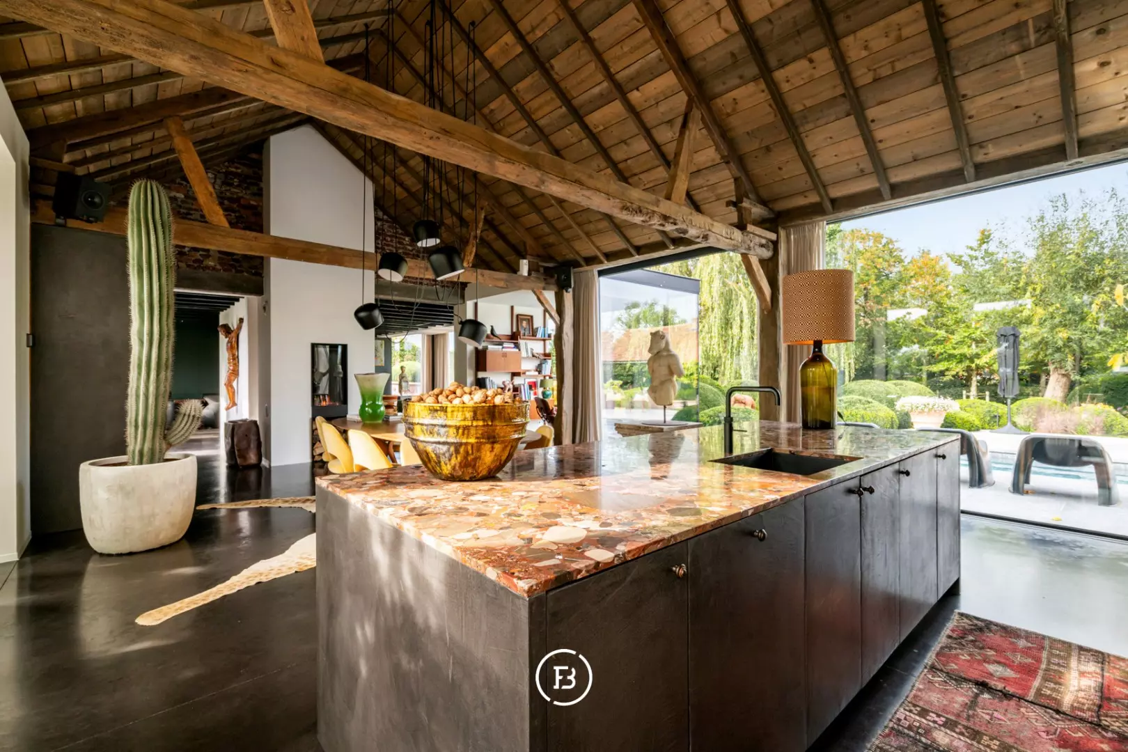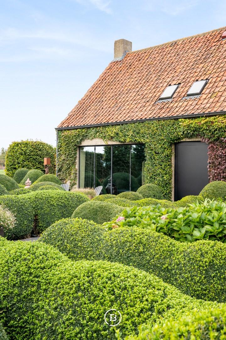 De hoeve werd volledig herbouwd met oog voor energiezuinigheid en hedendaags wooncomfort. Het resultaat is een unieke woonbeleving waarin loftgevoel, verfijnde materialen en warme accenten elkaar versterken. Grote raampartijen baden de woning in natuurlijk licht en creëren een permanente connectie met de tuin en het omliggende landschap.