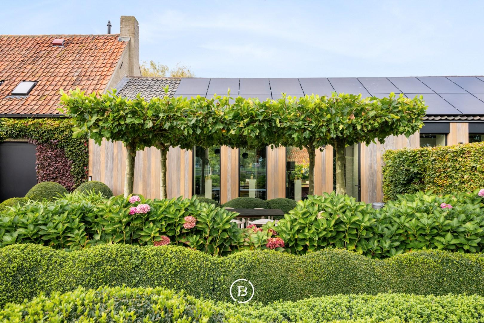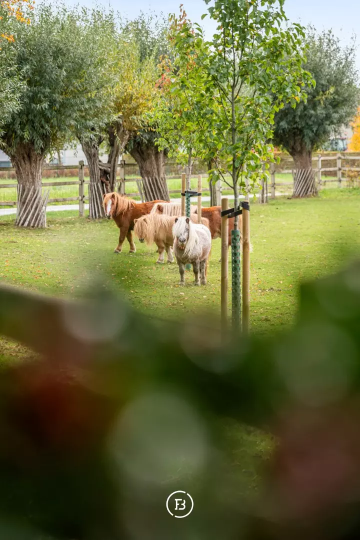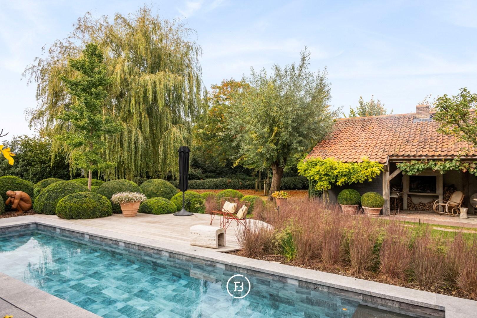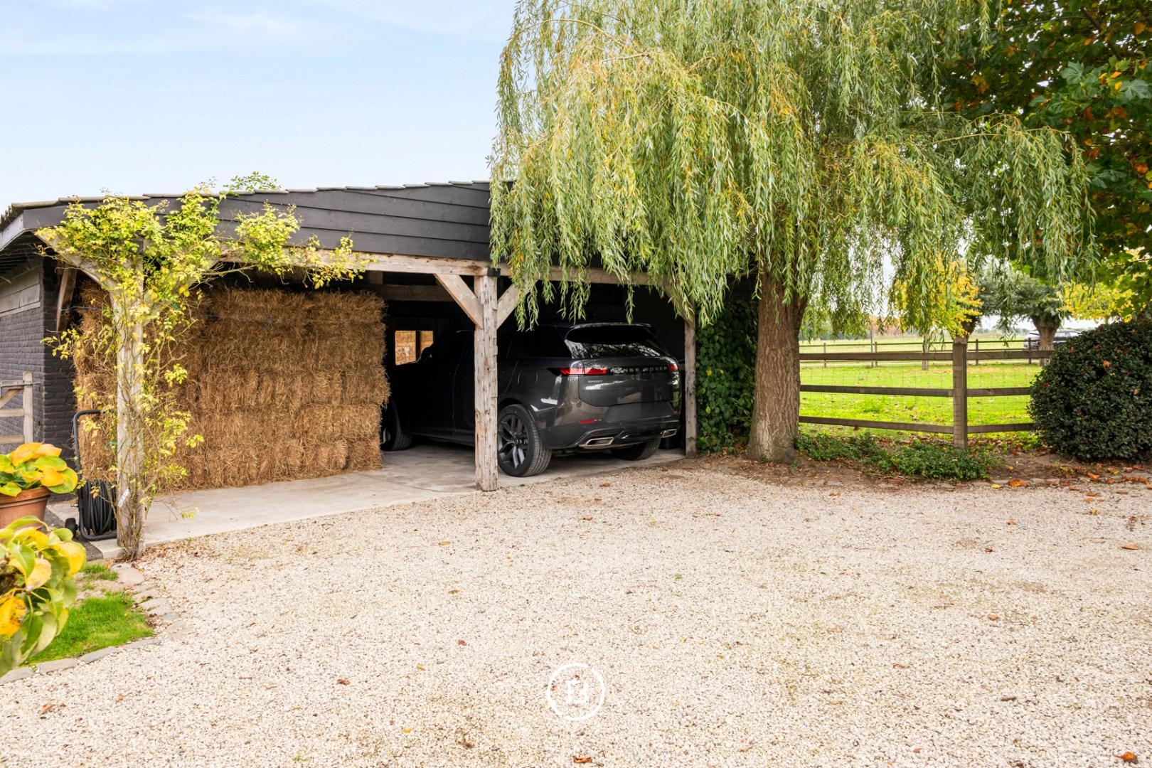 Ook buiten is deze eigendom een absolute topper. Het zwembad met aansluitend zonneterras aan de leefruimte nodigt uit tot lange zomerdagen, terwijl het overdekte terras aan het bijgebouw, ideaal als poolhouse, garant staat voor sfeervolle avonden. De fraai aangelegde tuin met buxusborders en volwassen bomen ademt rust en vakantie. Voor wie dieren houdt, zijn er omheinde weides met stallingen. Een dubbele carport maakt het plaatje compleet.