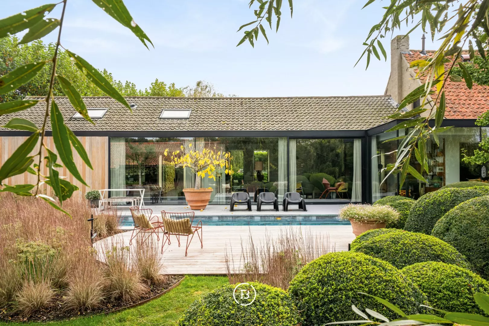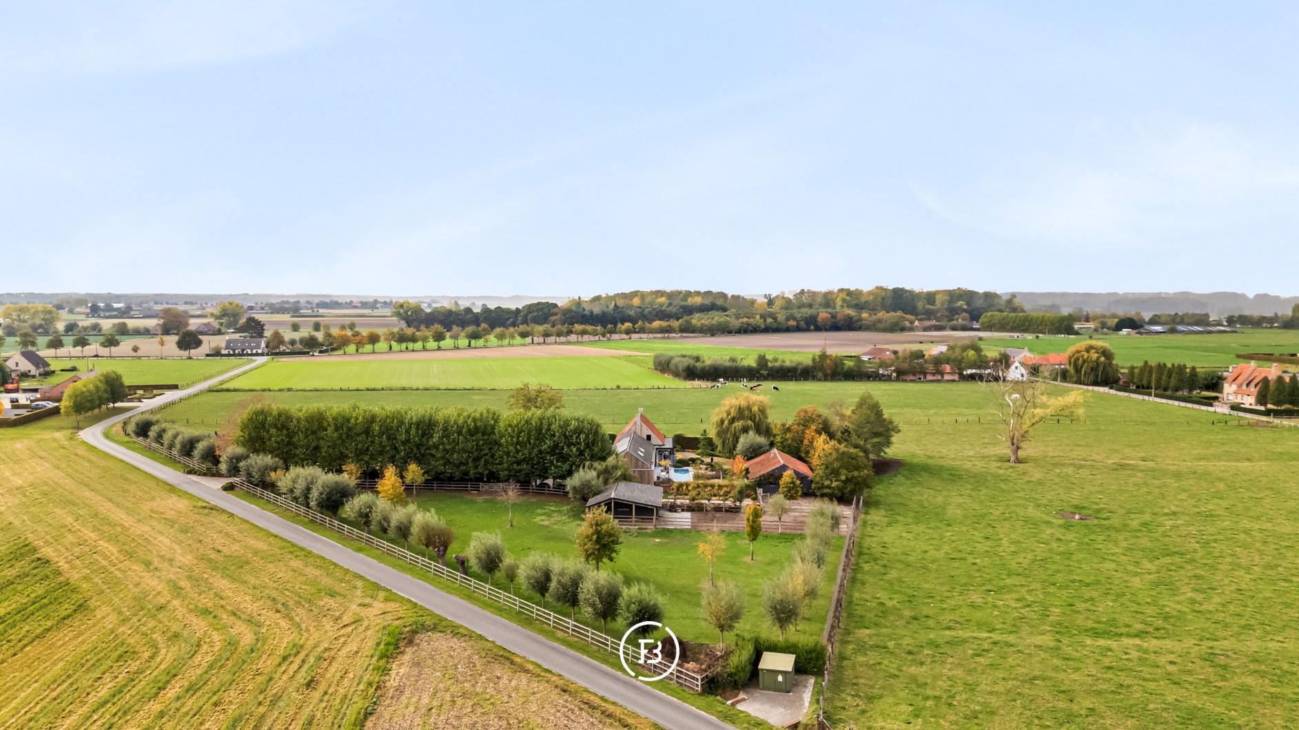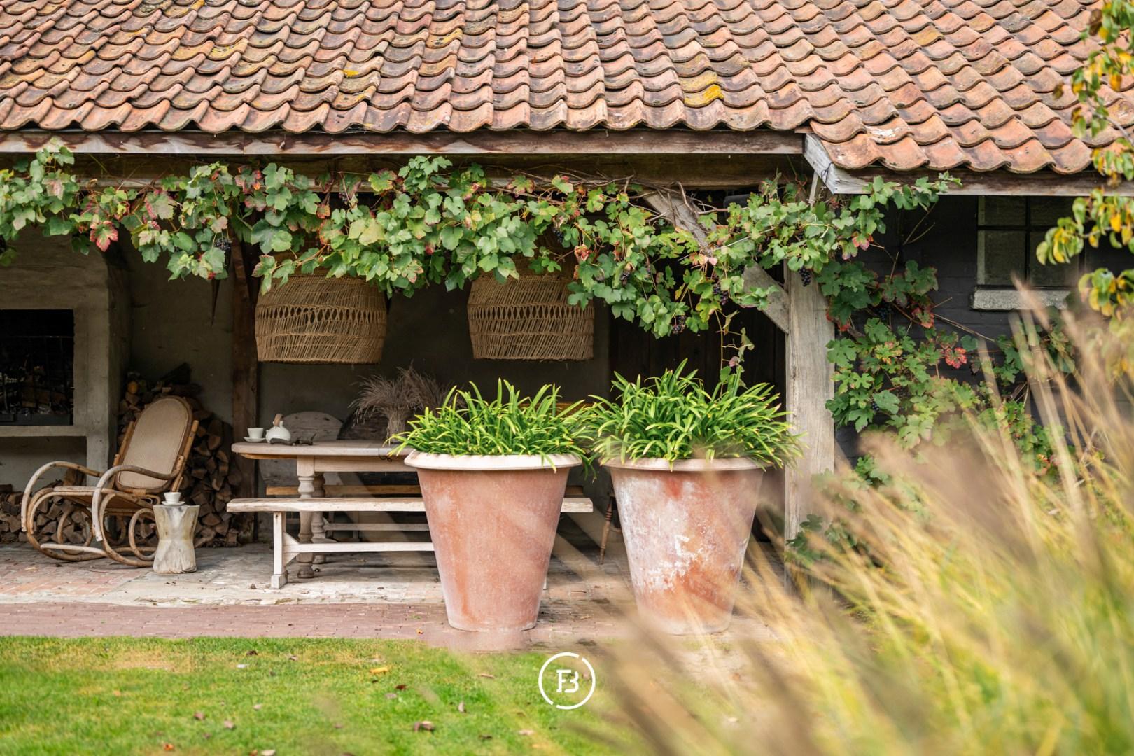 Ook buiten is deze eigendom een absolute topper. Het zwembad met aansluitend zonneterras aan de leefruimte nodigt uit tot lange zomerdagen, terwijl het overdekte terras aan het bijgebouw, ideaal als poolhouse, garant staat voor sfeervolle avonden. De fraai aangelegde tuin met buxusborders en volwassen bomen ademt rust en vakantie. Voor wie dieren houdt, zijn er omheinde weides met stallingen. Een dubbele carport maakt het plaatje compleet.
