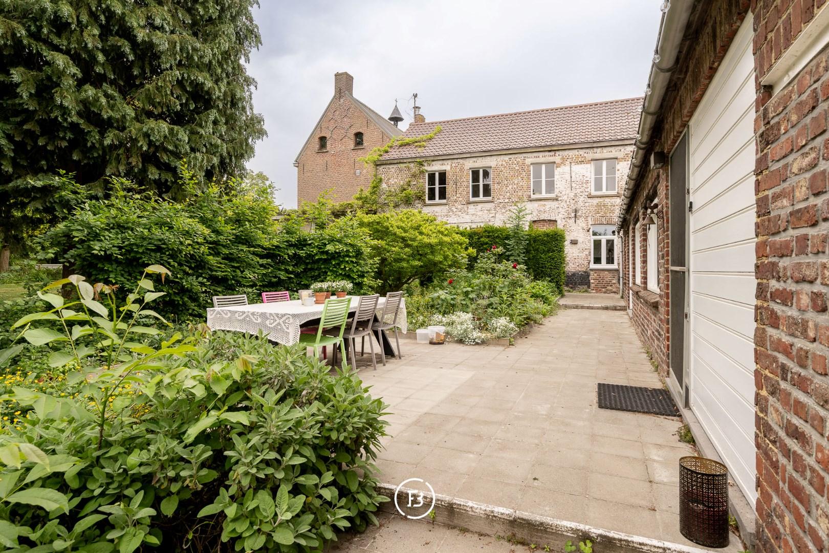 Deze voormalige herenhoeve bestaat uit een imposant dubbelhuis met vijf traveeën, kenmerkend voor de 18de-eeuwse plattelandsarchitectuur van de Vlaamse Ardennen. Bij het betreden van de woning word je verwelkomd in een ruime inkomhal met marmeren vloer. Aan weerszijden bevinden zich twee stijlvolle salons met hoge plafonds, monumentale schouwen en schilderingen op doek die de historische sfeer versterken.