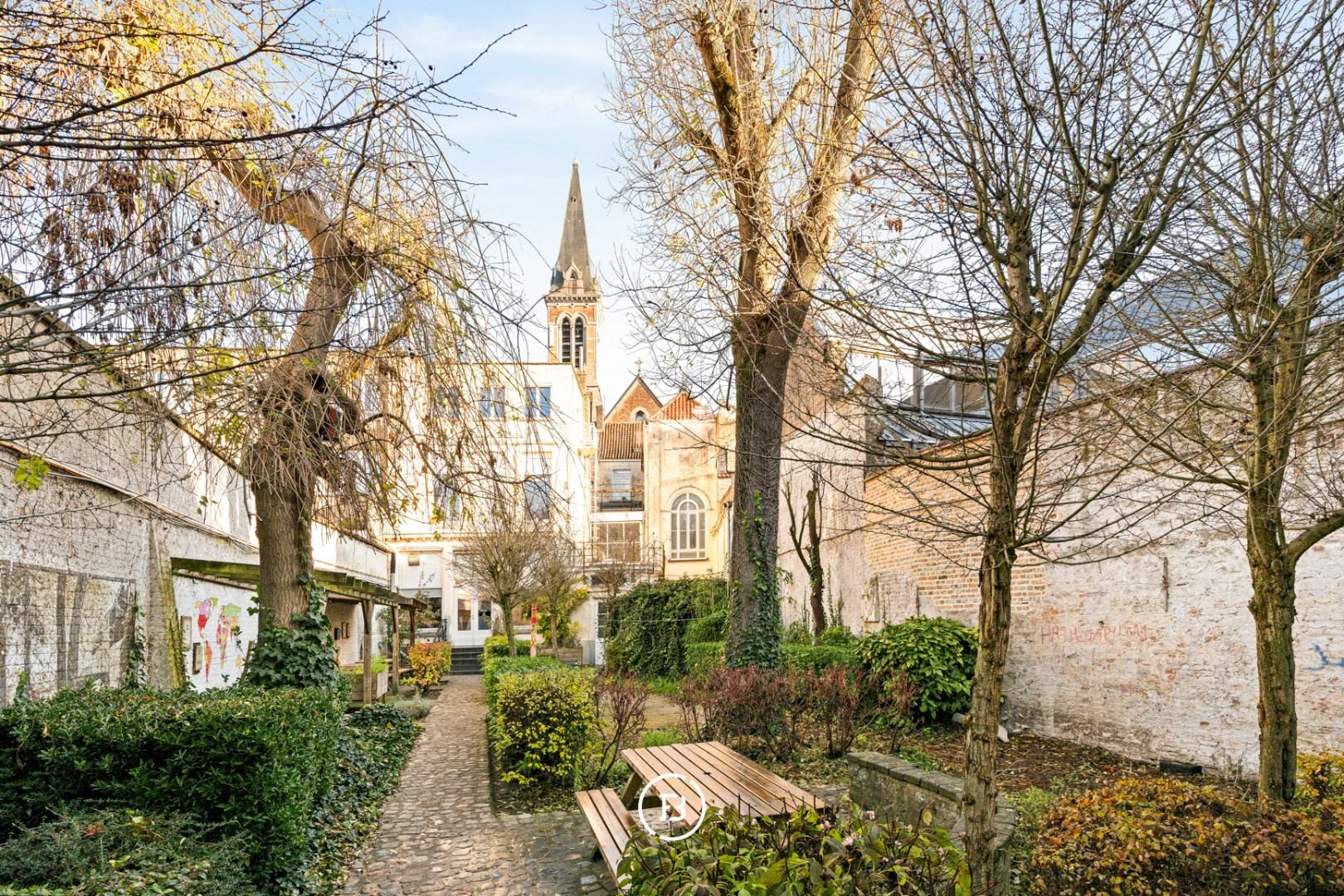 Achteraan het perceel bevindt zich het karaktervolle koetshuis van 115 vierkante meter, bereikbaar via de koetsdoorgang die eenvoudig kan worden ingericht als parking voor meerdere wagens. Dit aparte gebouw vormt een bijkomende troef, met potentieel voor gastenverblijf, atelier of kantoor.