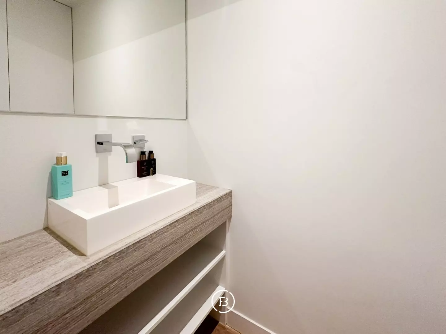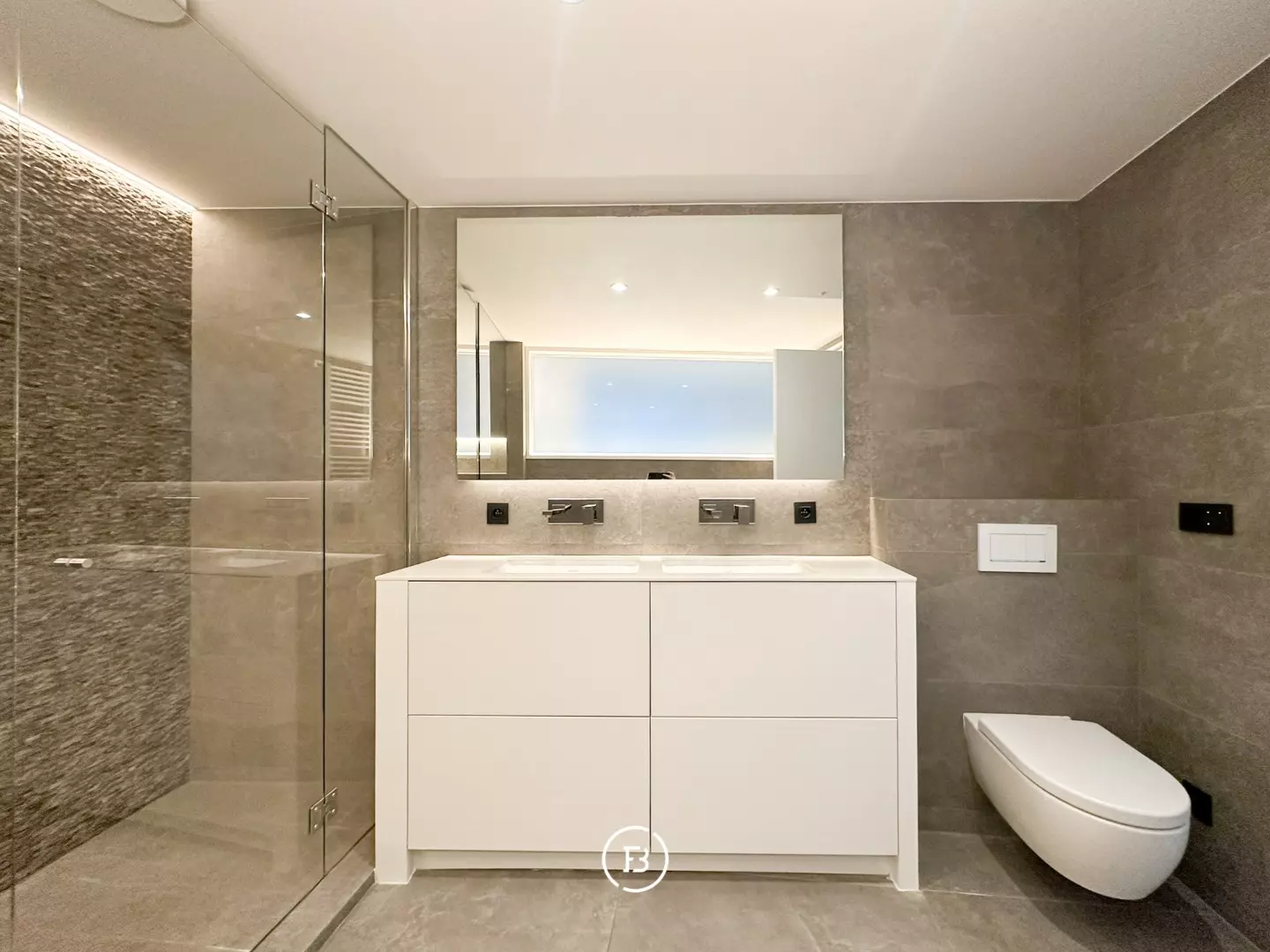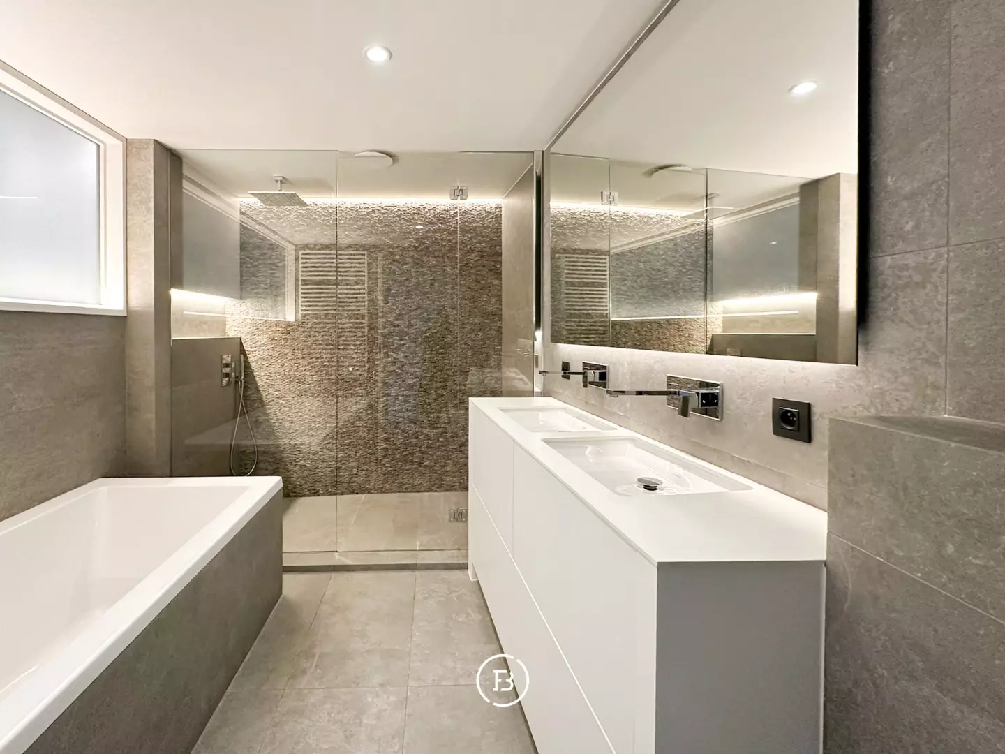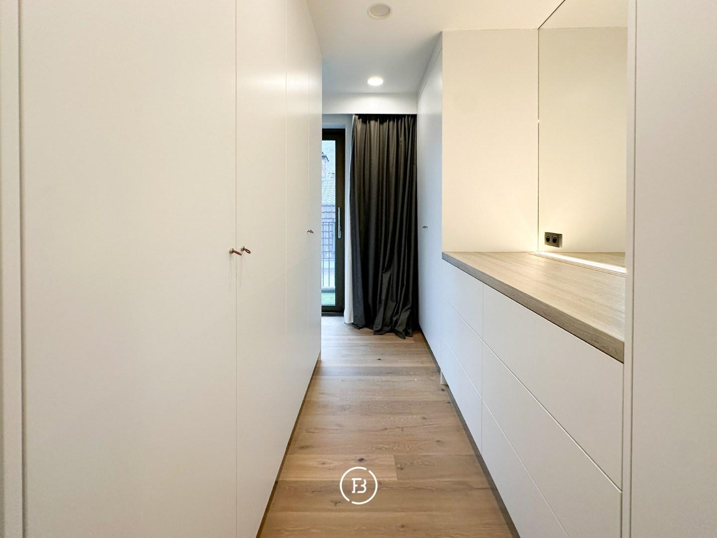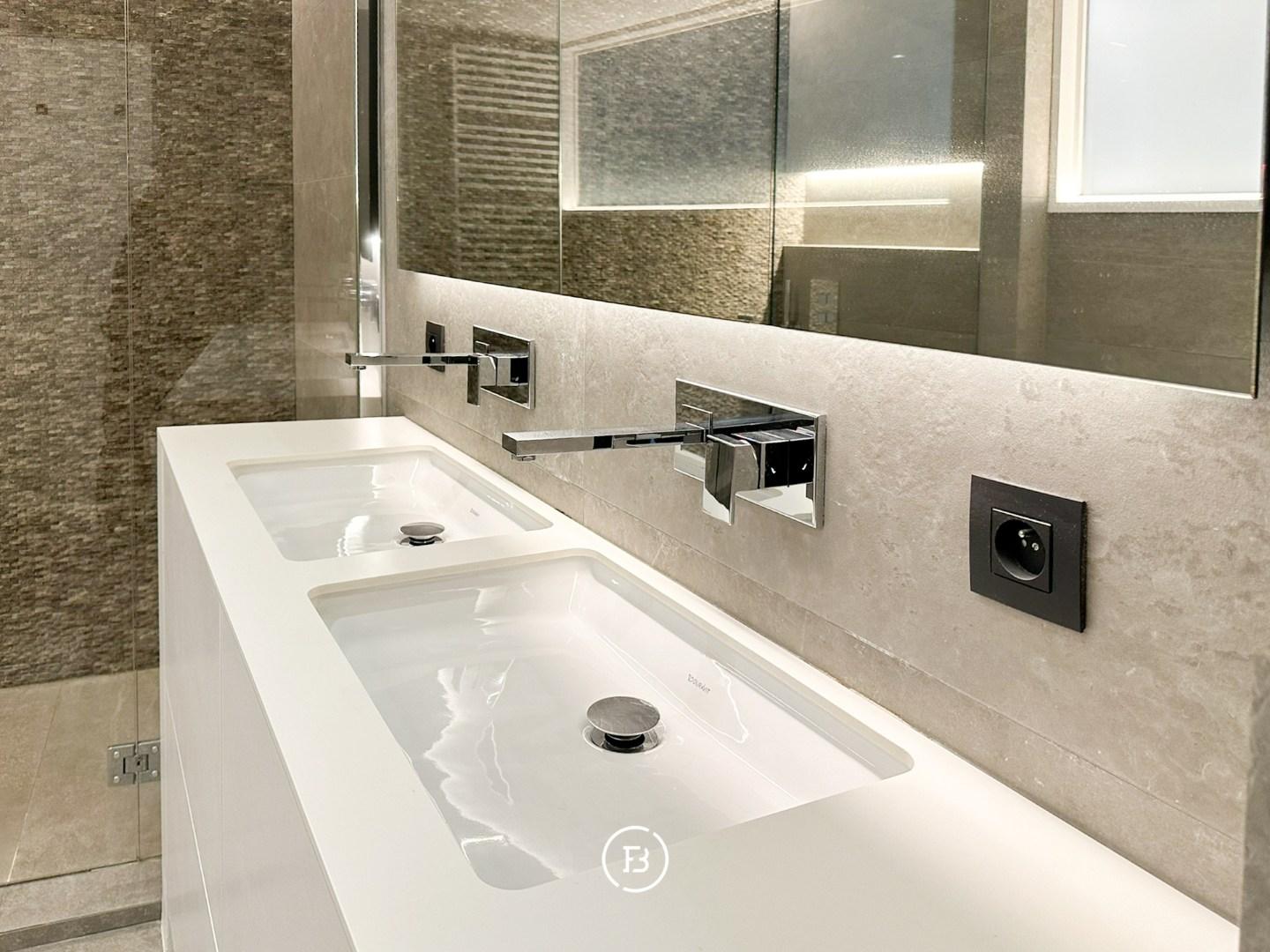 De ruime slaapkamer met dressing geeft toegang tot een gezellig terrasje en beschikt over een ensuite badkamer met dubbele lavabo, ligbad, douche en toilet.