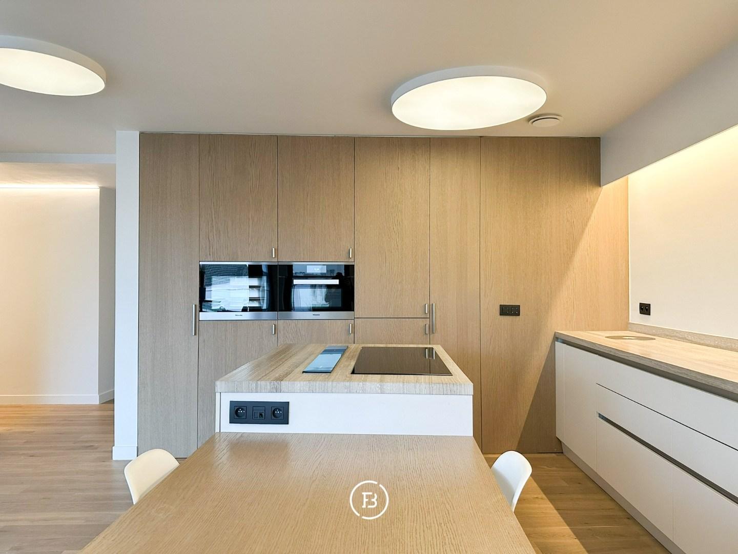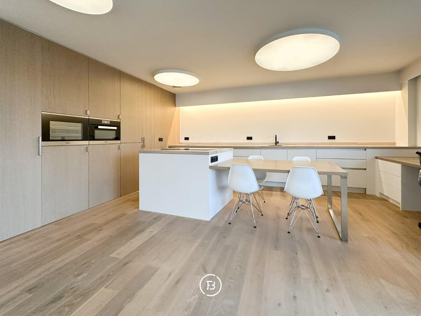 De ruime leef- en eetruimte met grote raampartijen zorgt voor een overvloed aan natuurlijk licht en een aangenaam gevoel van openheid. Deze ruimte vormt een harmonieus geheel met de volledig uitgeruste open keuken.