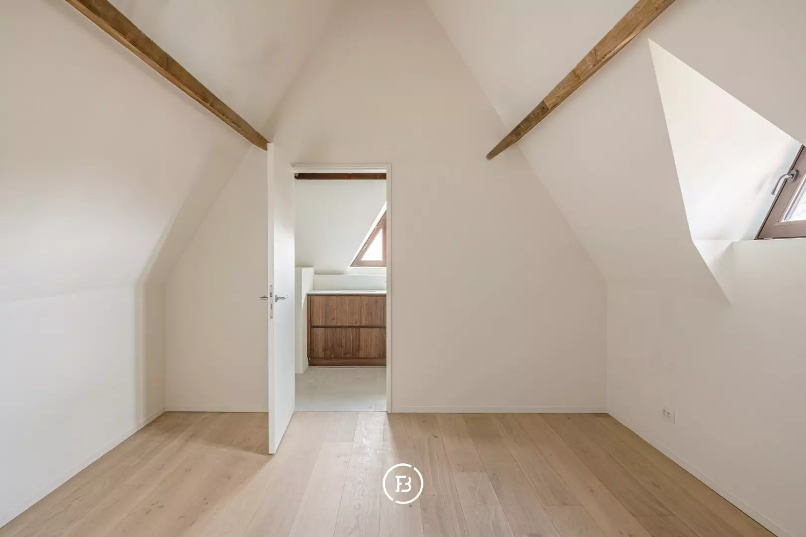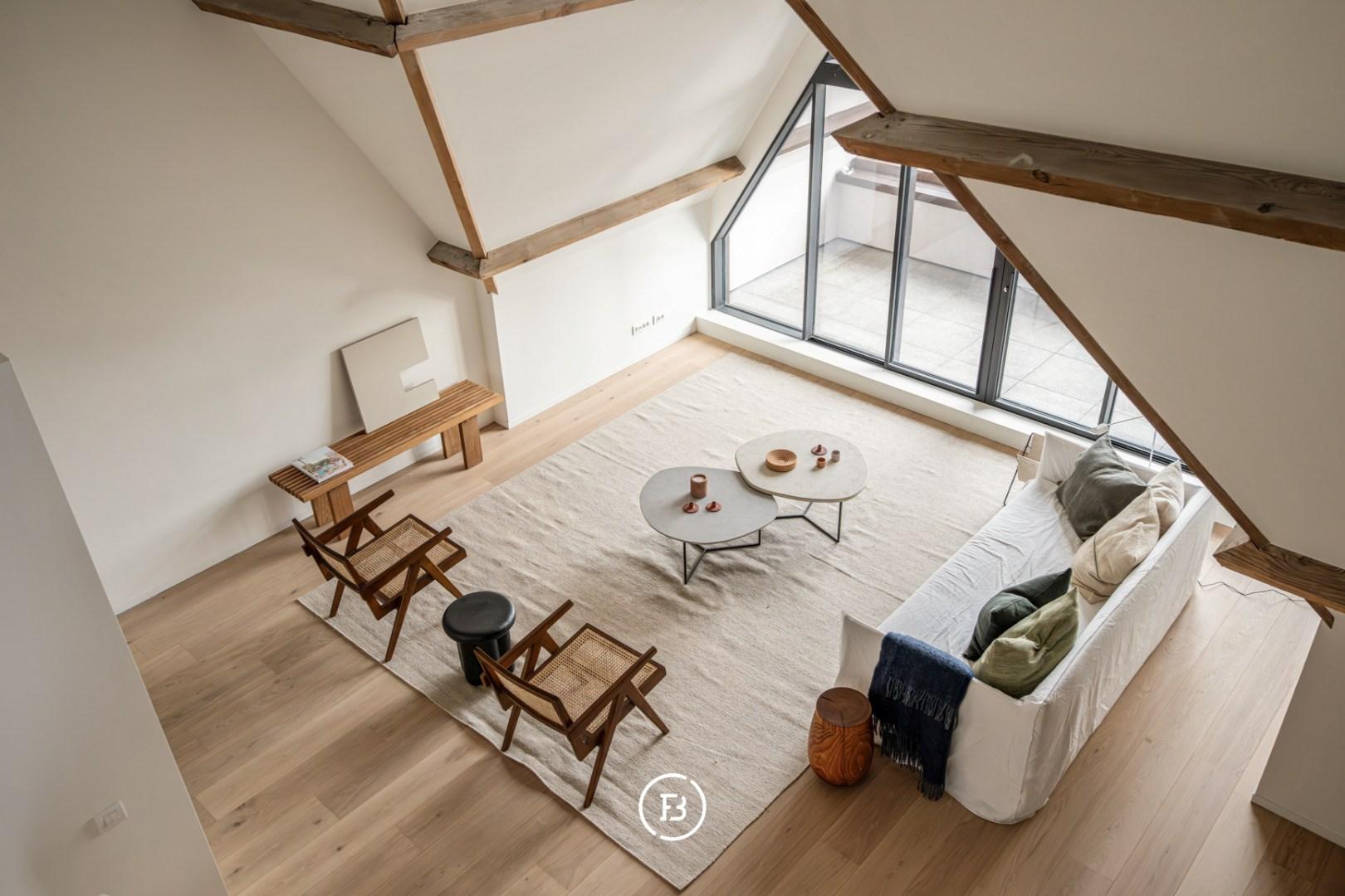 De lichtrijke leefruimte met open keuken en aparte berging vormt het hart van het appartement en vloeit naadloos over in het omliggende park. Op het gelijkvloers bevindt zich één slaapkamer met ensuite badkamer, voorzien van een inloopdouche en dubbele lavabo. Een ruim, zuidgericht terras van 11 m² vervolledigt dit niveau.