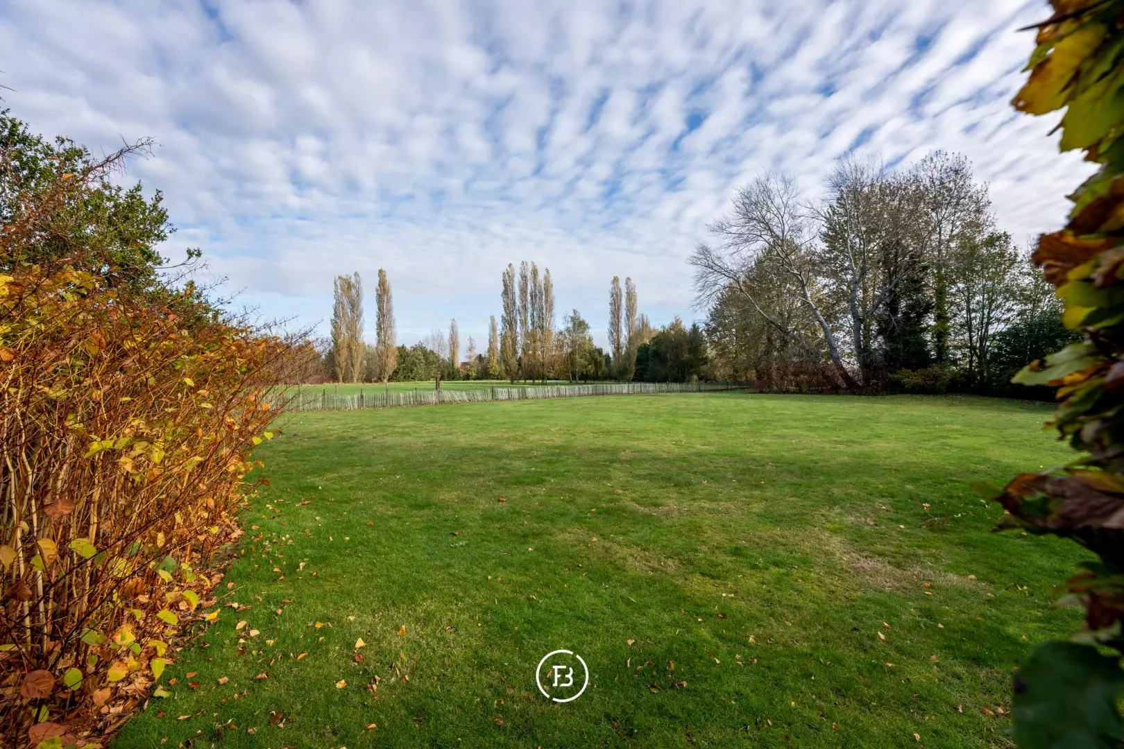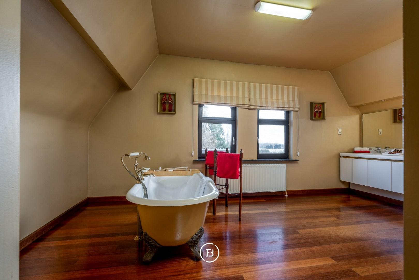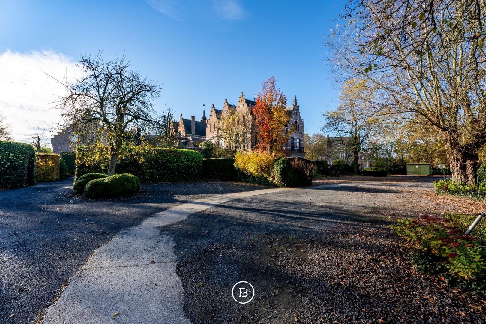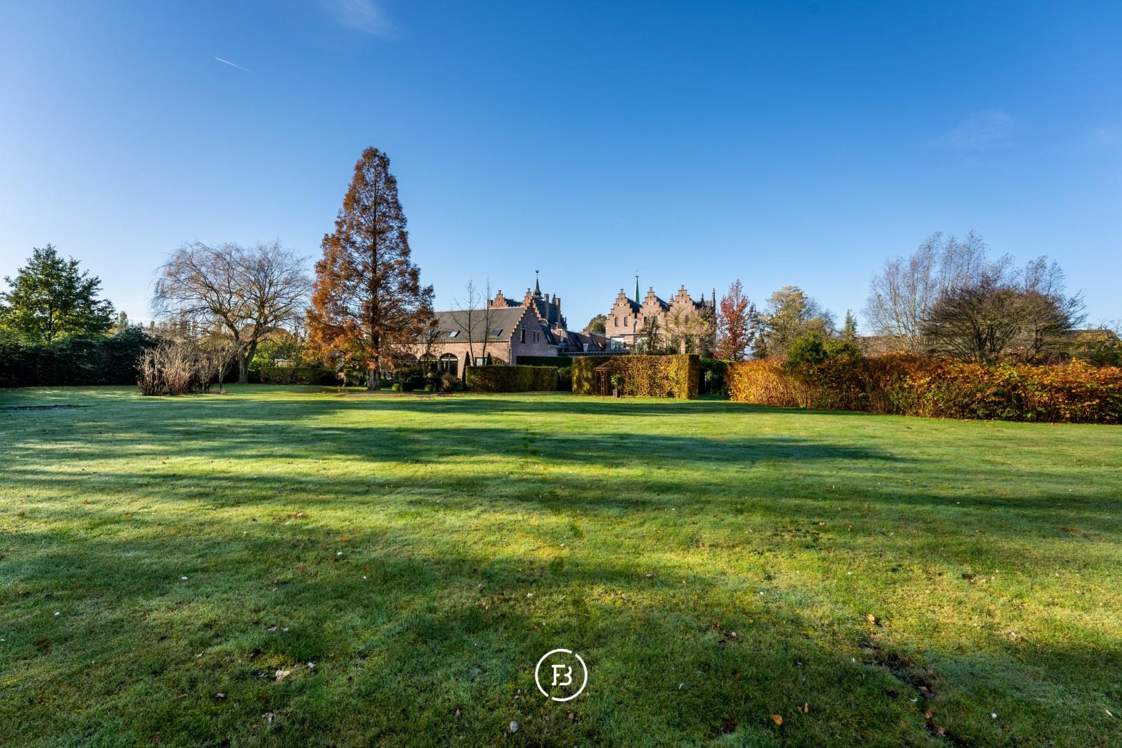 Rondom de eigendom strekt zich een parkachtige tuin uit die naadloos overgaat in omliggende weilanden — een setting die rust en ruimte ademt. Ook praktisch zit je hier goed: er is vlot plaats voor een 100-tal wagens, zonder in te boeten aan het groene karakter.
