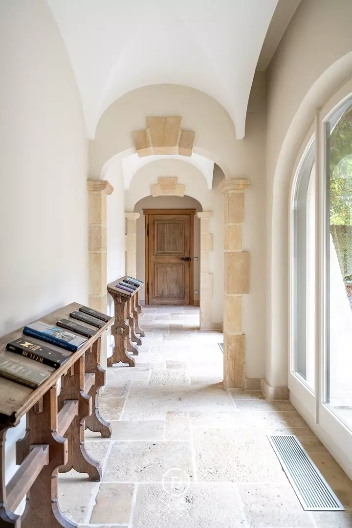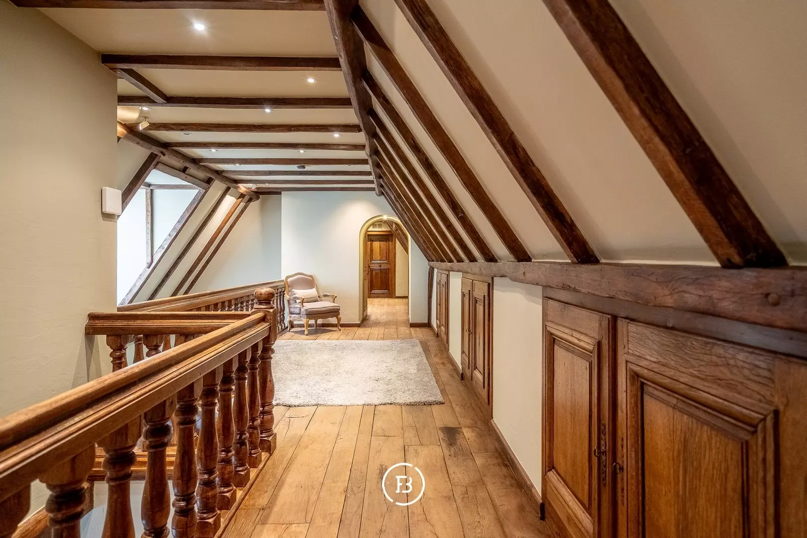 Bij het binnenkomen word je meteen ondergedompeld in charme: een sfeervolle kloostergang leidt naar de indrukwekkende leefruimte met open haard – een warme, uitnodigende plek voor gezellige familiemomenten of stijlvolle ontvangsten. Aansluitend vind je de eetkamer en de orangerie, telkens met een prachtig zicht op de fraai aangelegde tuin.