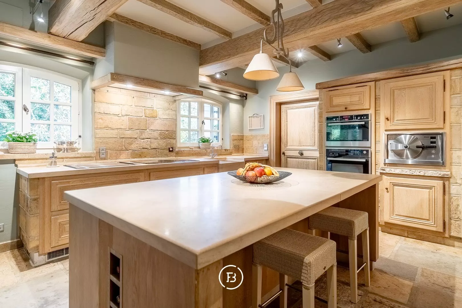 De landelijke keuken is een waar genot voor elke kookliefhebber: volledig uitgerust en met oog voor detail afgewerkt. Daarnaast zorgen praktische ruimtes zoals een wasplaats, wijn- en voorraadkelder en technische berging voor optimaal comfort.