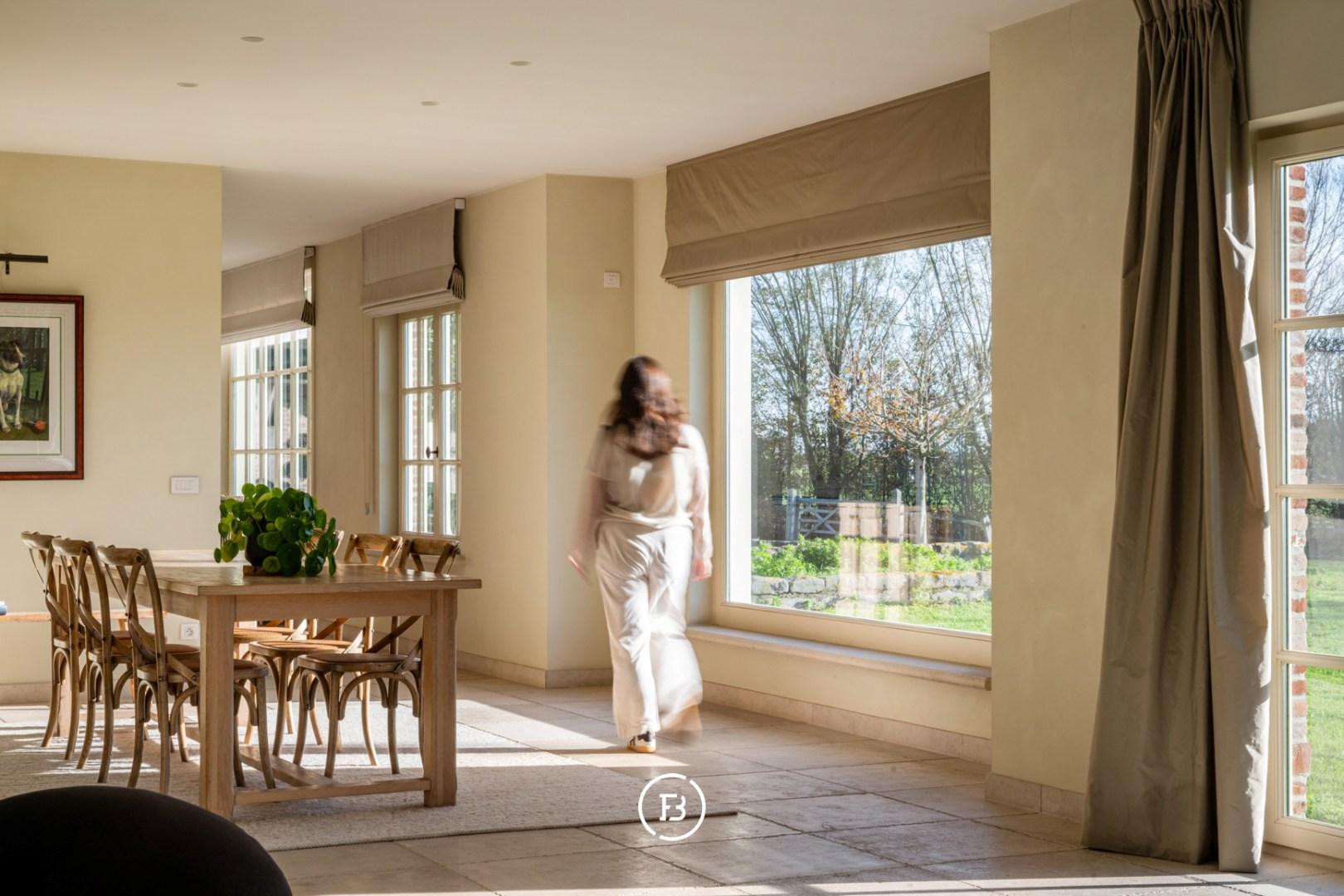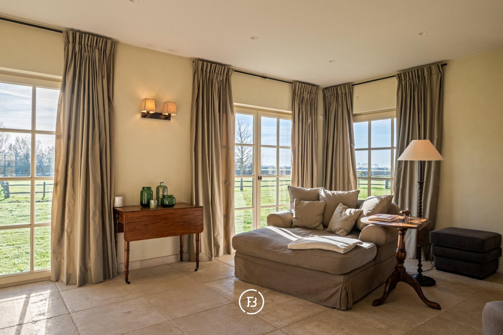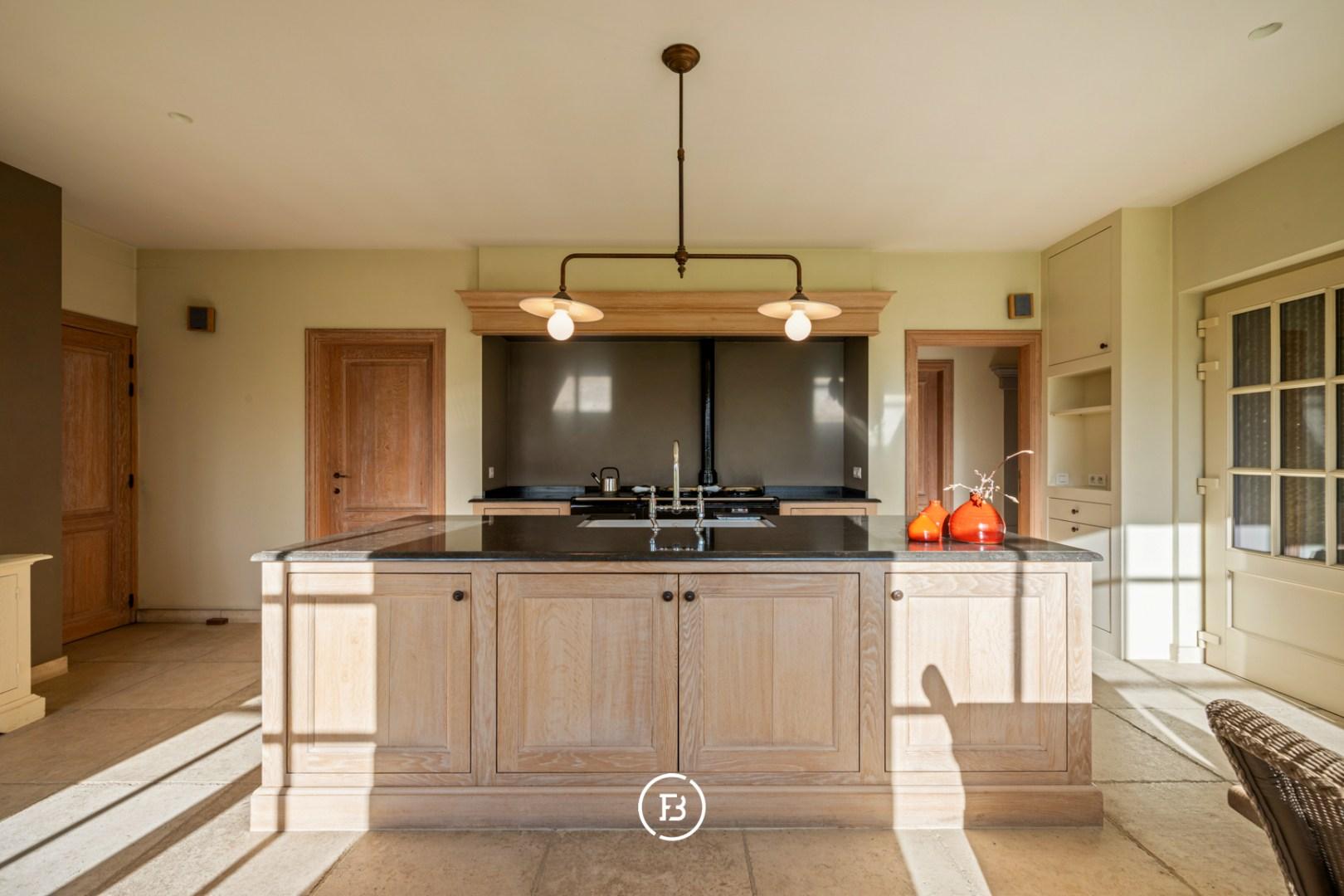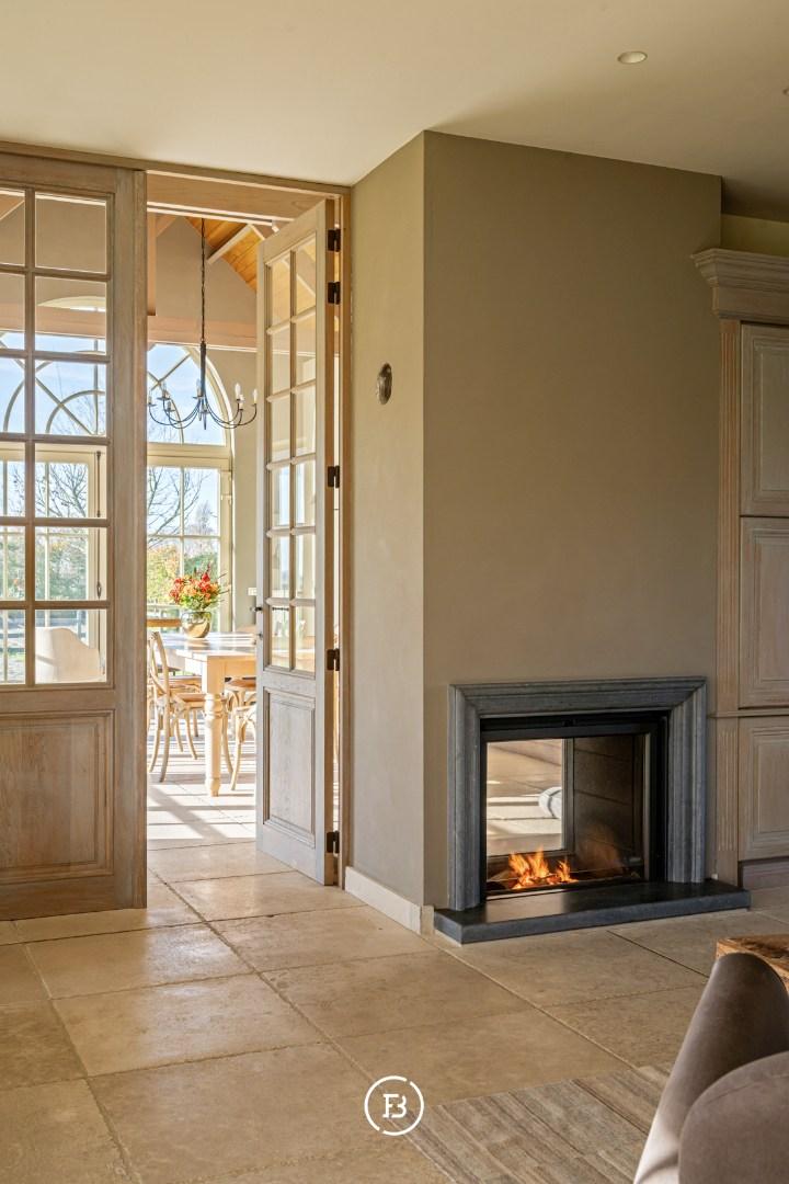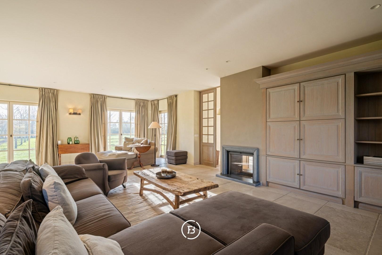 De ruime inkomhal met vestiaire en gastentoilet leidt naar de sfeervolle living met eetplaats afgewerkt met stijlvol maatwerk en een gezellige houthaard. Aansluitend bevindt zich de orangerie/bibliotheek waar u geniet van prachtige vergezichten. De leefruimte grenst aan de landelijke keuken met AGA-fornuis. Al deze lichtrijke ruimtes staan in mooi contact met de tuin en omgeving. Verder vinden we op deze verdieping de ruime bureauruimte met houtkachel, een praktische berging en een ruime inpandige garage. De bovenverdieping biedt ruimte voor de master bedroom met ensuite dressing, 3 ruime slaapkamers, aparte dressing en 3 badkamers.