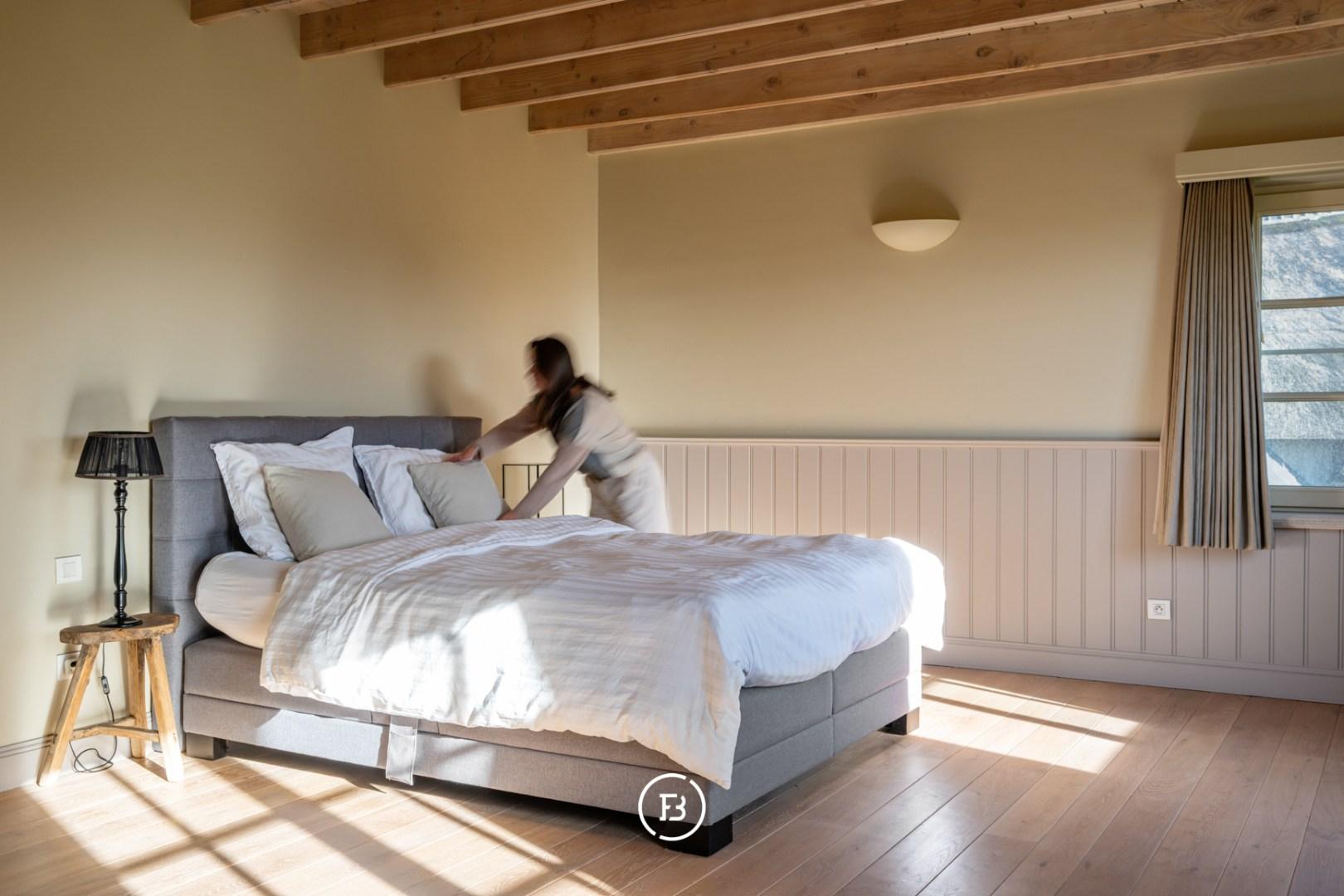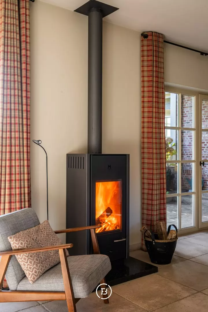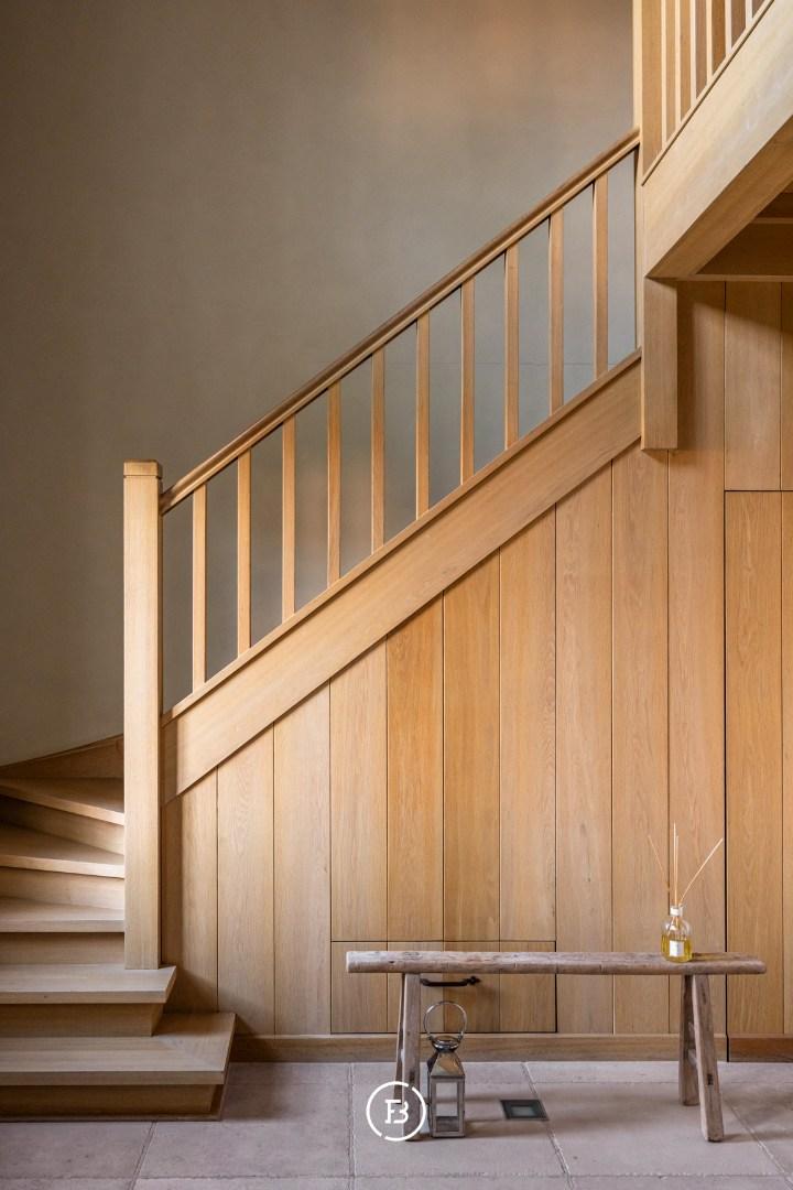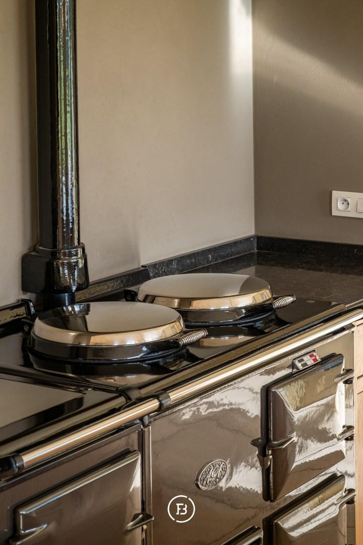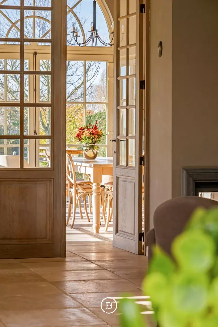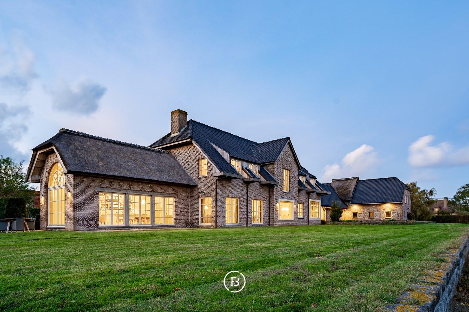 De ruime inkomhal met vestiaire en gastentoilet leidt naar de sfeervolle living met eetplaats afgewerkt met stijlvol maatwerk en een gezellige houthaard. Aansluitend bevindt zich de orangerie/bibliotheek waar u geniet van prachtige vergezichten. De leefruimte grenst aan de landelijke keuken met AGA-fornuis. Al deze lichtrijke ruimtes staan in mooi contact met de tuin en omgeving. Verder vinden we op deze verdieping de ruime bureauruimte met houtkachel, een praktische berging en een ruime inpandige garage. De bovenverdieping biedt ruimte voor de master bedroom met ensuite dressing, 3 ruime slaapkamers, aparte dressing en 3 badkamers.