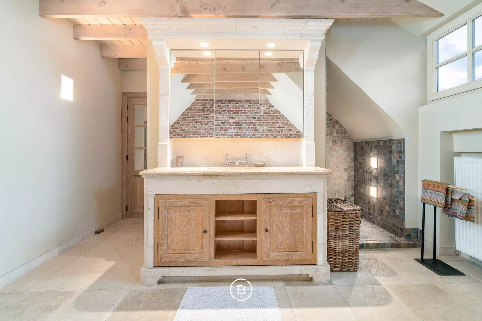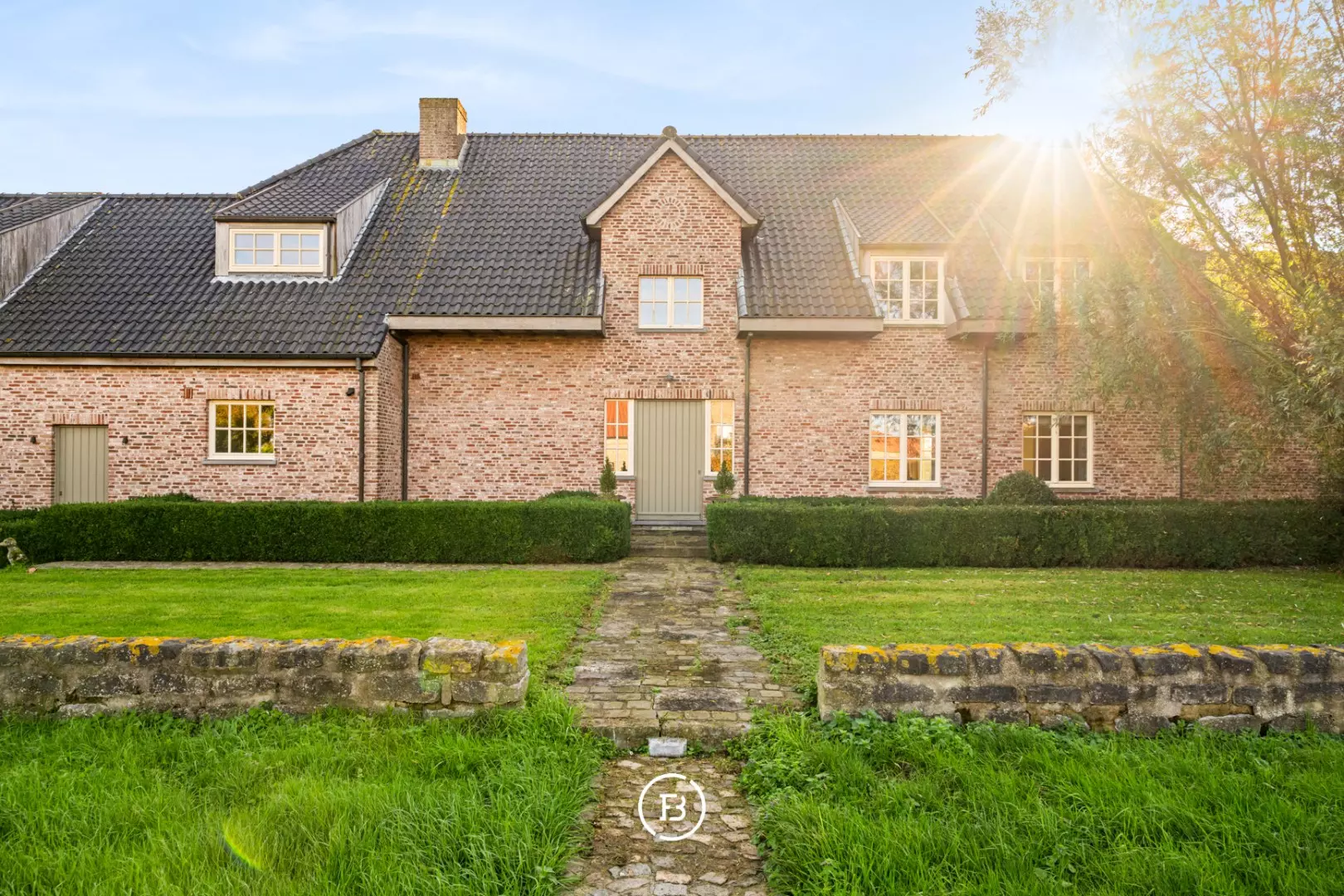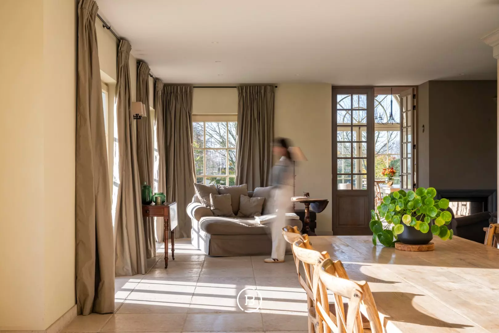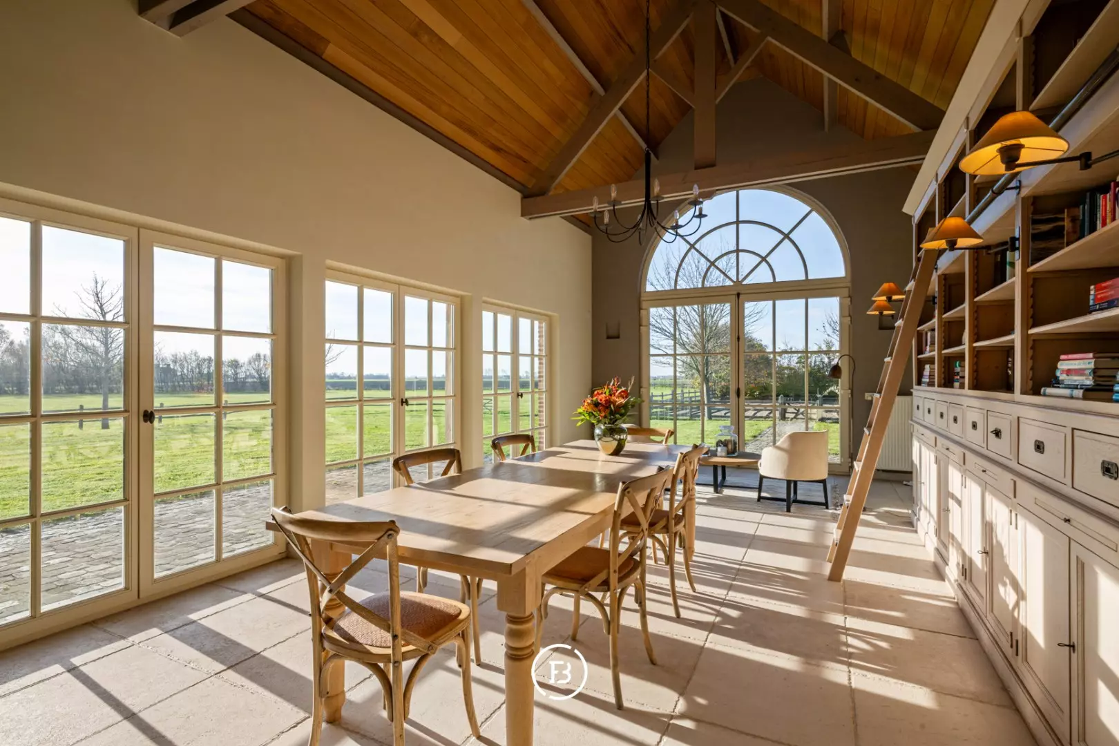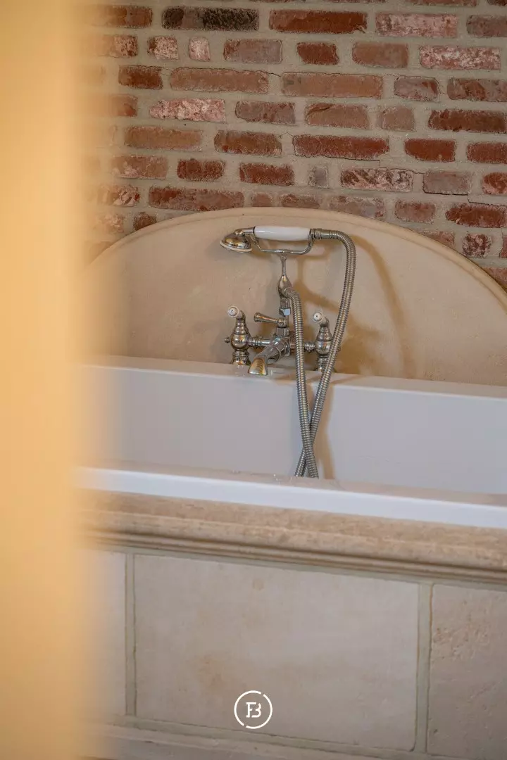 De ruime inkomhal met vestiaire en gastentoilet leidt naar de sfeervolle living met eetplaats afgewerkt met stijlvol maatwerk en een gezellige houthaard. Aansluitend bevindt zich de orangerie/bibliotheek waar u geniet van prachtige vergezichten. De leefruimte grenst aan de landelijke keuken met AGA-fornuis. Al deze lichtrijke ruimtes staan in mooi contact met de tuin en omgeving. Verder vinden we op deze verdieping de ruime bureauruimte met houtkachel, een praktische berging en een ruime inpandige garage. De bovenverdieping biedt ruimte voor de master bedroom met ensuite dressing, 3 ruime slaapkamers, aparte dressing en 3 badkamers.