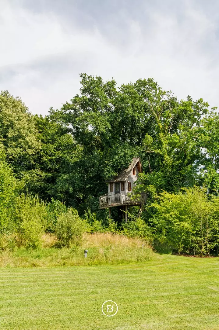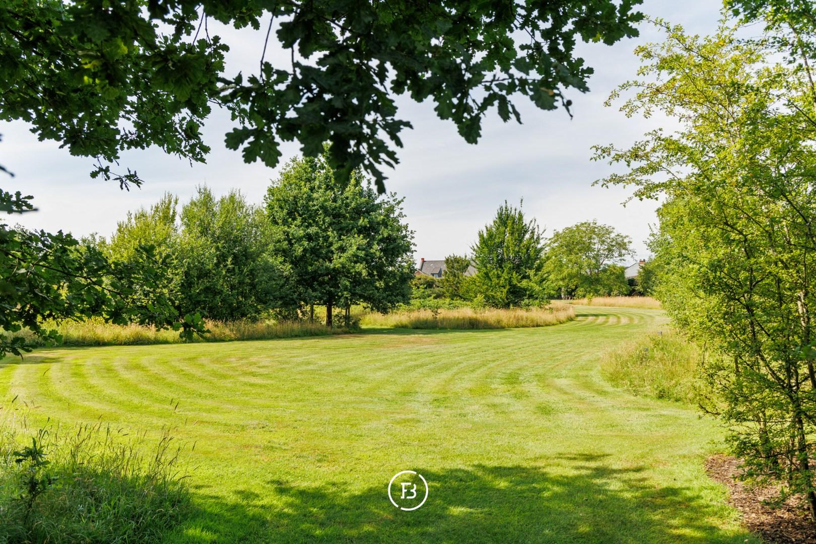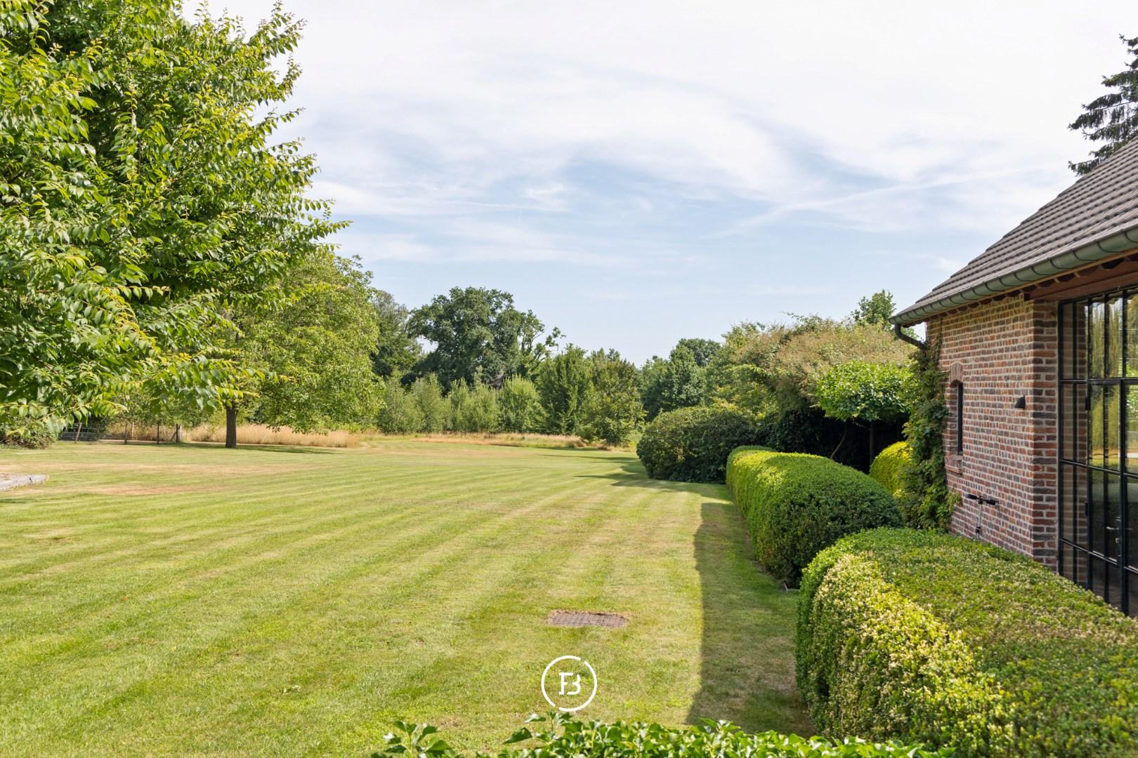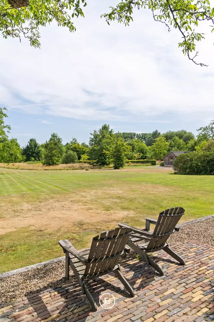 Weids uitzicht over de eigen parktuin van bijna anderhalve hectare met volwassen bomen, een boomhut en een discreet achterliggend uitweggetje.