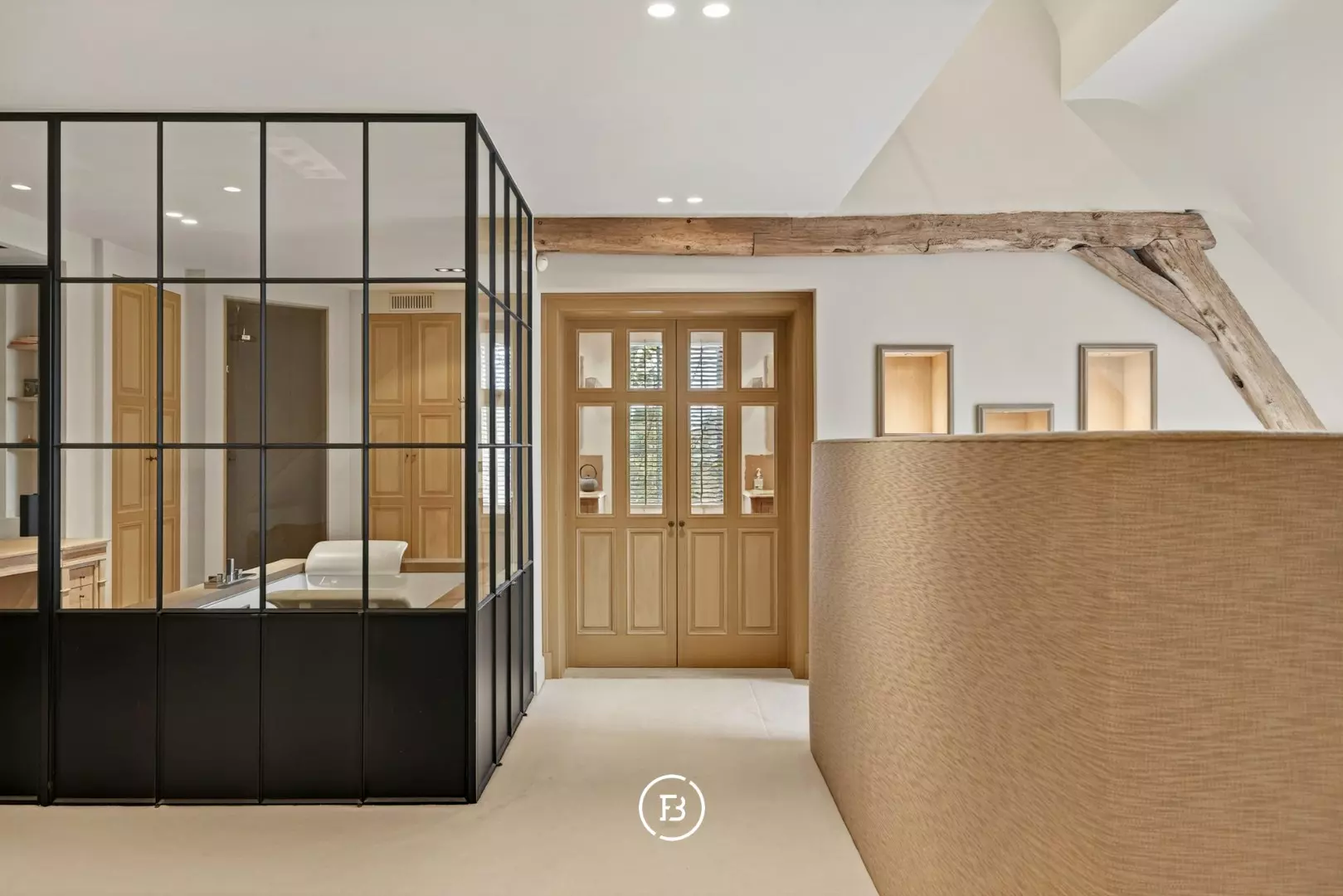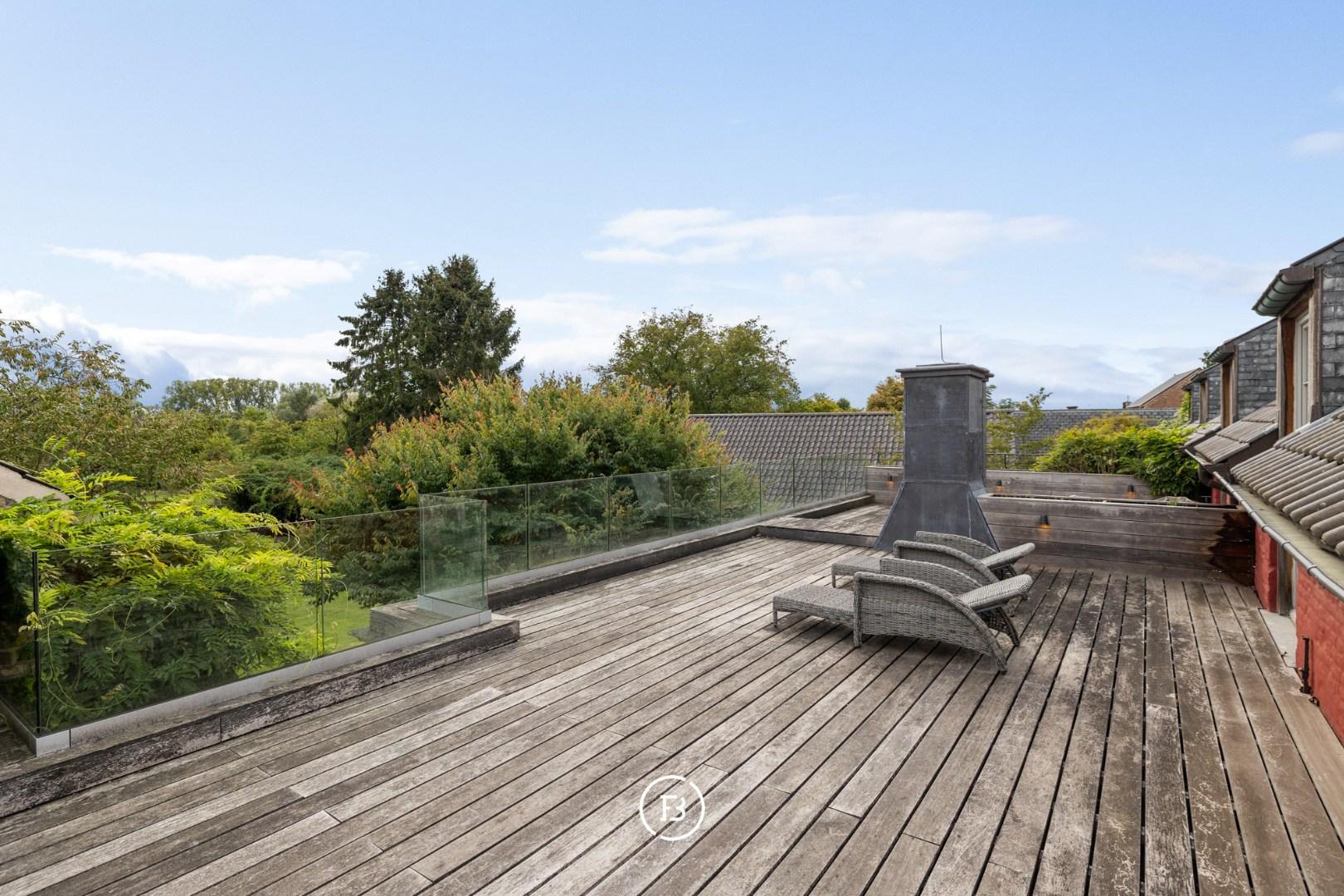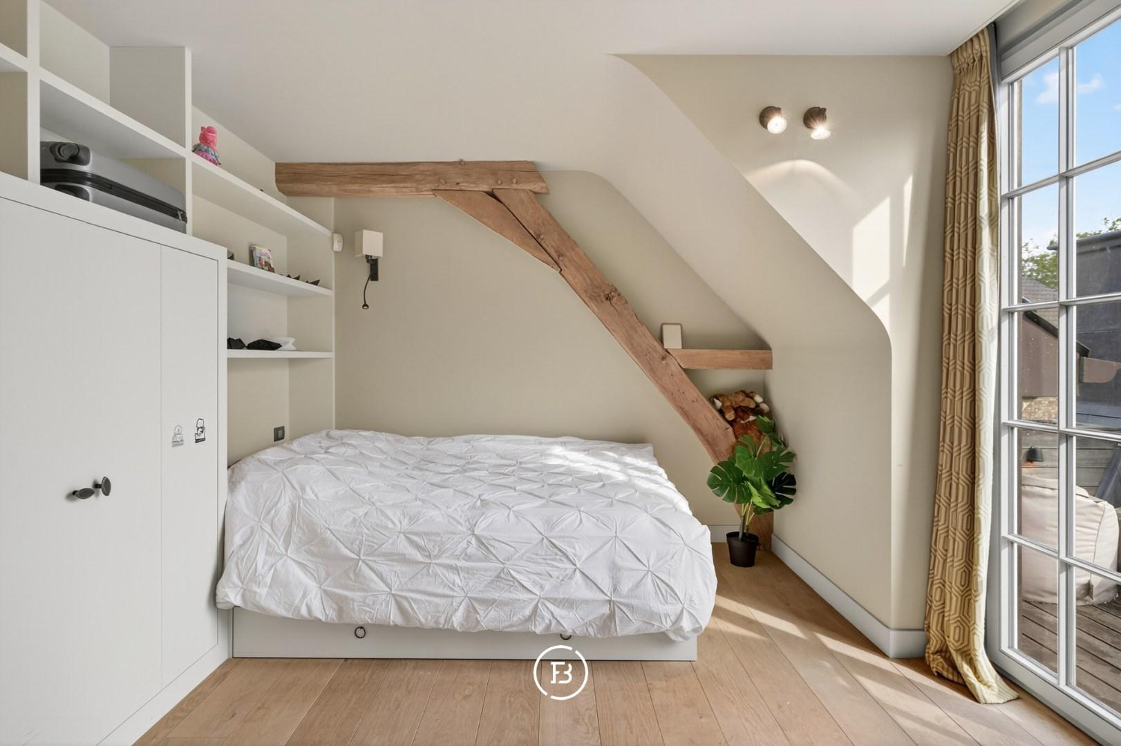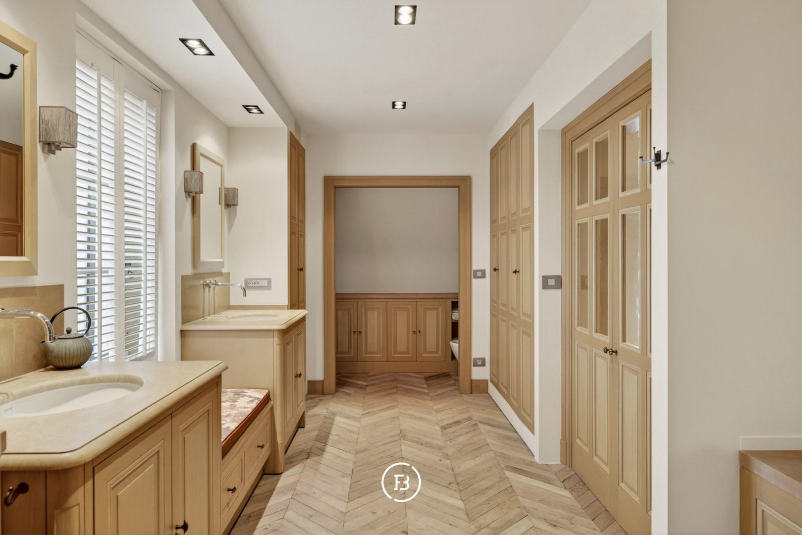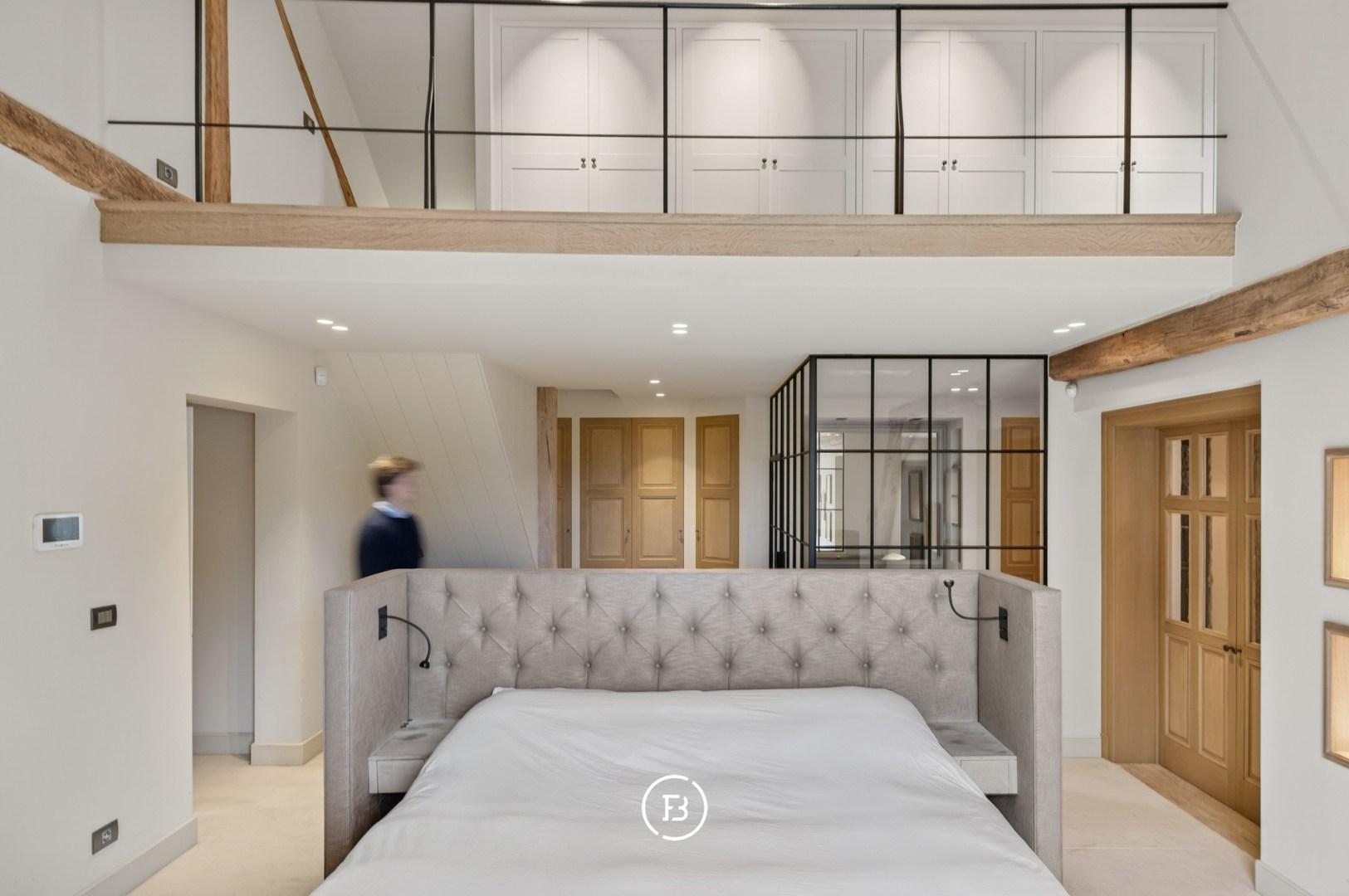 De master suite, met zijn imposante dakgebinte, dressing en ensuite luxe badkamer, heeft een ruime oppervlakte van 70 m². Hier is ook een toegang tot een apart terras met weids uitzicht over de eigen parktuin van bijna anderhalve hectare met volwassen bomen, een boomhut en een discreet achterliggend uitweggetje.