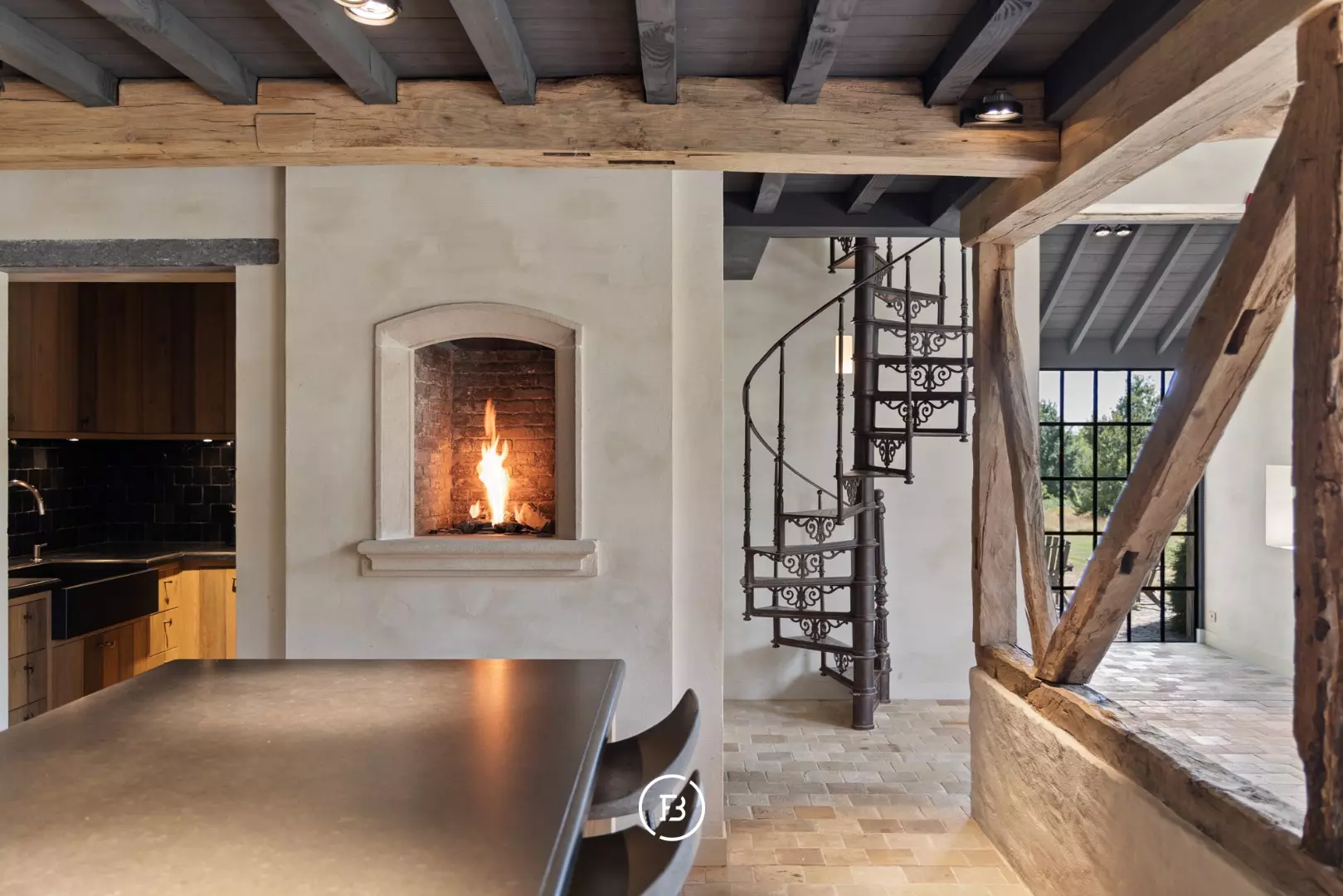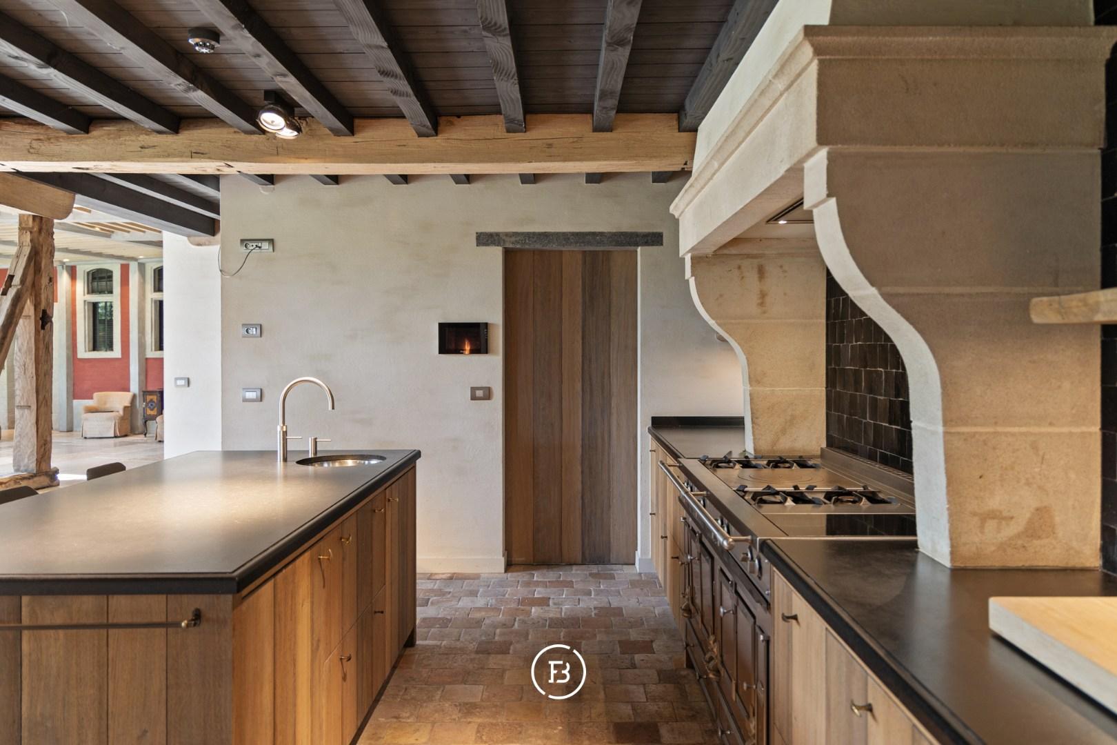 Het hart van de woning is de leefkeuken, waar een imposant La Cornue fornuis de toon zet. Het op maat gemaakte eikenhouten meubilair met zijn zachte, afgeronde hoeken vloeit naadloos over in de omliggende eet- en tuinkamers.
