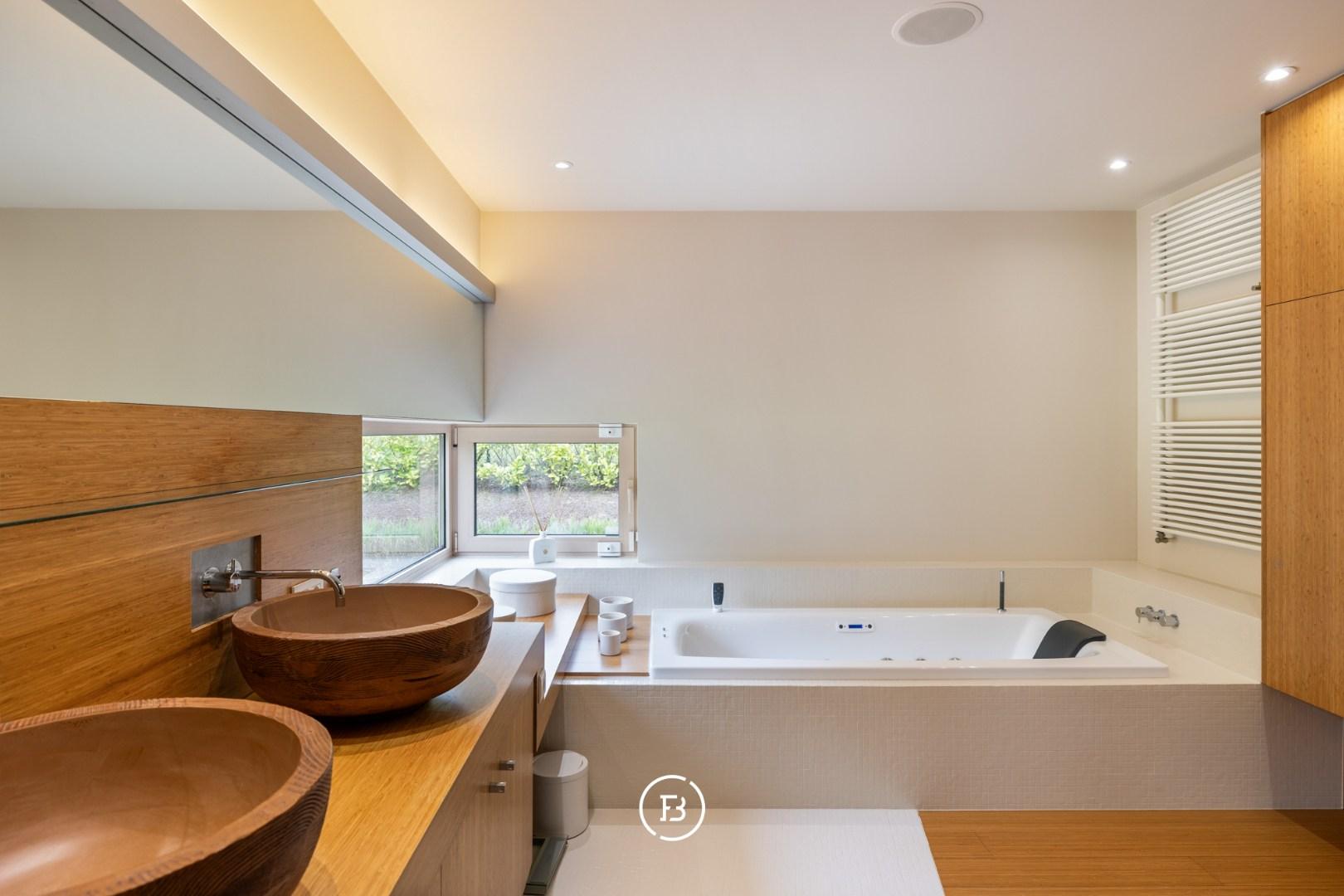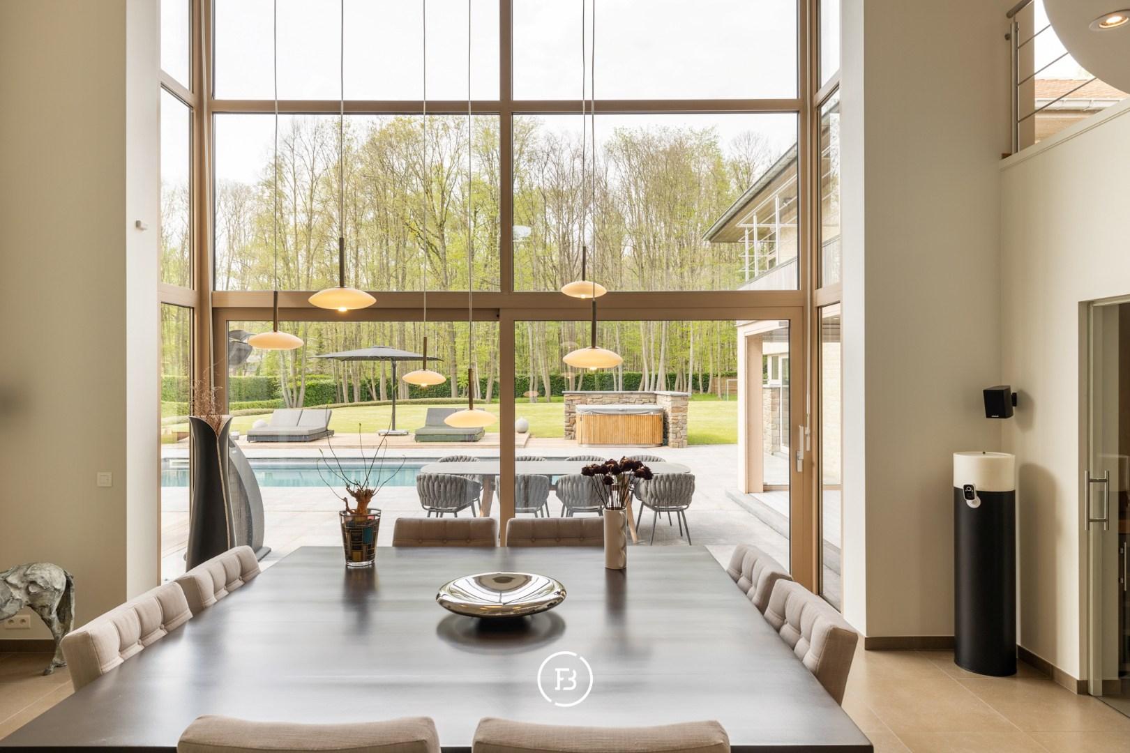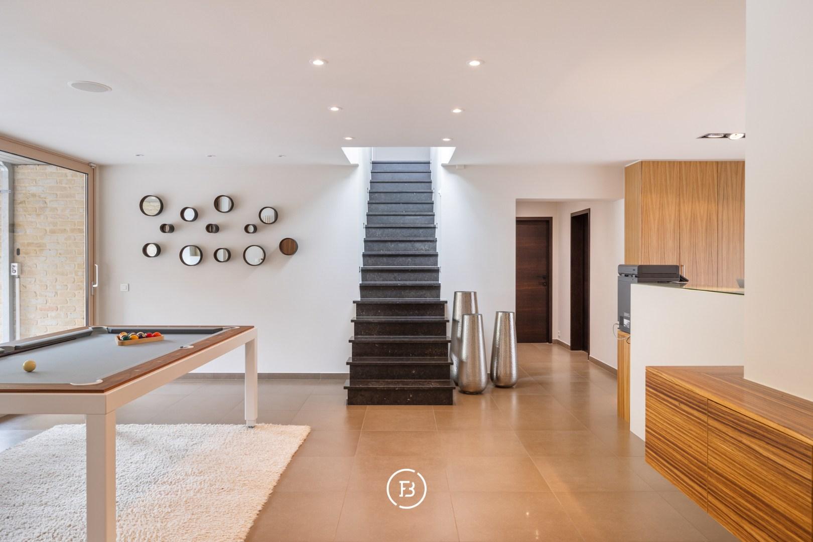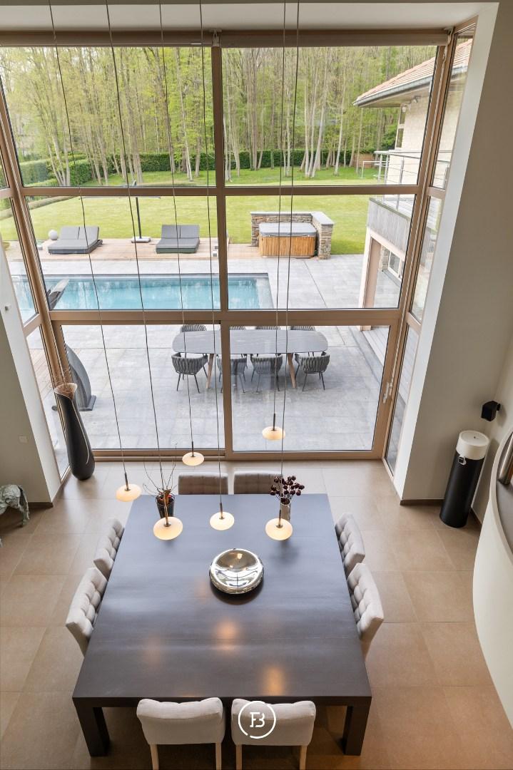 De villa is als volgt ingedeeld: op het gelijkvloers vindt u een royale inkomhal, dubbele garage, technische ruimte en berging, gastentoilet, volledig uitgeruste keuken en een lichtrijke leefruimte met zitput en openhaard en een klimaatgeregelde wijnkamer, een bureau en een master suite met ensuite badkamer en dressing. Verder beschikt de woning over een inpandig poolhouse met keuken en een tweede salon.