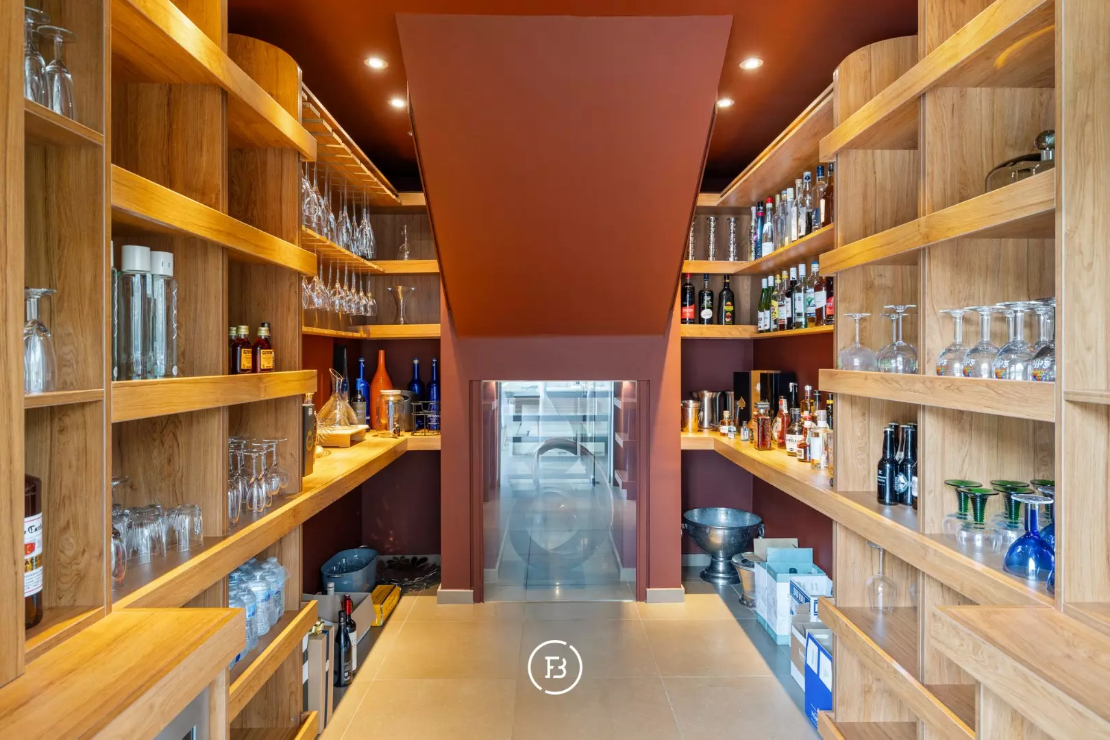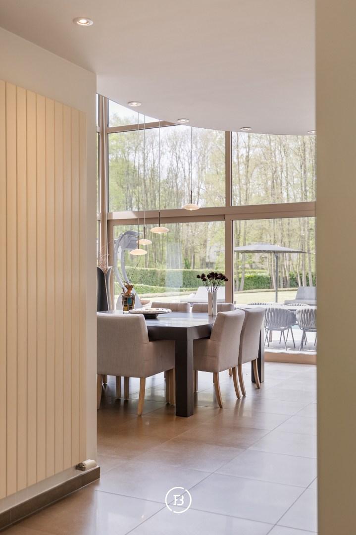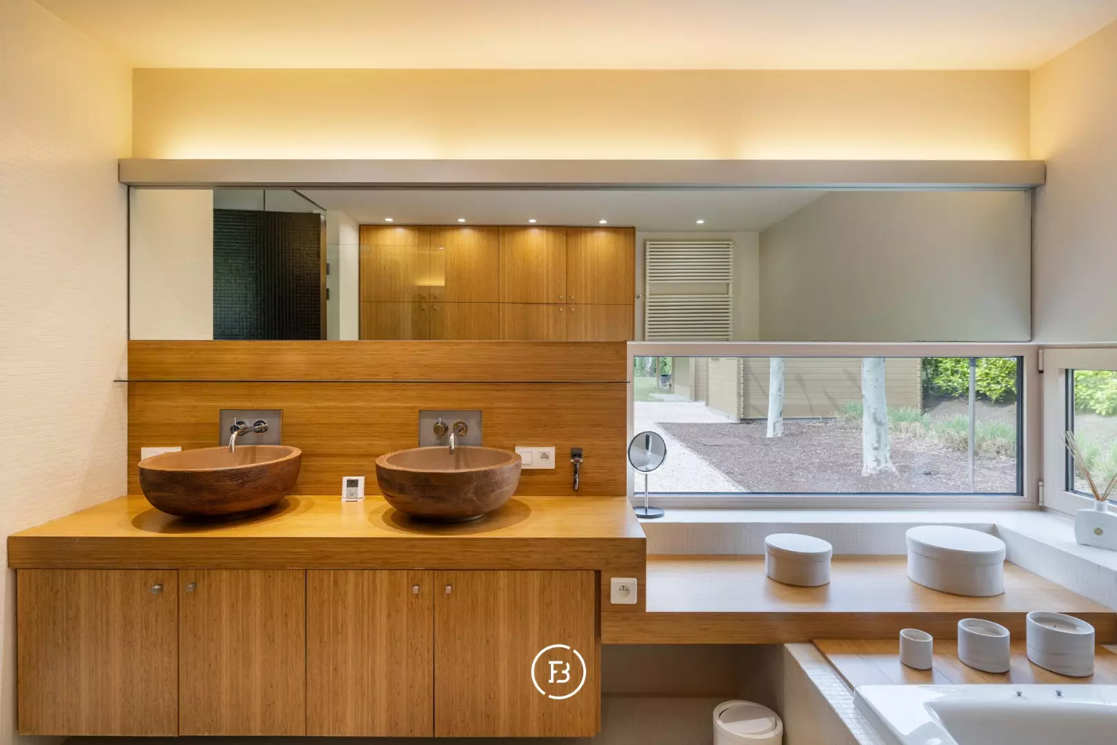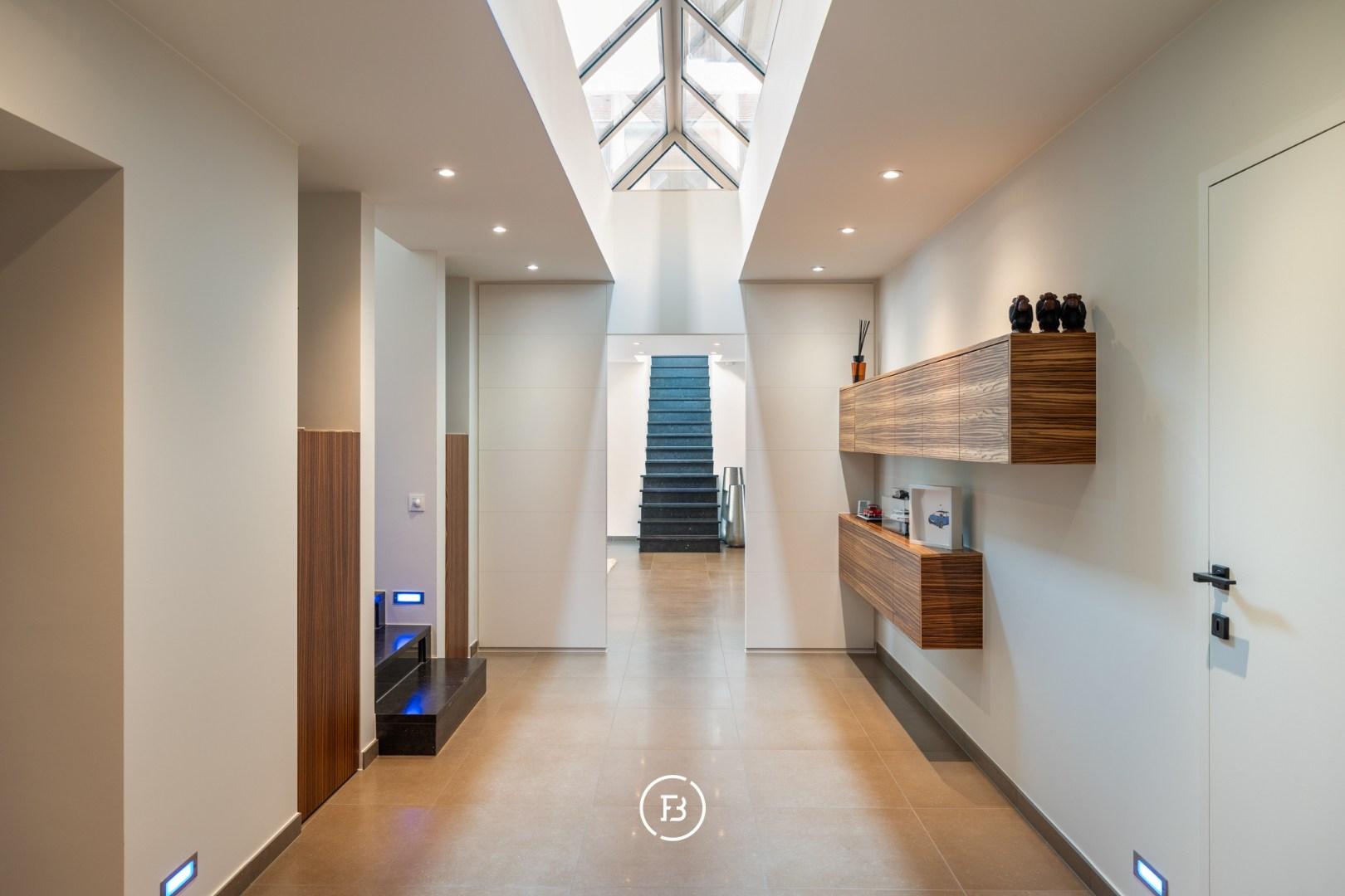 De villa is als volgt ingedeeld: op het gelijkvloers vindt u een royale inkomhal, dubbele garage, technische ruimte en berging, gastentoilet, volledig uitgeruste keuken en een lichtrijke leefruimte met zitput en openhaard en een klimaatgeregelde wijnkamer, een bureau en een master suite met ensuite badkamer en dressing. Verder beschikt de woning over een inpandig poolhouse met keuken en een tweede salon.