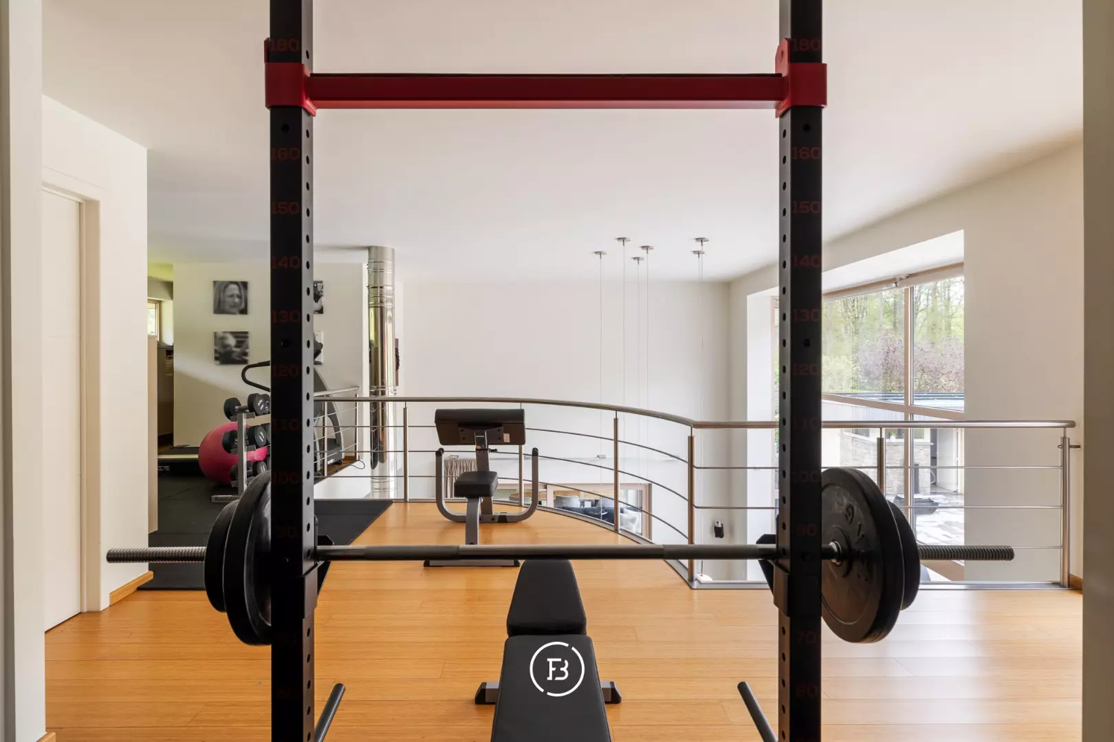Op de verdieping bevinden zich twee slaapkamers met gedeelde badkamer en apart toilet, een kinderkamer met eigen badkamer, alsook een fitnessruimte en sauna.