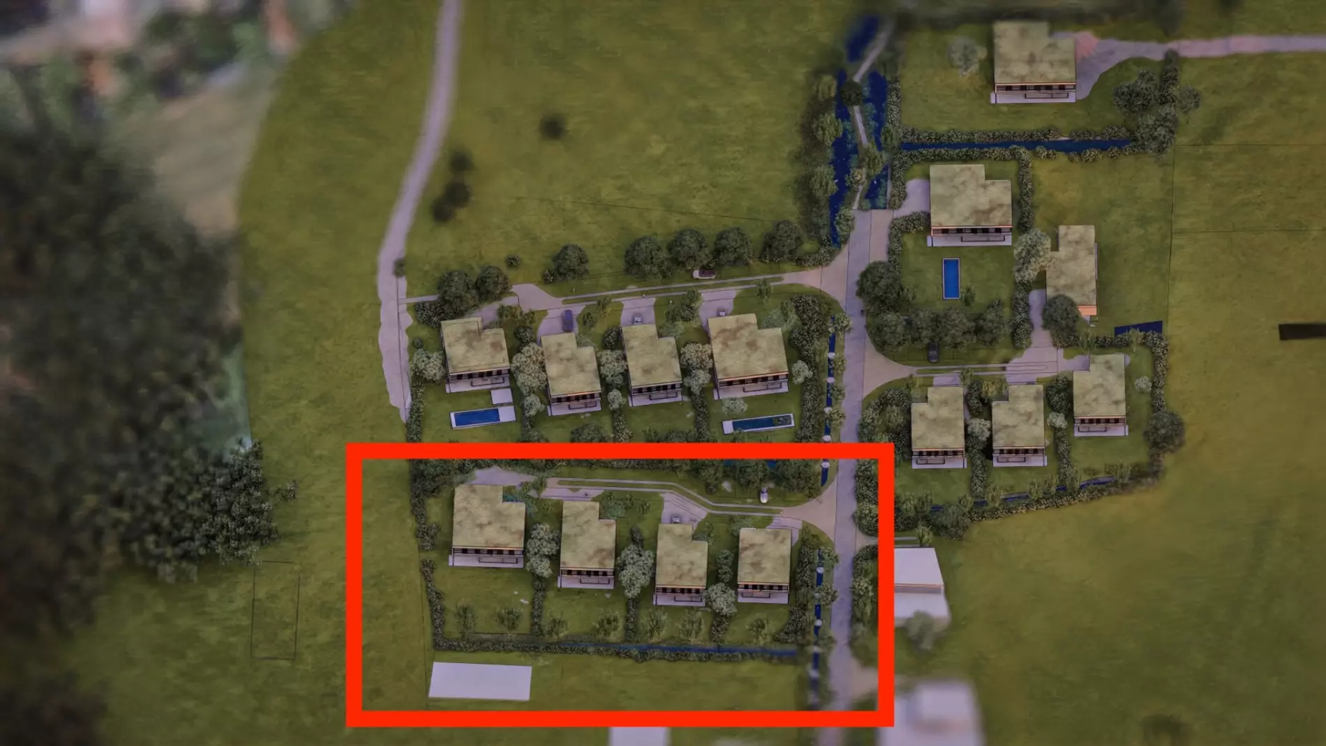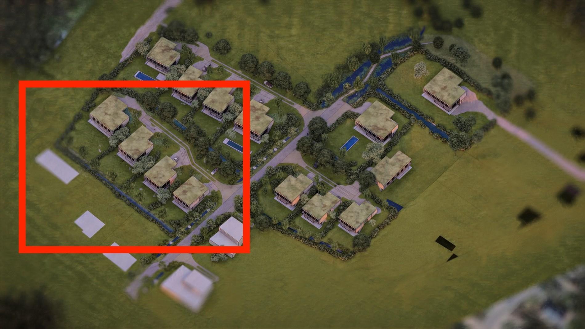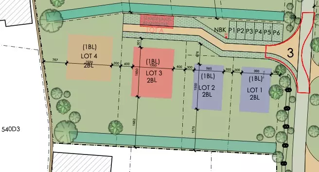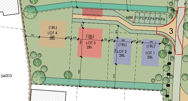 Dit stuk grond is opgedeeld in 4 loten: Lot 1 (499m²) - Lot 2 (499m²) - Lot 3 (787m²) - Lot 4 (1033m²)