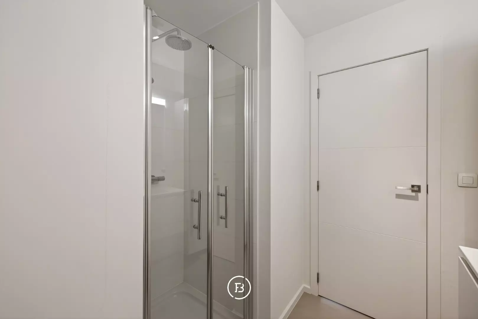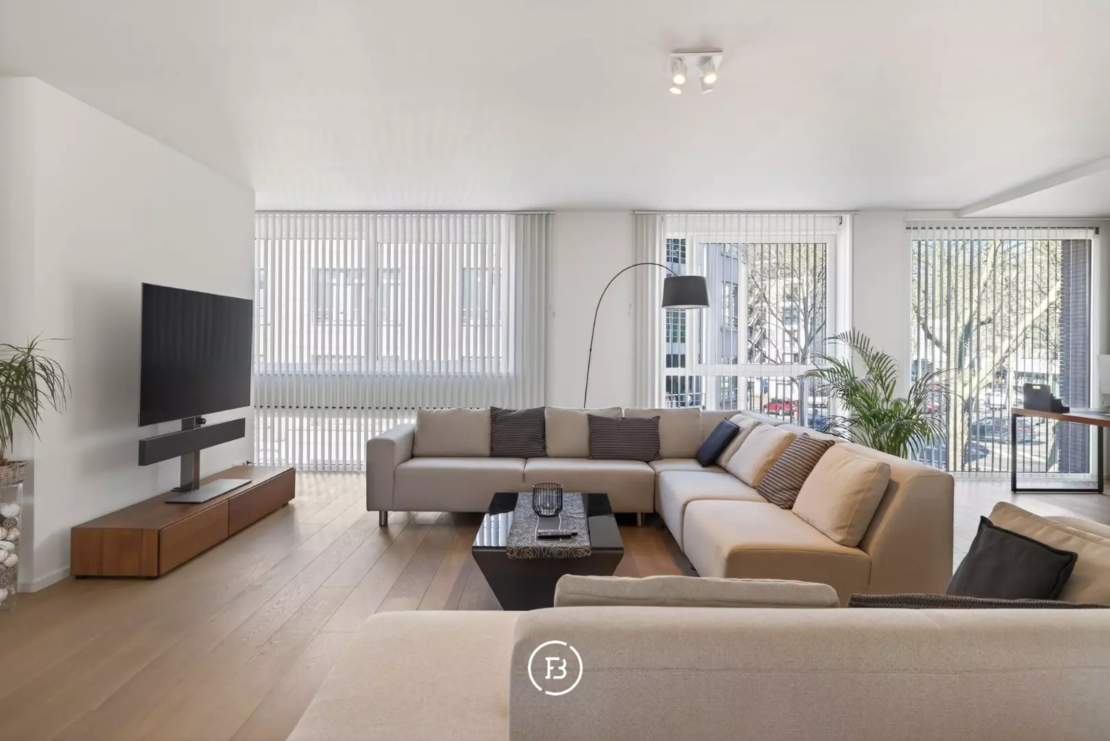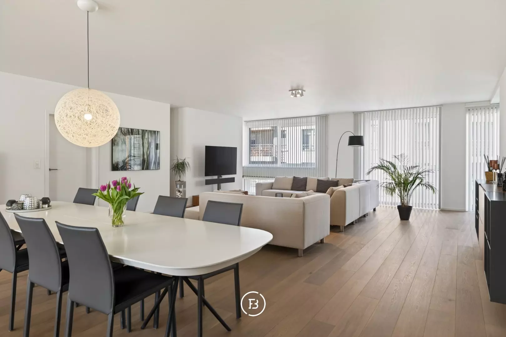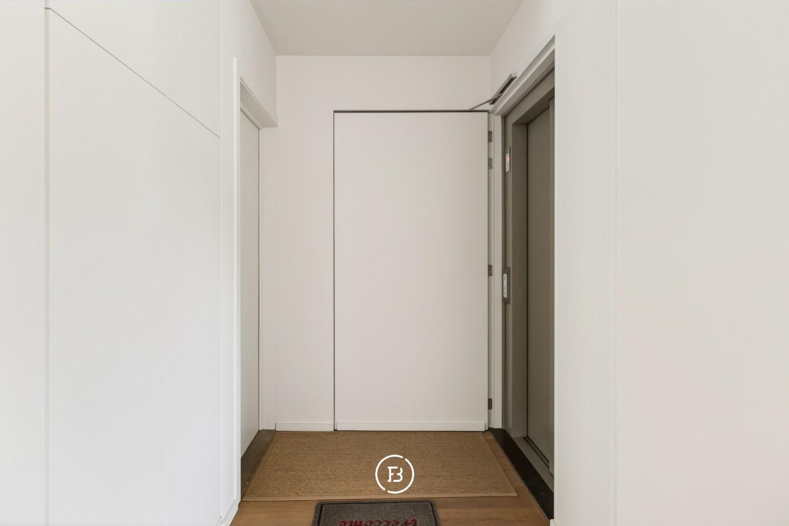Bij aankomst brengt de privétoegang via de lift u rechtstreeks naar de inkomhal. De open leefruimte wordt gekenmerkt door volume, licht en rust. De doorlopende eiken parketvloer en witte maatkasten zorgen voor een rustig interieur.