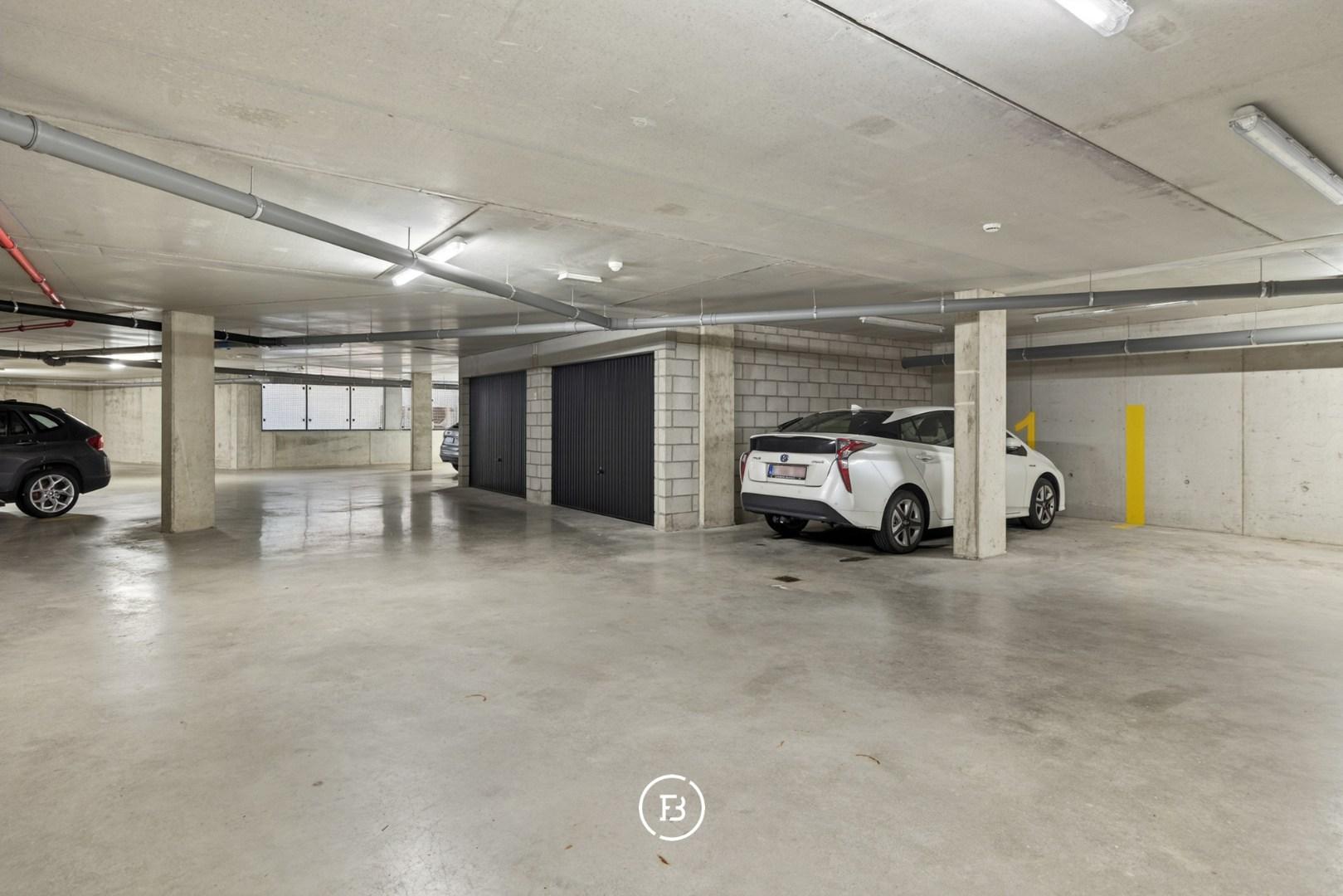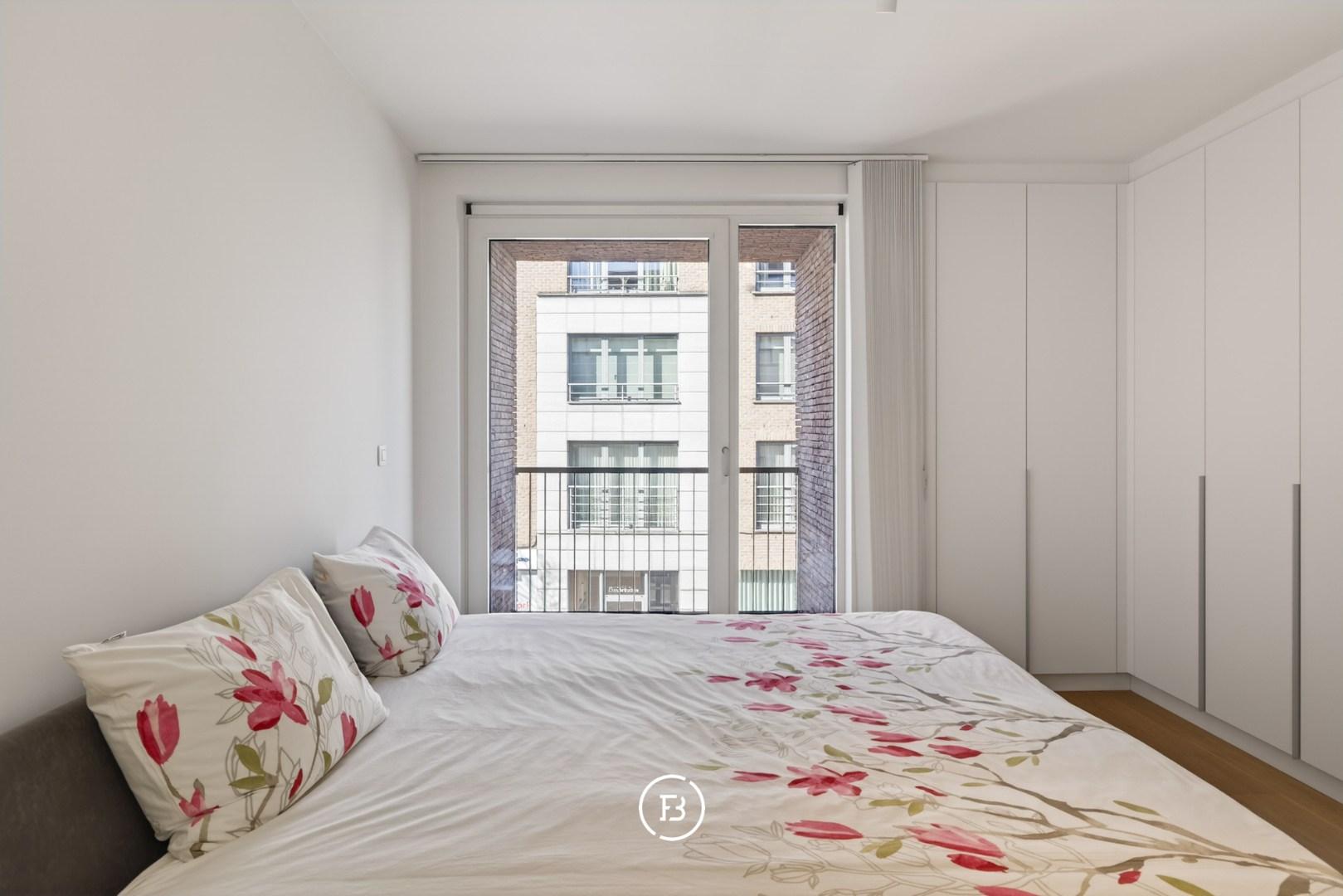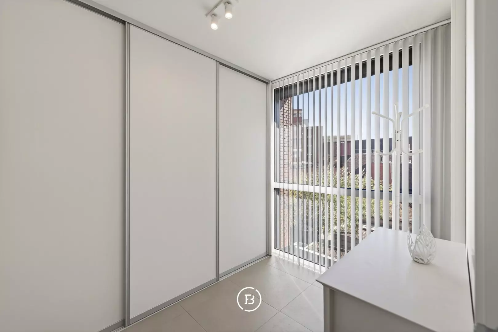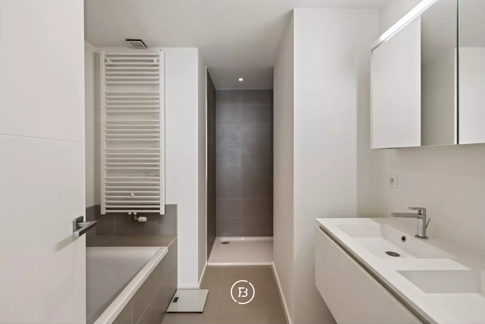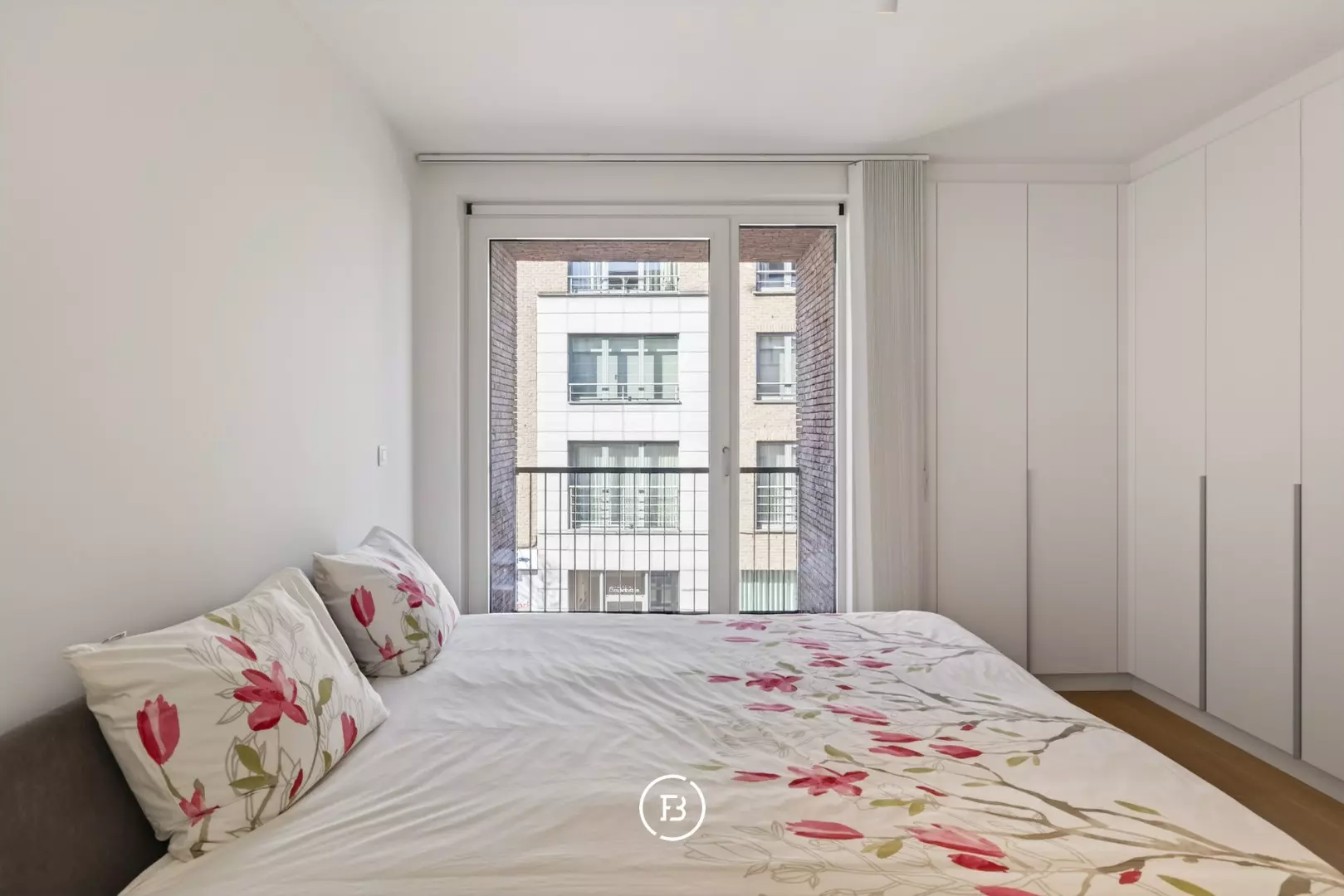 Bij aankomst brengt de privétoegang via de lift u rechtstreeks naar de inkomhal. De open leefruimte wordt gekenmerkt door volume, licht en rust. De doorlopende eiken parketvloer en witte maatkasten zorgen voor een rustig interieur.