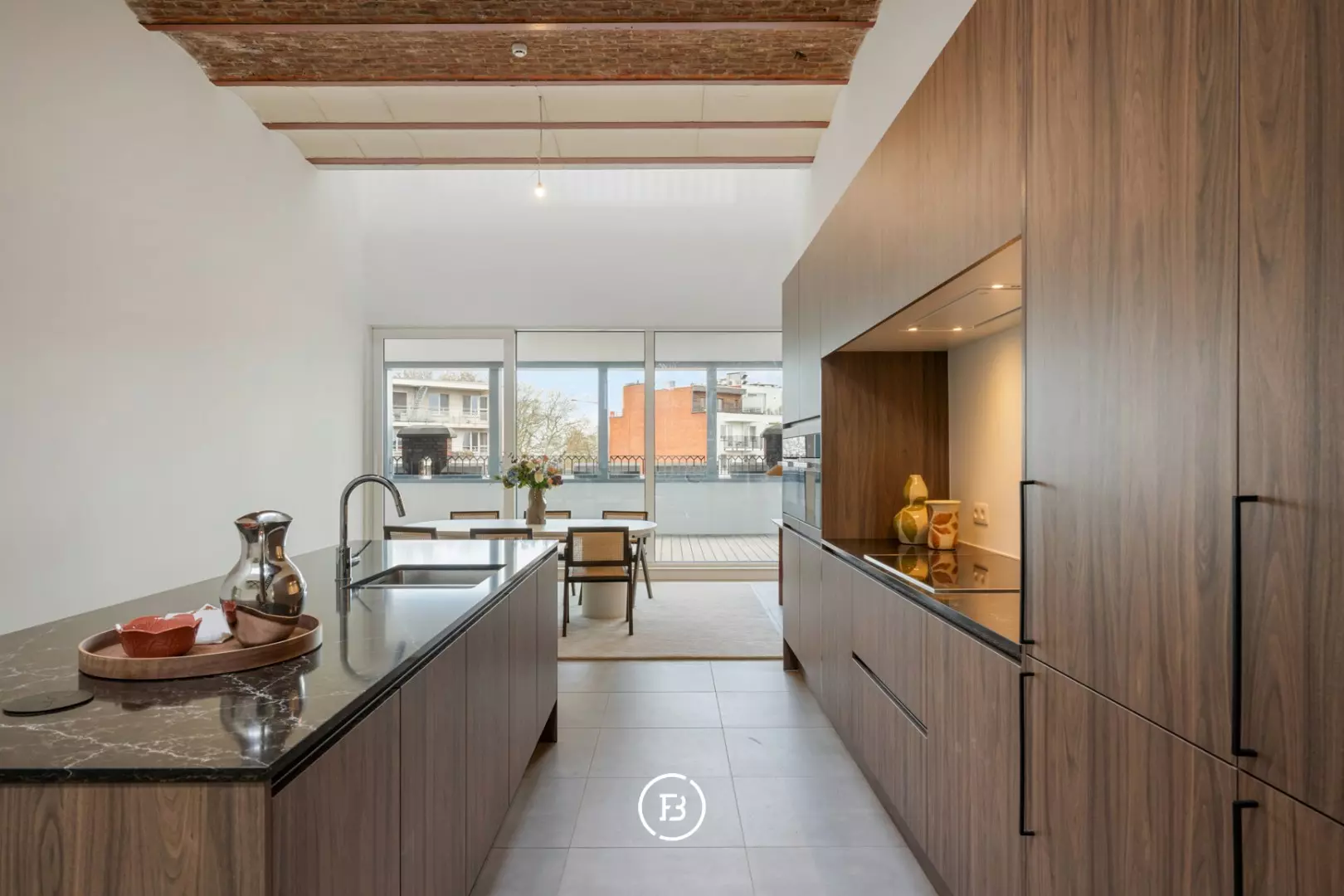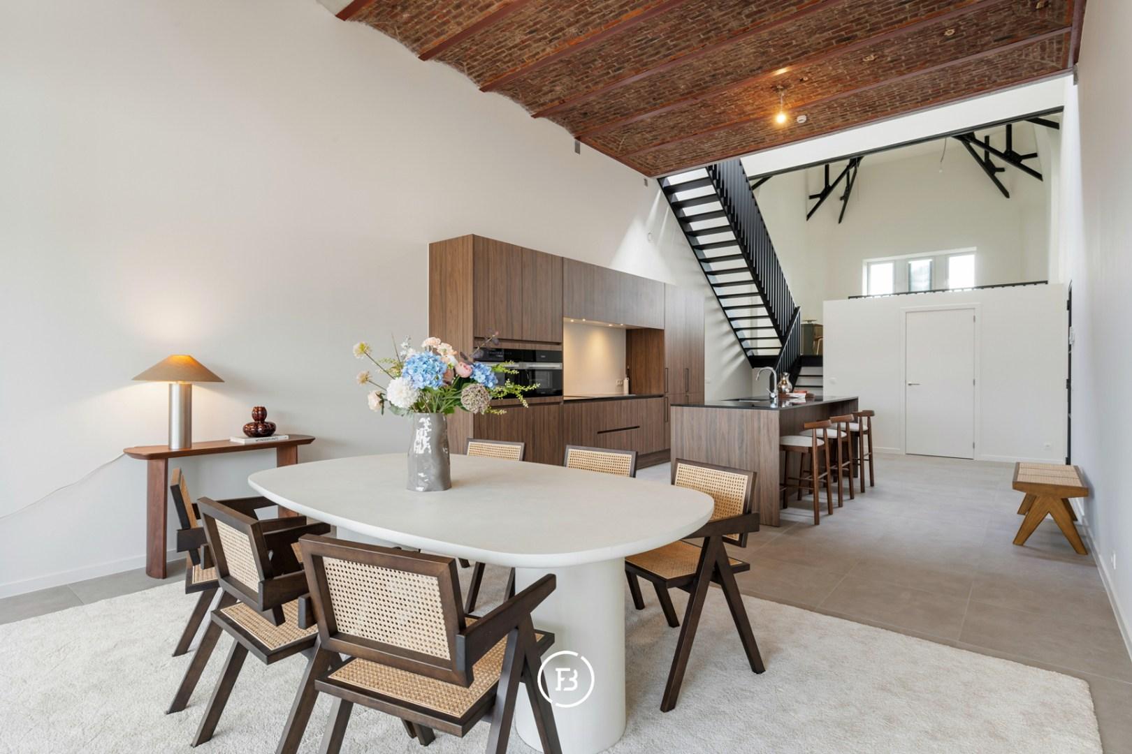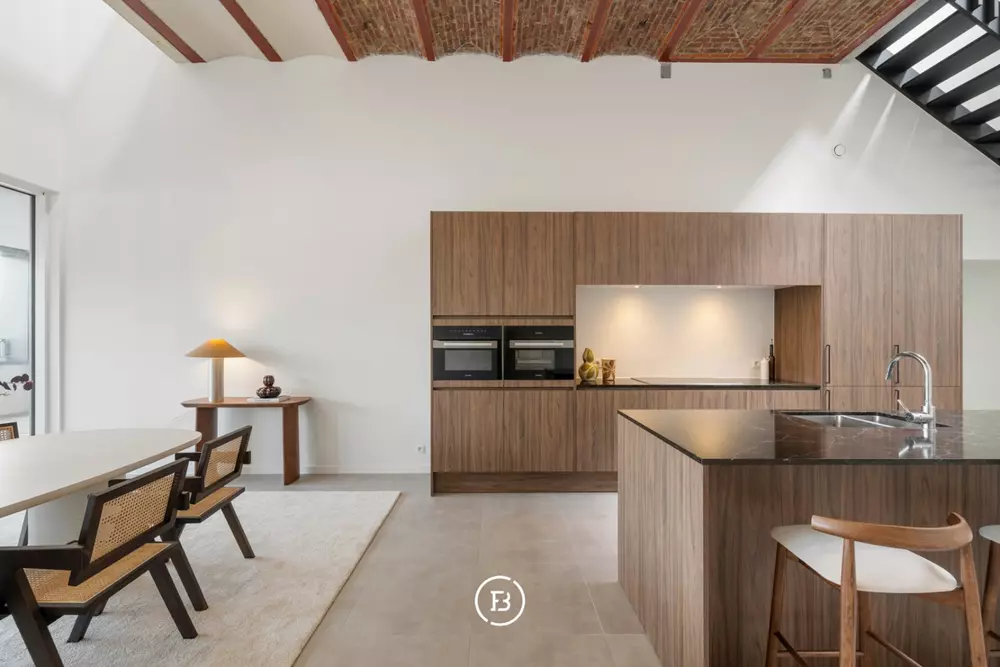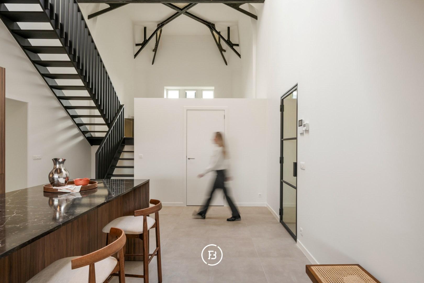 Bij binnenkomst wordt u verwelkomd in de ruime inkomhal met gastentoilet. De open leefkeuken vormt meteen een echte eyecatcher dankzij de indrukwekkende plafondhoogte en de authentieke gewelven die het geheel een bijzonder karakter geven. De keuken is hoogwaardig afgewerkt met maatwerk, uitgerust met kwalitatieve Miele-toestellen en beschikt bovendien over een aparte ruime provisieberging.