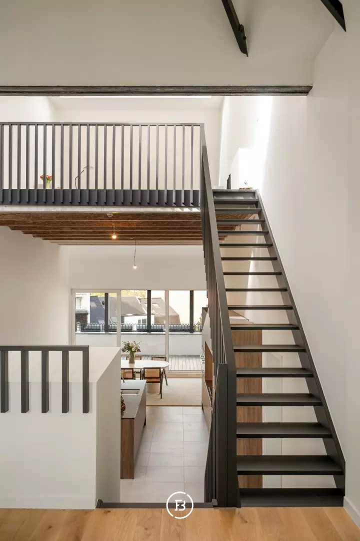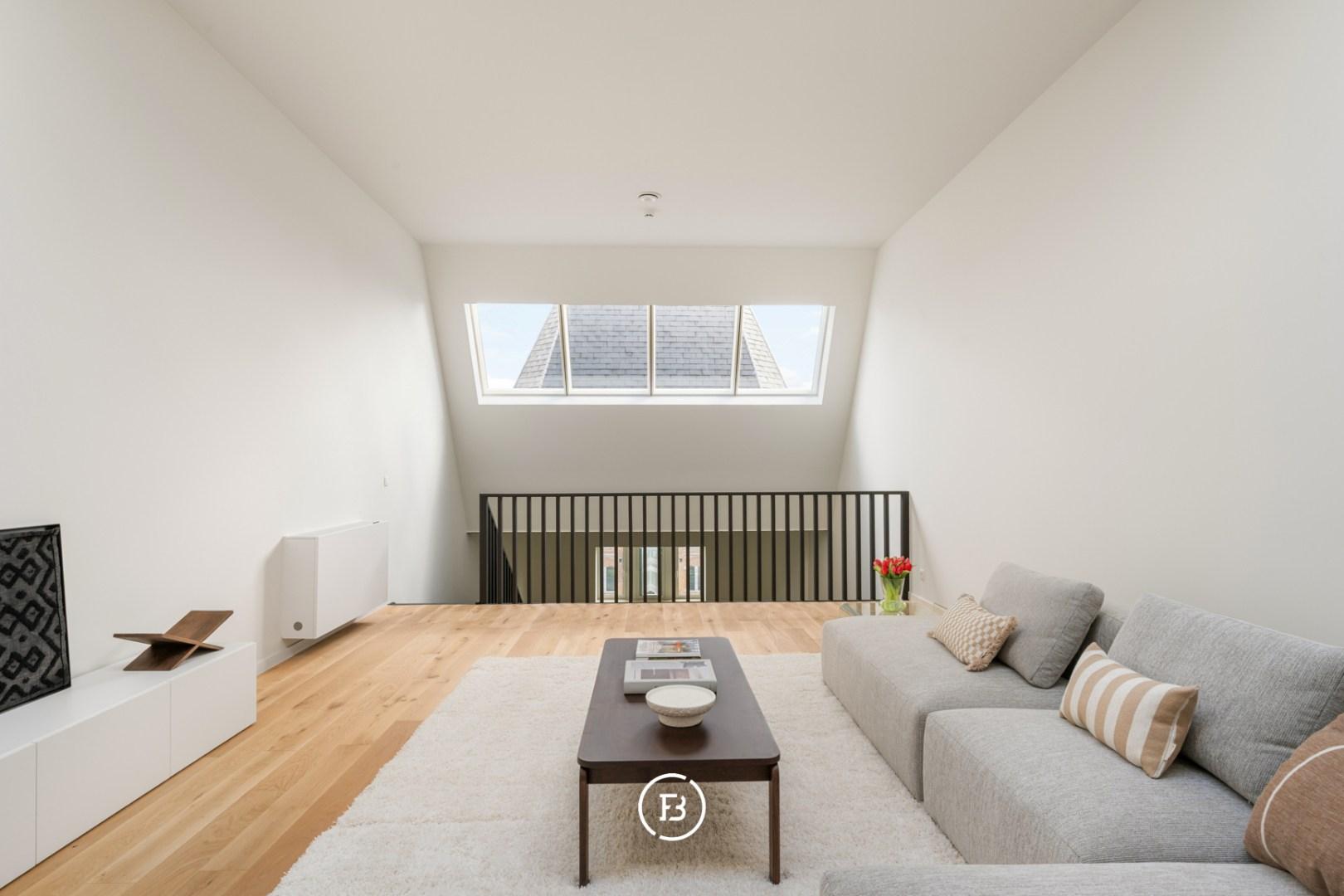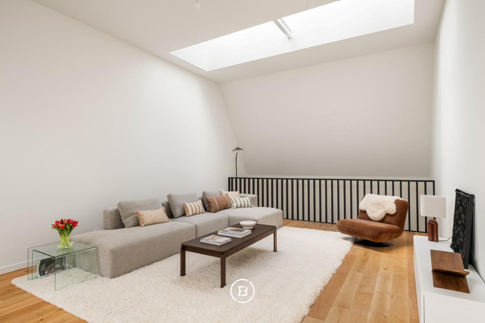 Op het tussenverdiep bevindt zich momenteel een formele leefruimte, die zich ook perfect leent als bureau of polyvalente ruimte. Op het bovenste niveau bevindt zich de tweede, royale leefruimte: een ware oase van licht dankzij de verschillende dakramen en de unieke openheid van het geheel.