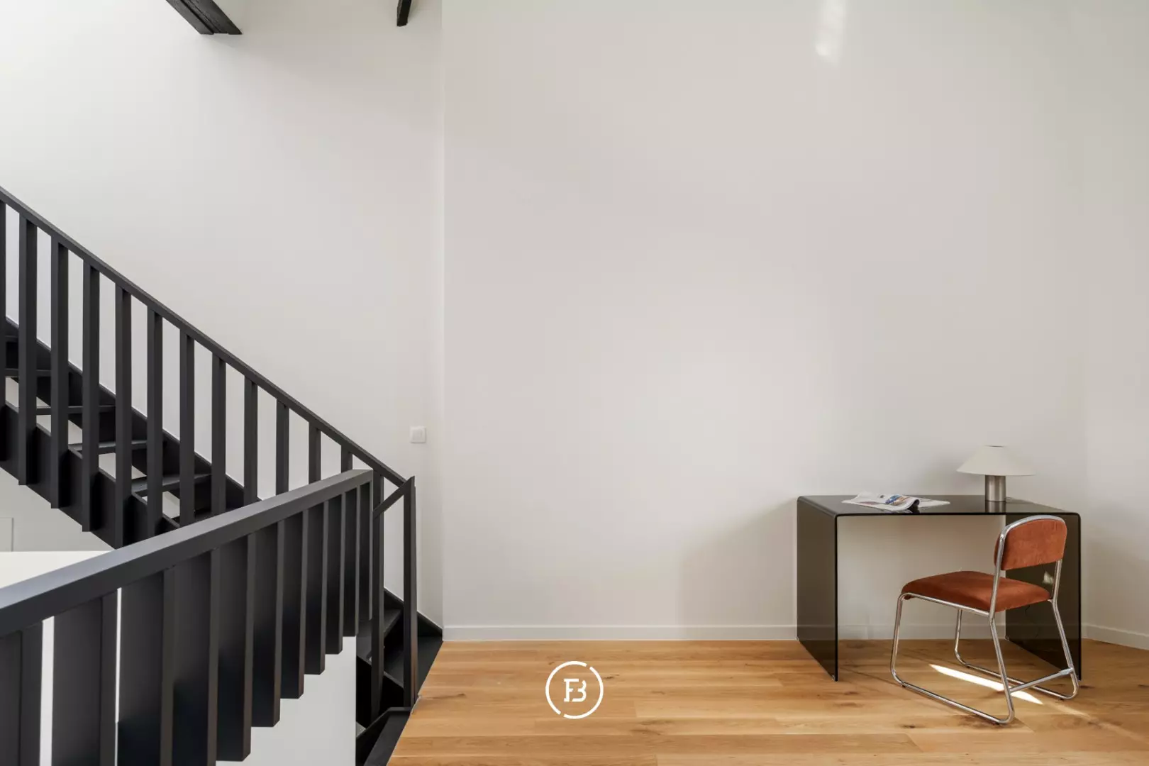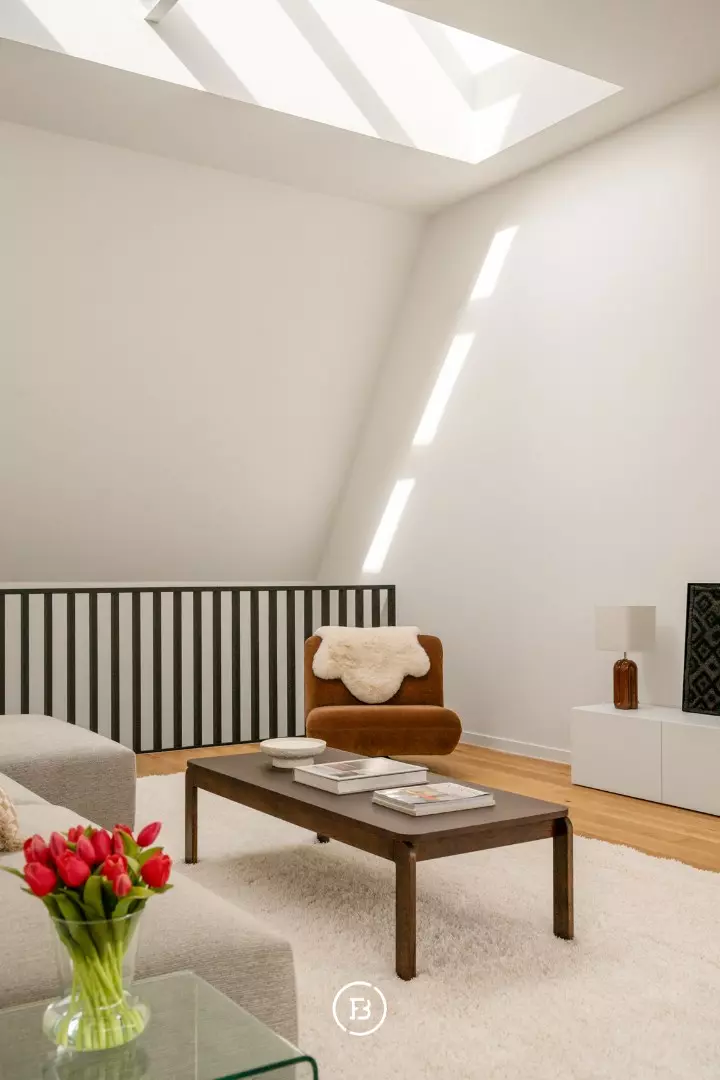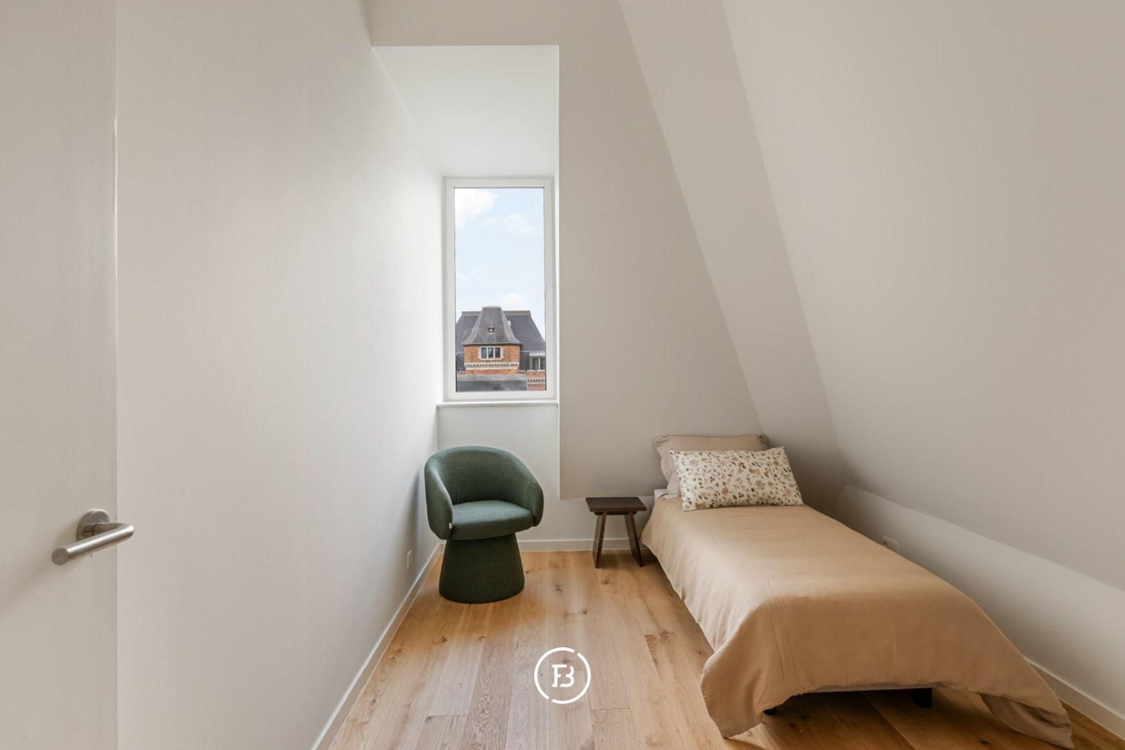Op het tussenverdiep bevindt zich momenteel een formele leefruimte, die zich ook perfect leent als bureau of polyvalente ruimte. Op het bovenste niveau bevindt zich de tweede, royale leefruimte: een ware oase van licht dankzij de verschillende dakramen en de unieke openheid van het geheel.