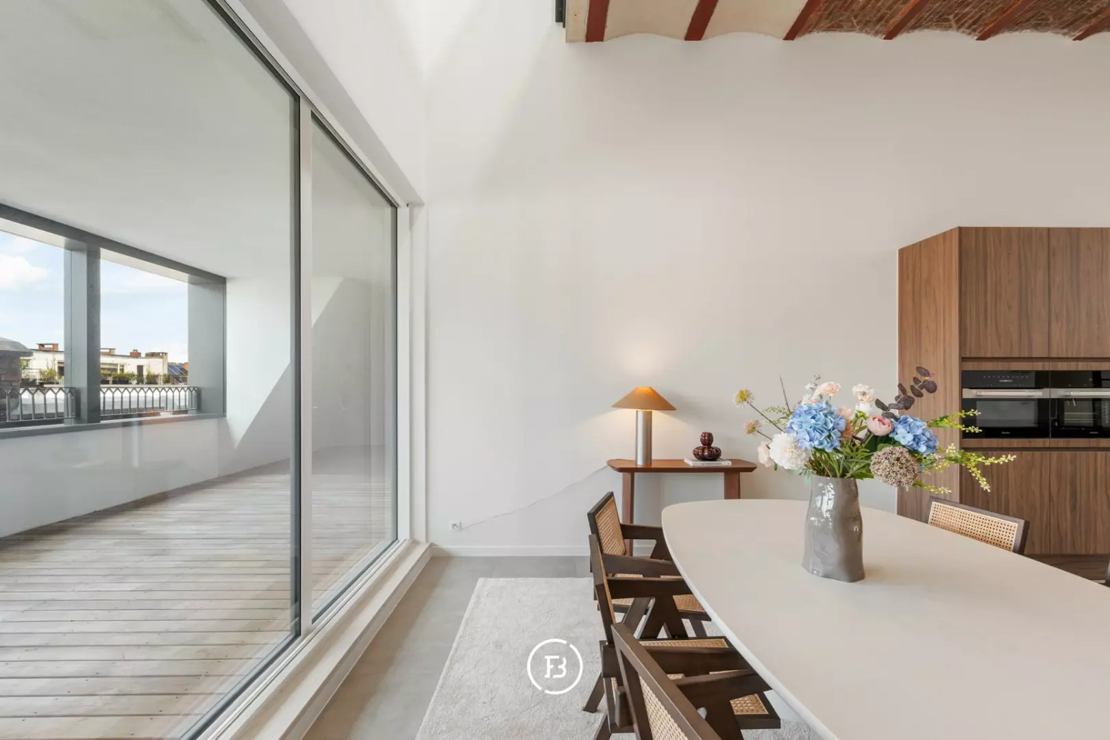 De eetplaats sluit naadloos aan op het ruime zonneterras en geniet van een overvloed aan natuurlijk licht, wat zorgt voor een aangename en open sfeer.