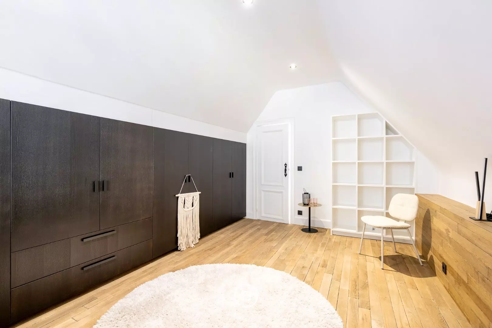 Op de verdiepingen bevindt zich een royale masterbedroom met gashaard, die een warme en luxe sfeer creëert. De ruime badkamer is uitgerust met een ligbad, een dubbel lavabomeubel en een inloopdouche. Verder zijn er een tweede slaapkamer met lavabo, een derde slaapkamer en helemaal boven een vierde kamer die perfect dienstdoet als slaapkamer of bureau.