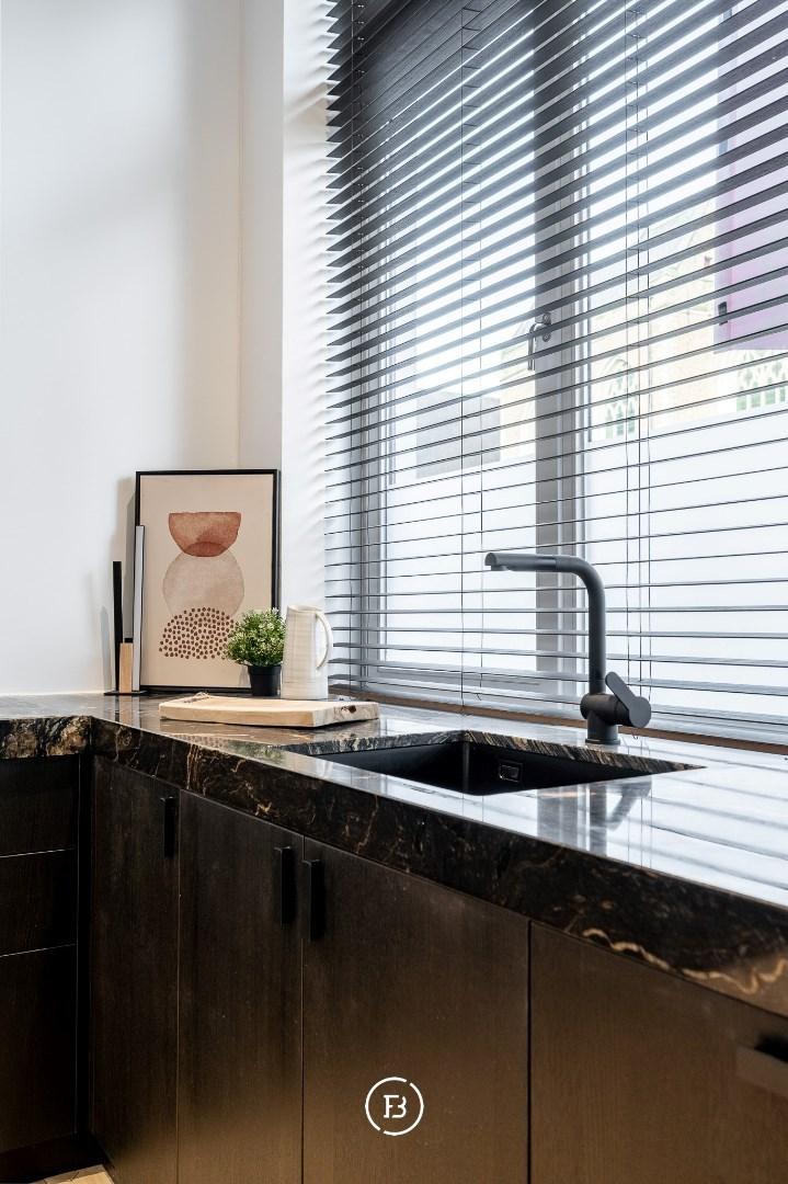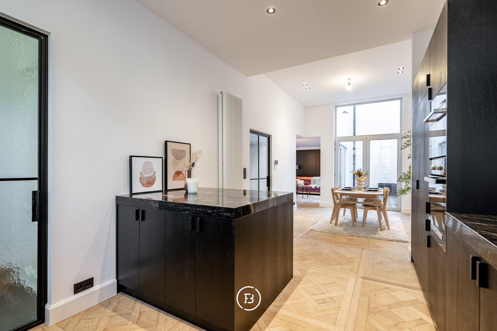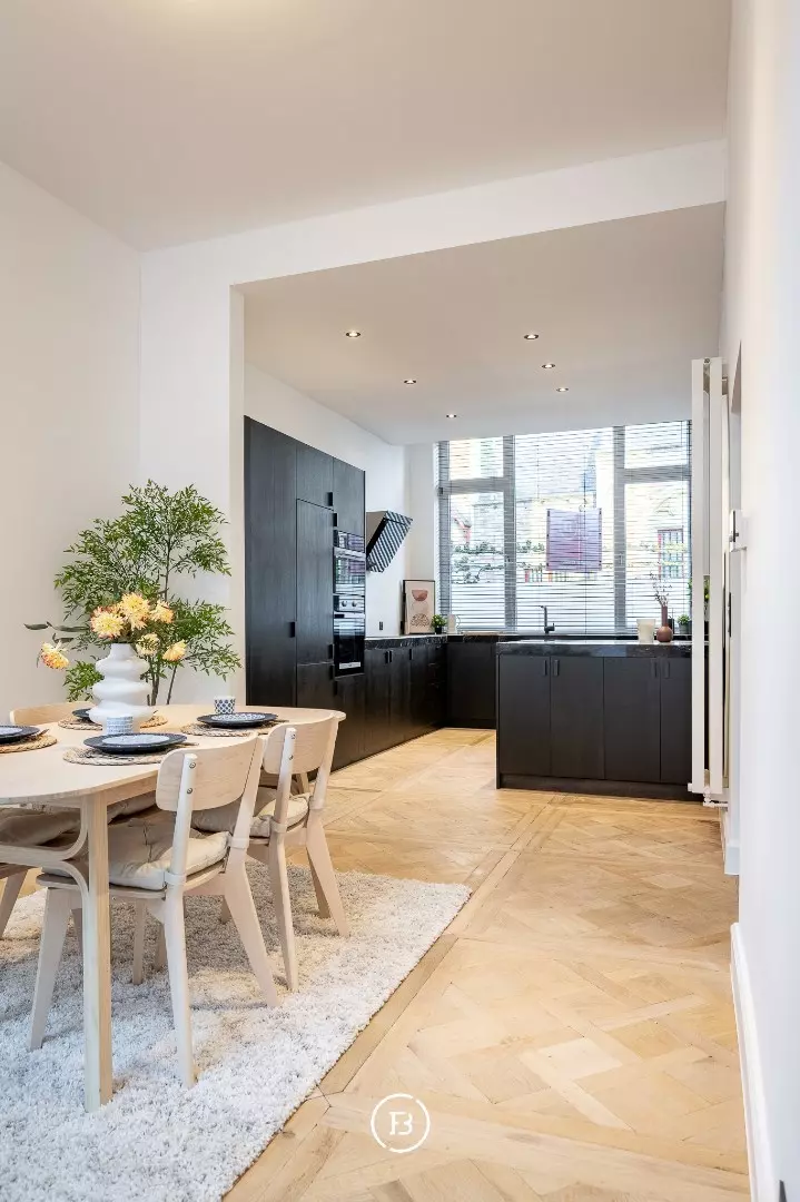De woning onderging een totaalrenovatie en werd afgewerkt met hoogwaardige materialen, warm houtfineer en oog voor detail. Bij het binnenkomen via de inkomhal betreedt u de lumineuze leefruimte, ingedeeld in een gezellige zitruimte met ingebouwde kasten en een open maatkeuken in eik, afgewerkt met een natuurstenen werkblad en hoogwaardige Miele-toestellen. De grote raampartijen zorgen voor een aangename lichtinval en een directe verbondenheid met het ruime, gezellige terras—een heerlijke buitenruimte in het hart van de stad.