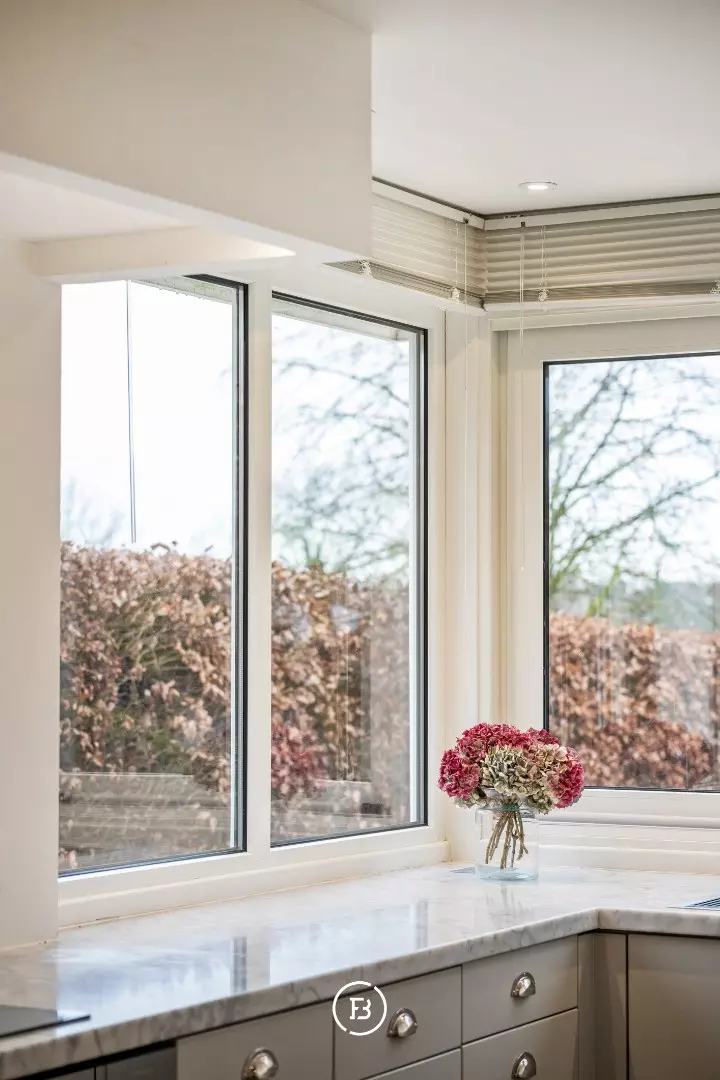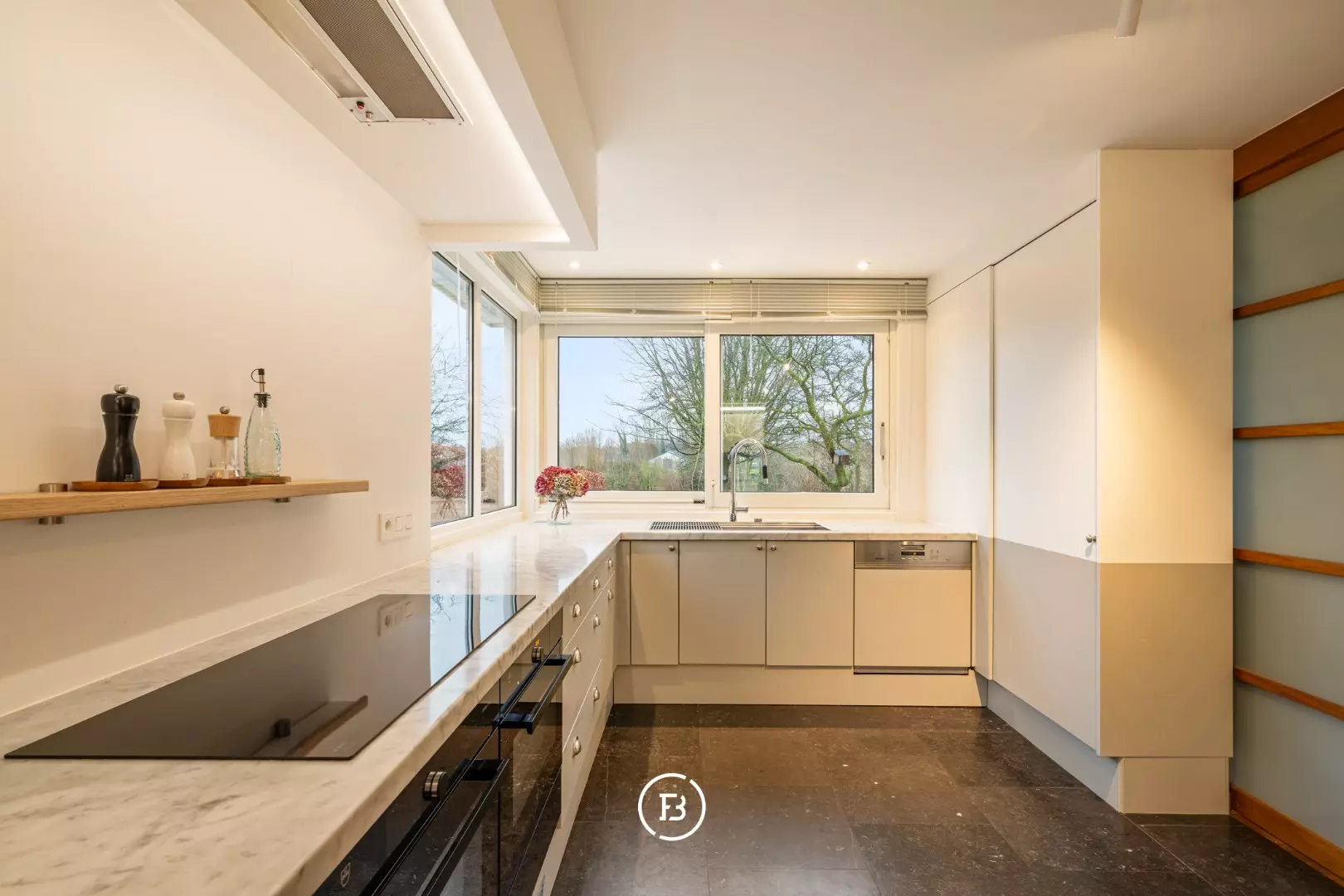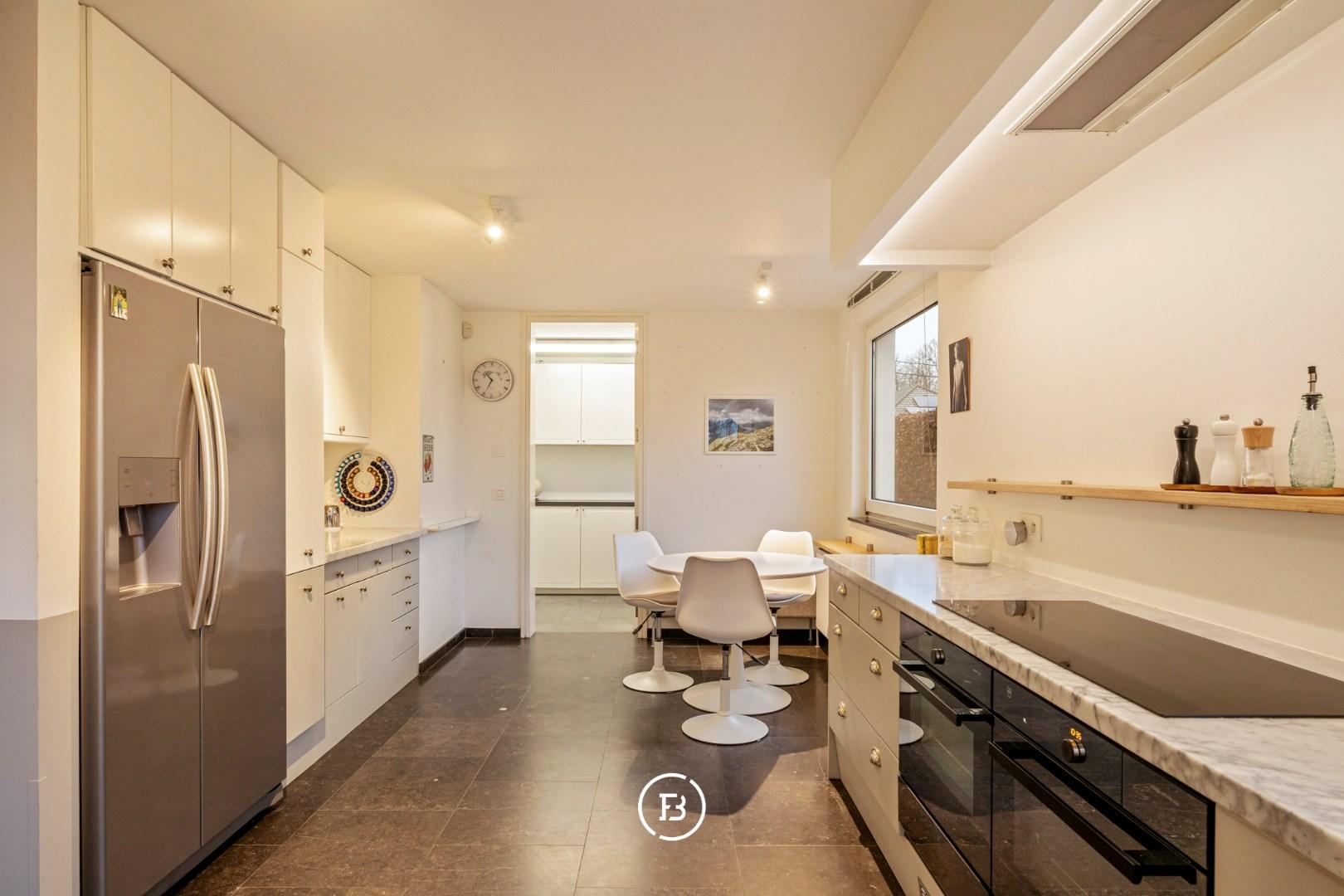 Via de inkomhal met trappenhal en gastentoilet betreedt u het lichtovergoten woongedeelte. De leefruimte combineert een gezellige zithoek met eetplaats en sluit aan op de vernieuwde keuken met ontbijthoek, die geniet van een prachtig zicht op de tuin. De keuken is afgewerkt met hoogwaardige materialen zoals Carrara marmer en een blauwe hardstenen vloer, en is uitgerust met kwalitatieve toestellen (V-Zug combi-/stoomoven en oven, Miele vaatwasser). Aansluitend bevindt zich een praktische, ruime bijkeuken/berging met aparte toegang tot de tuin.