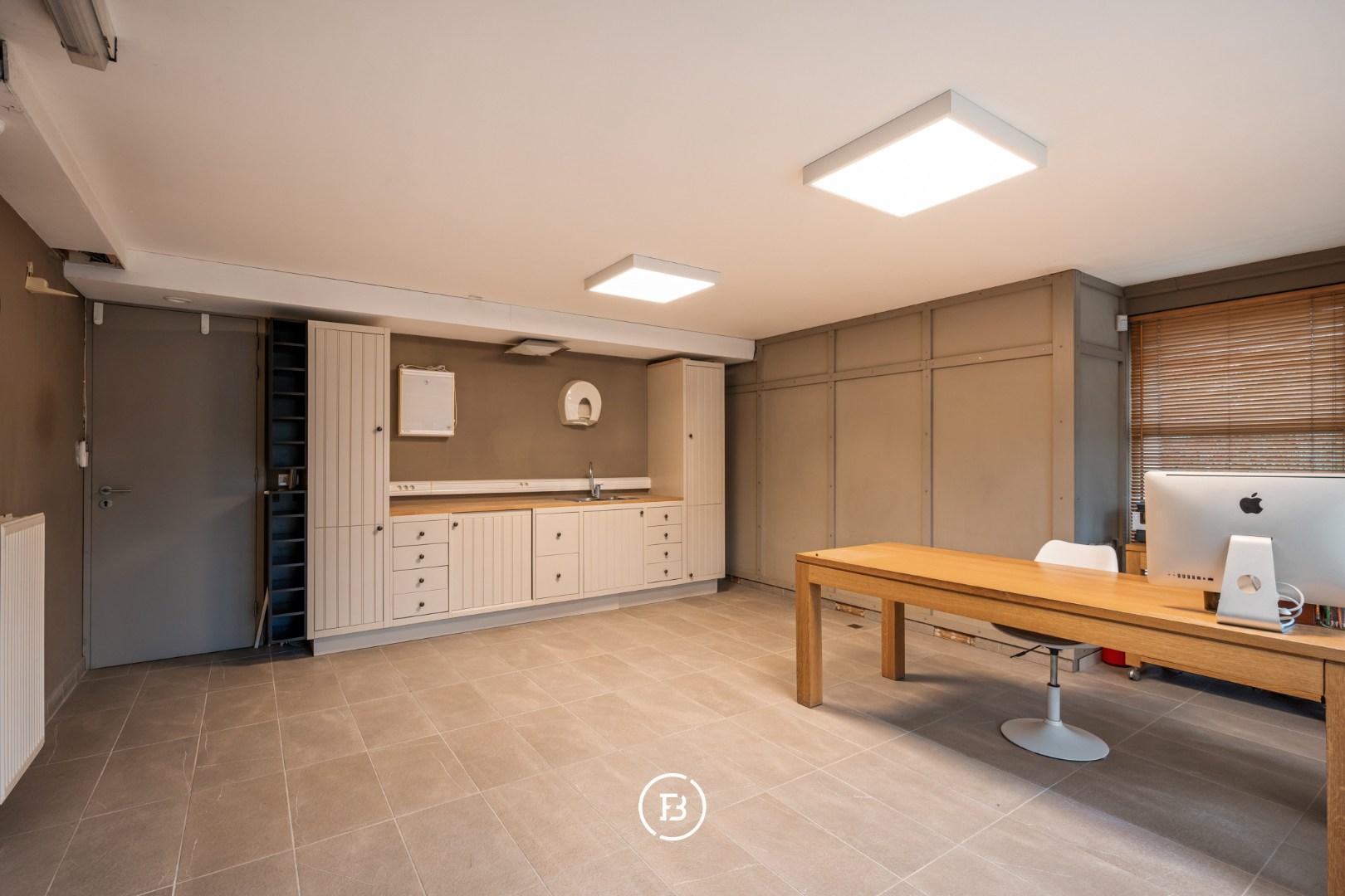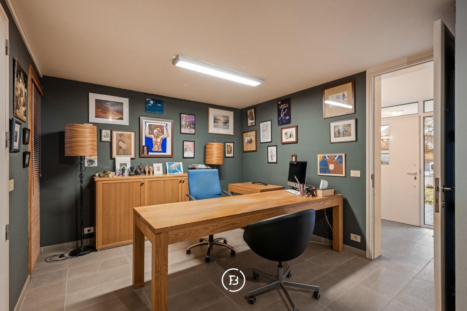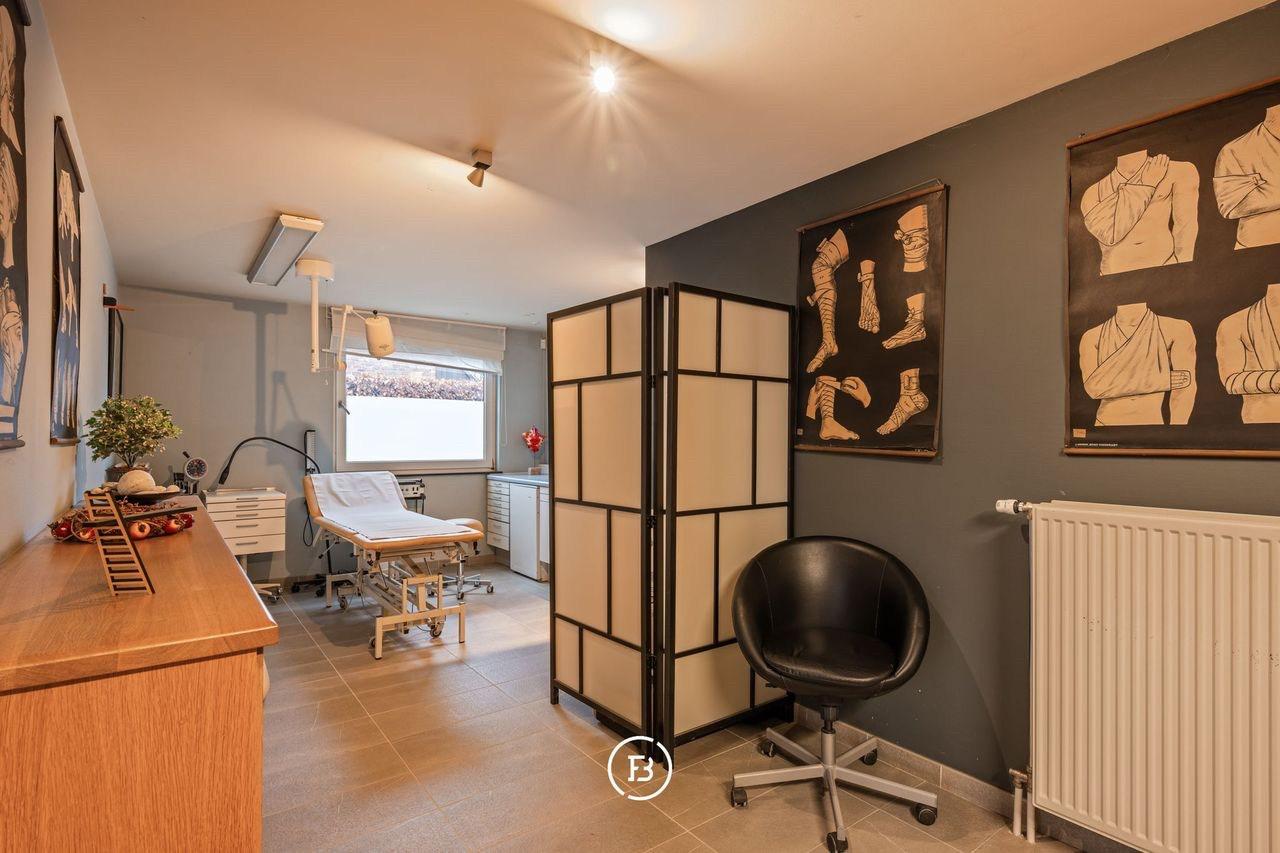 Het praktijkgedeelte (apart perceelnummer) beschikt over een inkomhal met toilet, een wachtkamer, een eerste kabinet en een ruim secretariaat. Daarnaast is er een mogelijkheid tot uitbouw van een tweede kabinet (vergunning dd. 2002). Deze vleugel met aparte toegang kan op verschillende manieren ingezet worden (wonen/werken/hobby,...).