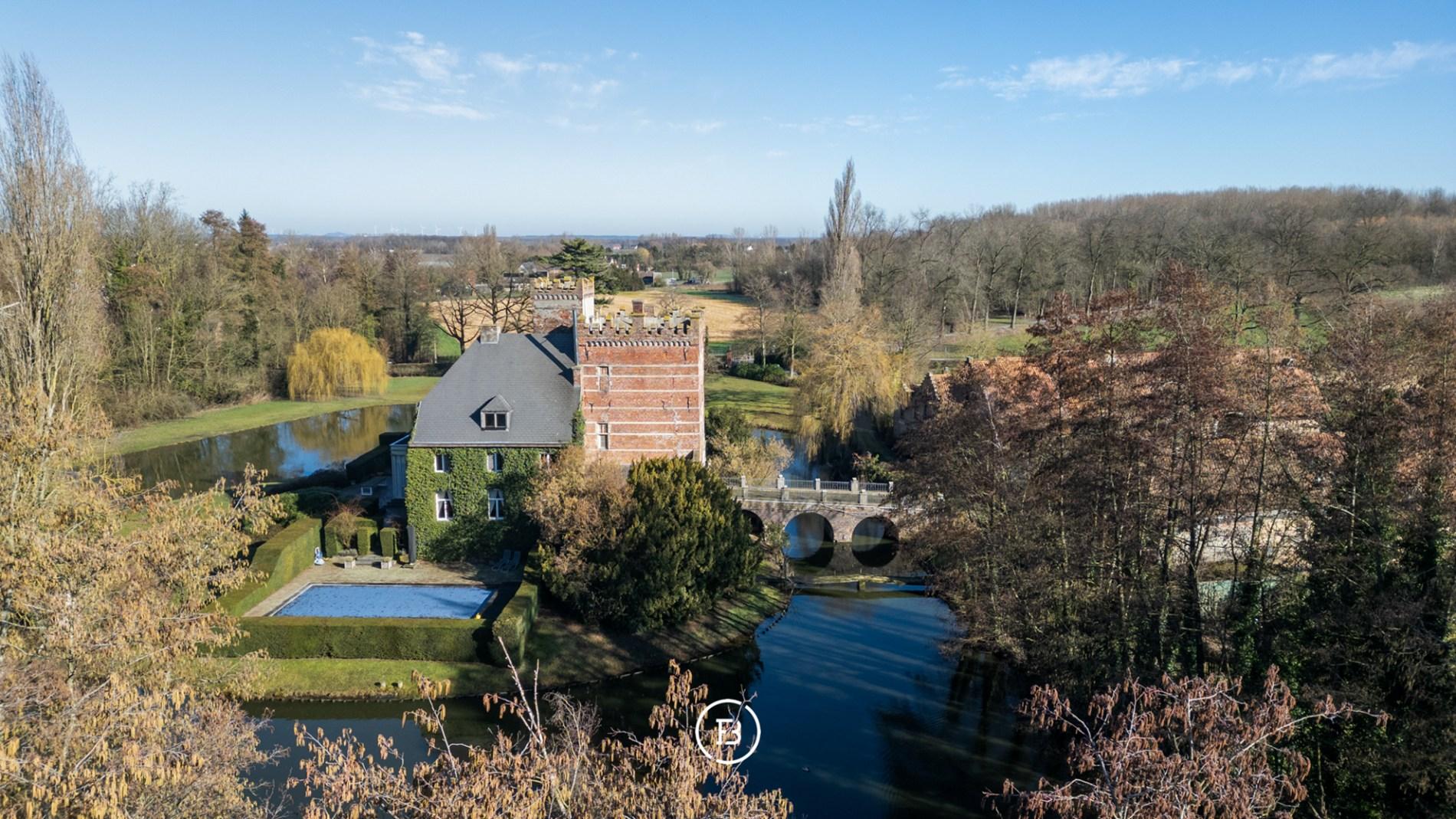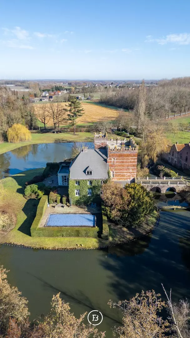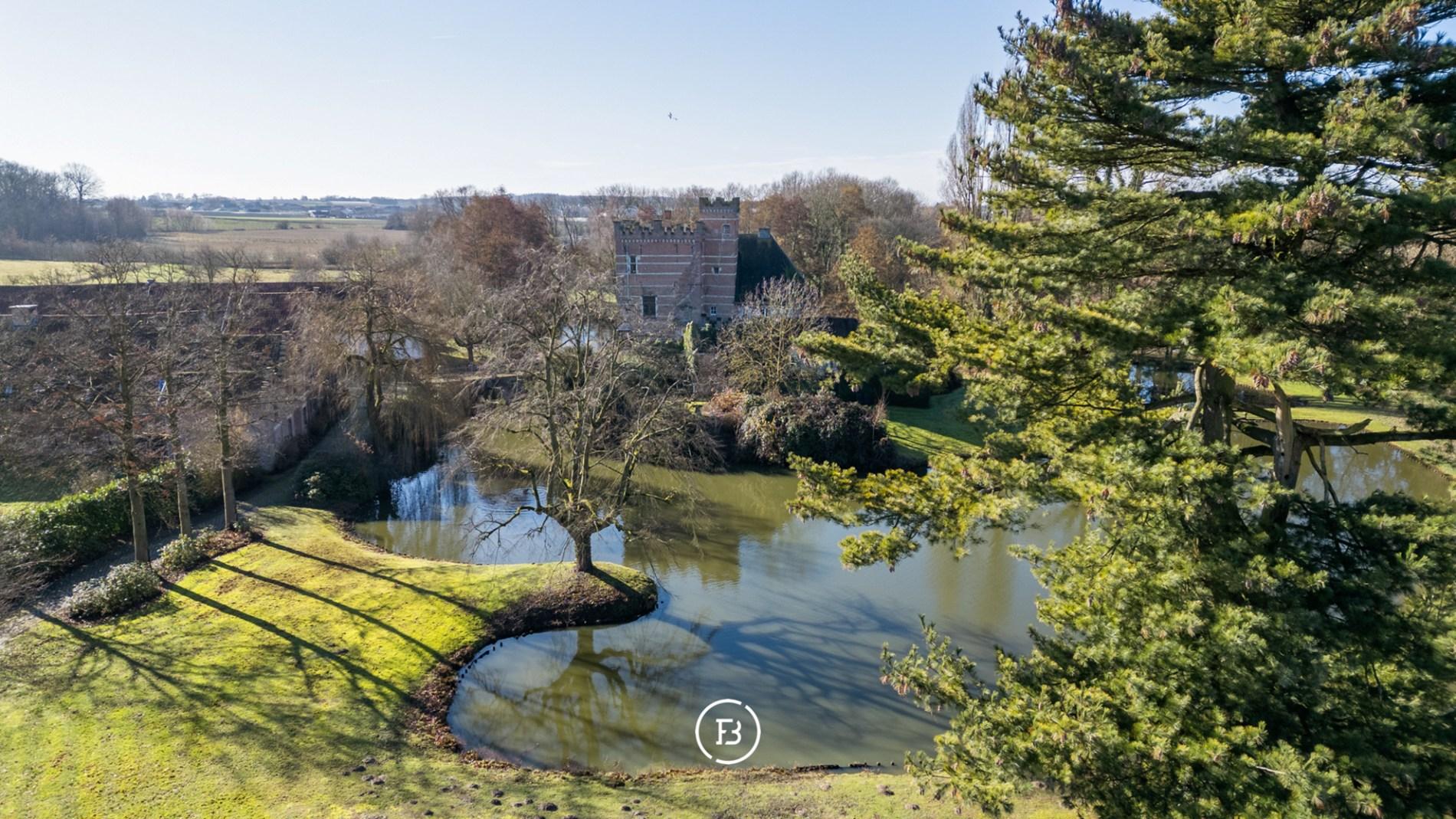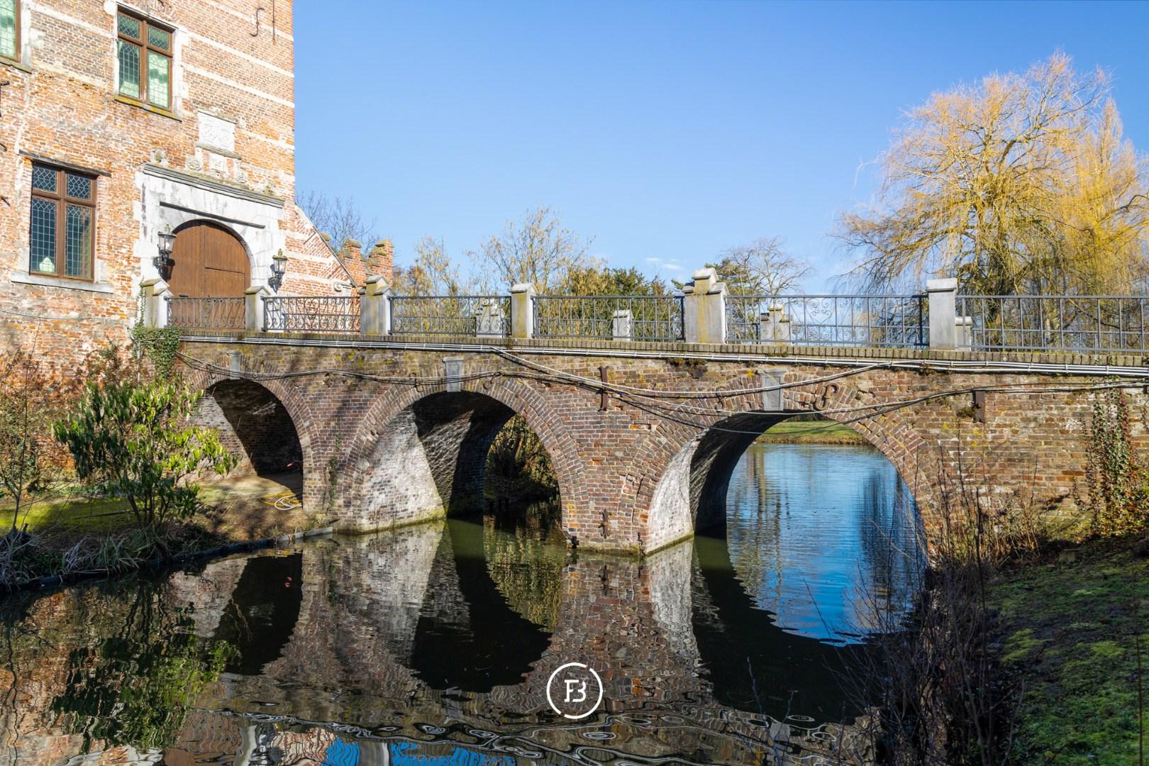 Het indrukwekkende geheel gaat harmonieus op in het omliggende landschap en is bereikbaar via een statige oprijlaan die uitkijkt over het domein en leidt naar een pittoreske brug over de eigen slotgracht.