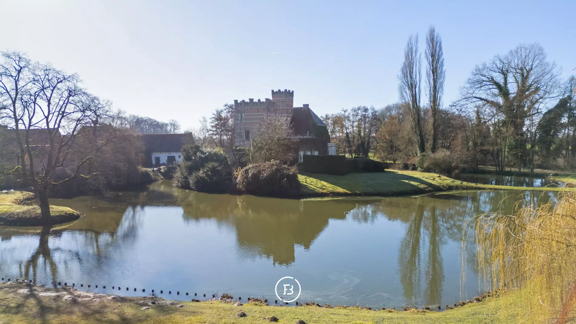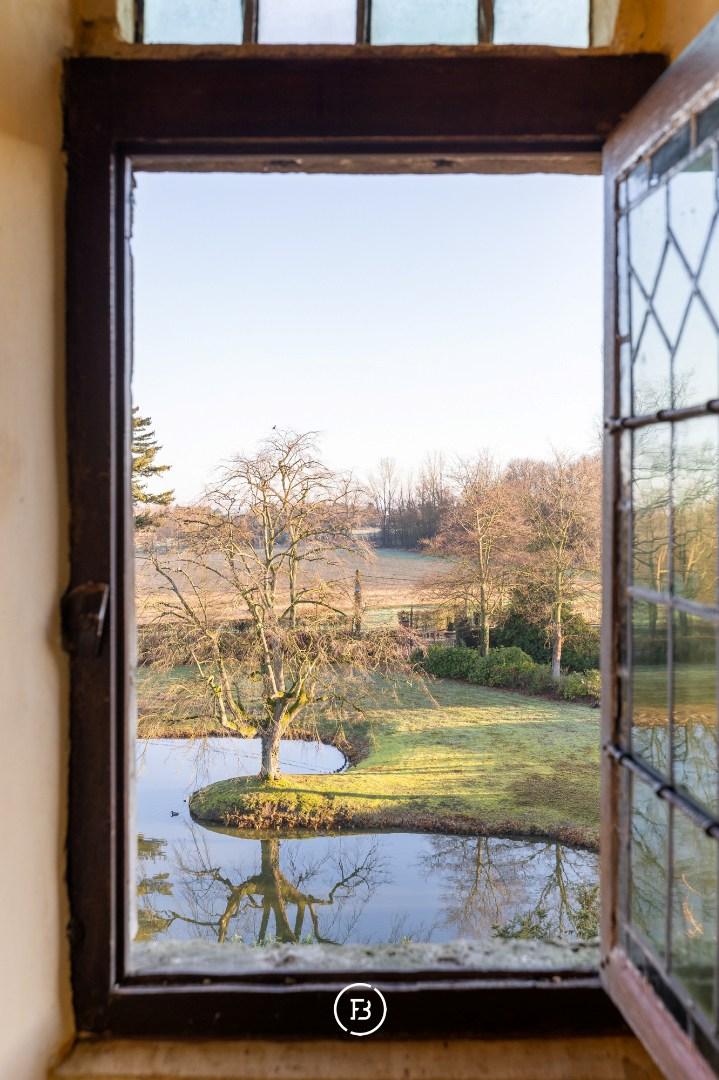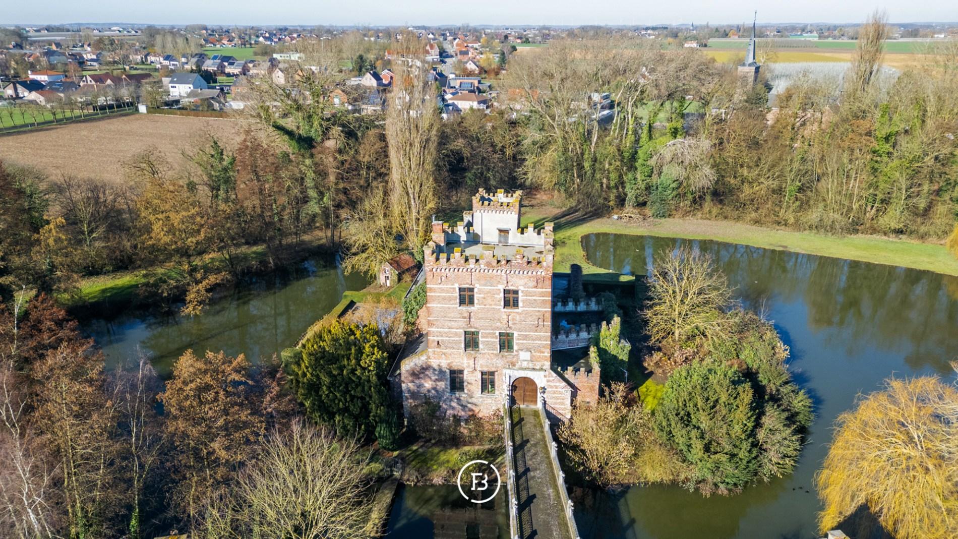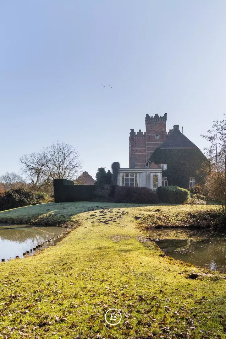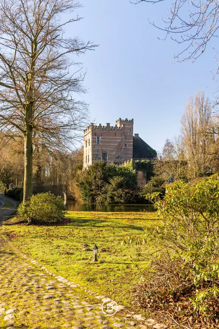 Het indrukwekkende geheel gaat harmonieus op in het omliggende landschap en is bereikbaar via een statige oprijlaan die uitkijkt over het domein en leidt naar een pittoreske brug over de eigen slotgracht.