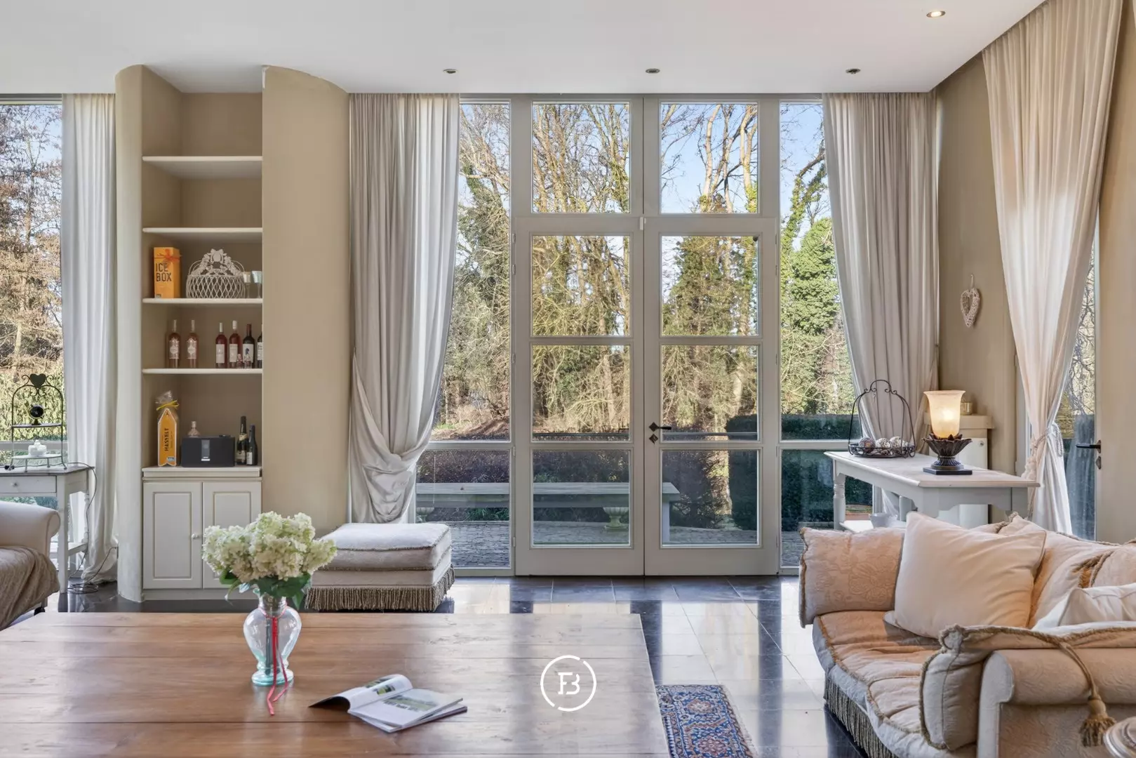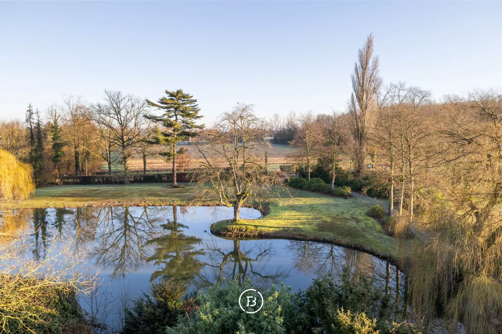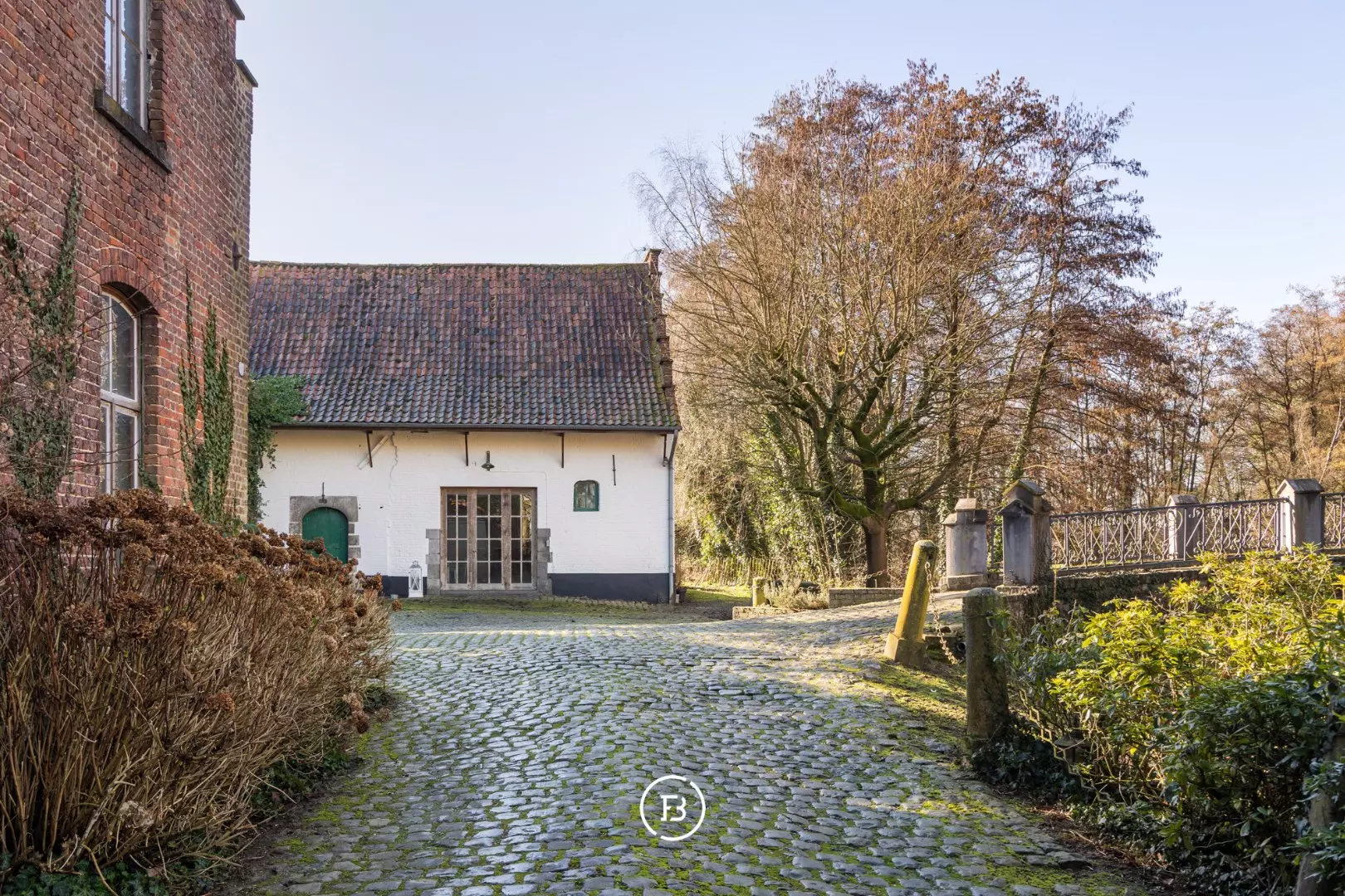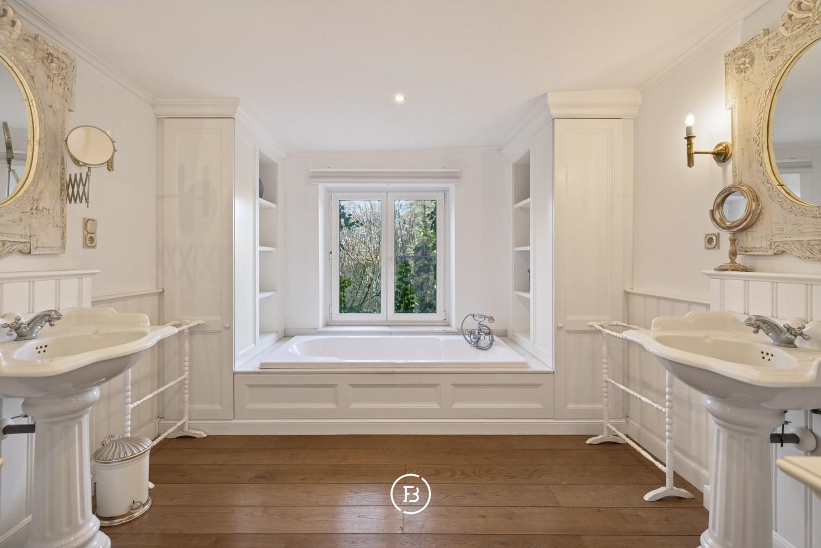Het indrukwekkende geheel gaat harmonieus op in het omliggende landschap en is bereikbaar via een statige oprijlaan die uitkijkt over het domein en leidt naar een pittoreske brug over de eigen slotgracht.