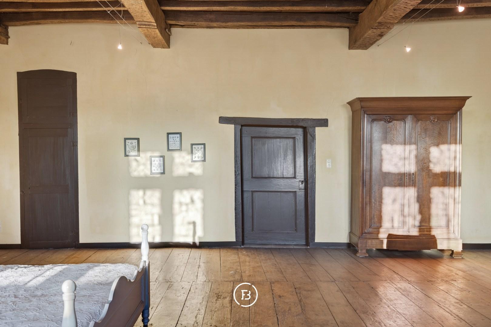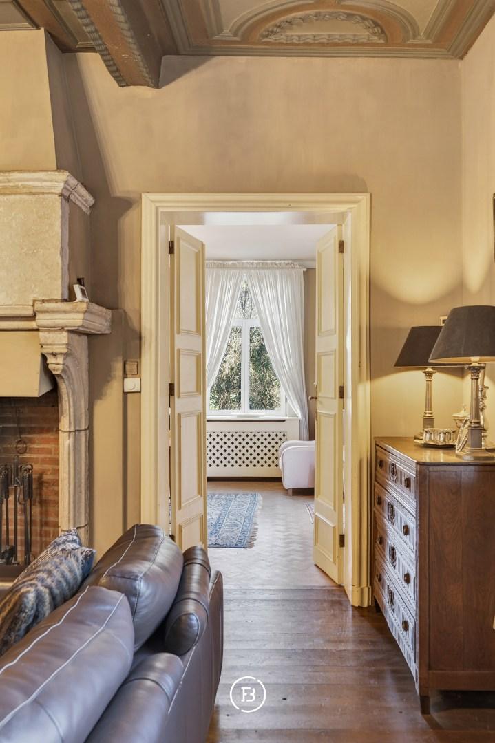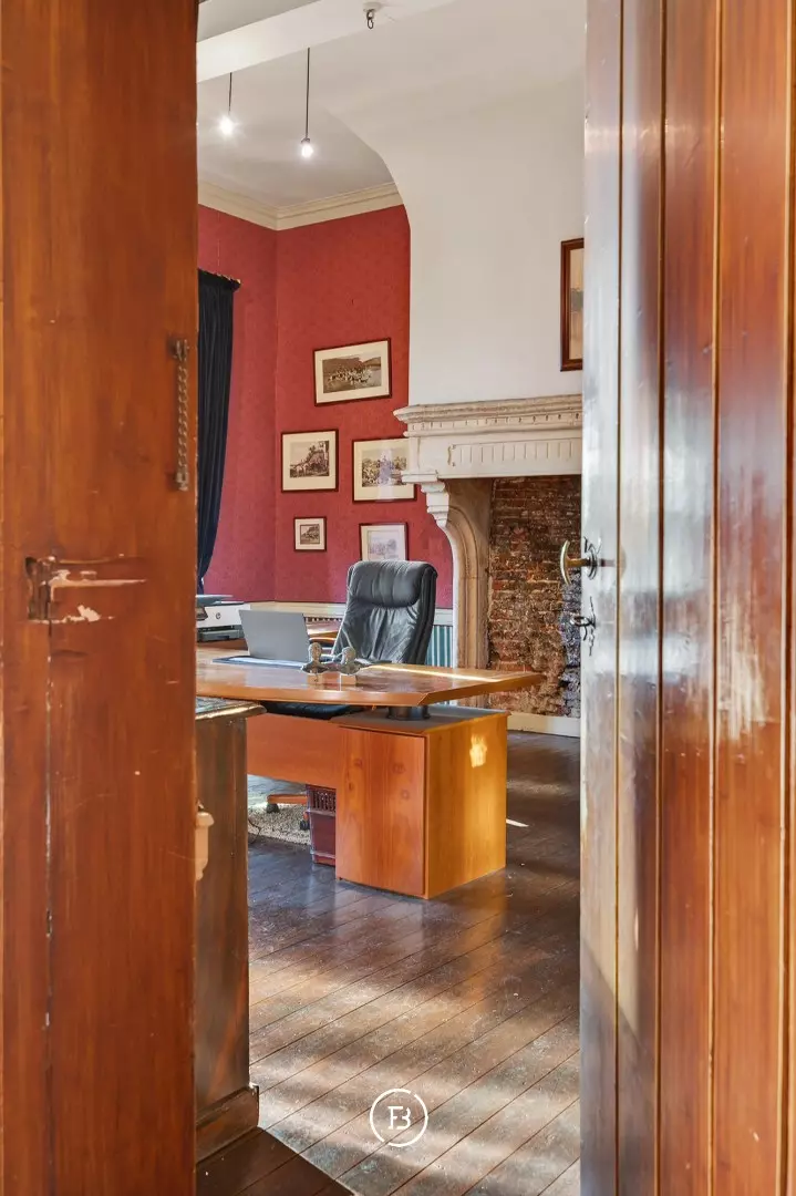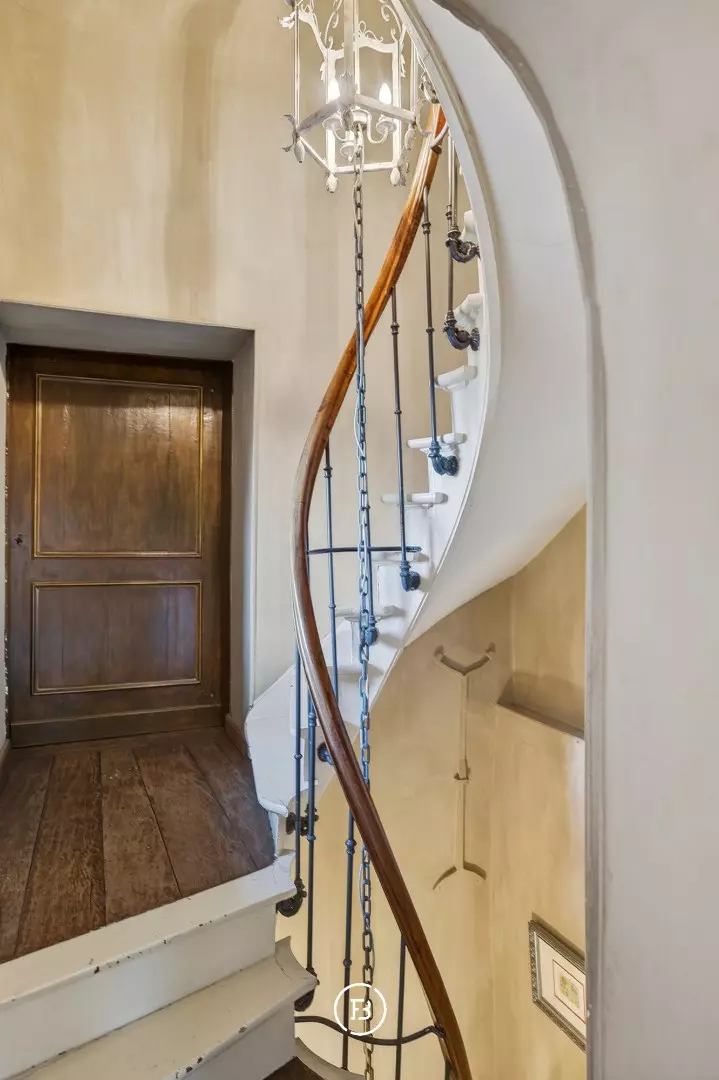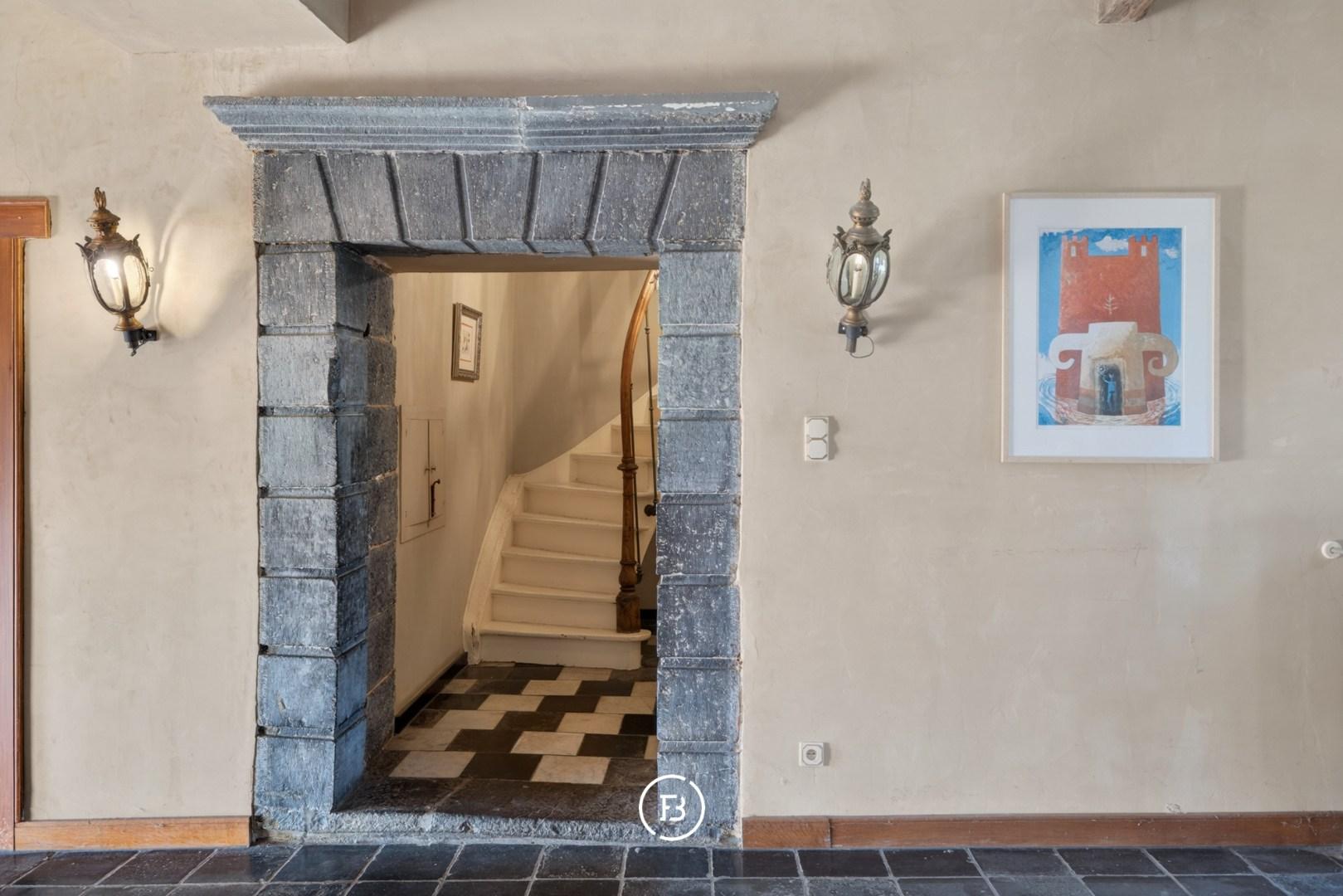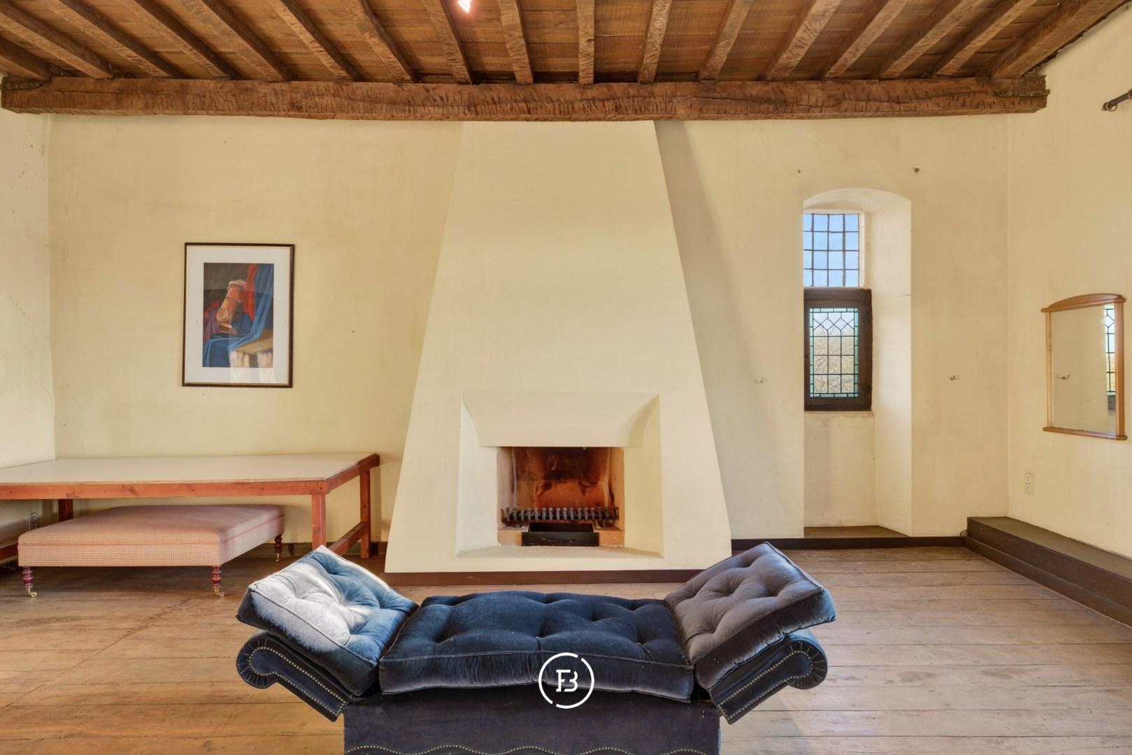 Doorheen het volledige eigendom bleven authentieke elementen zorgvuldig bewaard, waardoor het een sfeer uitstraalt van grandeur en rijke geschiedenis. In de toren leidt een karaktervolle trap naar de bovenverdiepingen en verder naar het dak met kantelen, waar u geniet van een adembenemend panoramisch uitzicht over de omliggende streek.