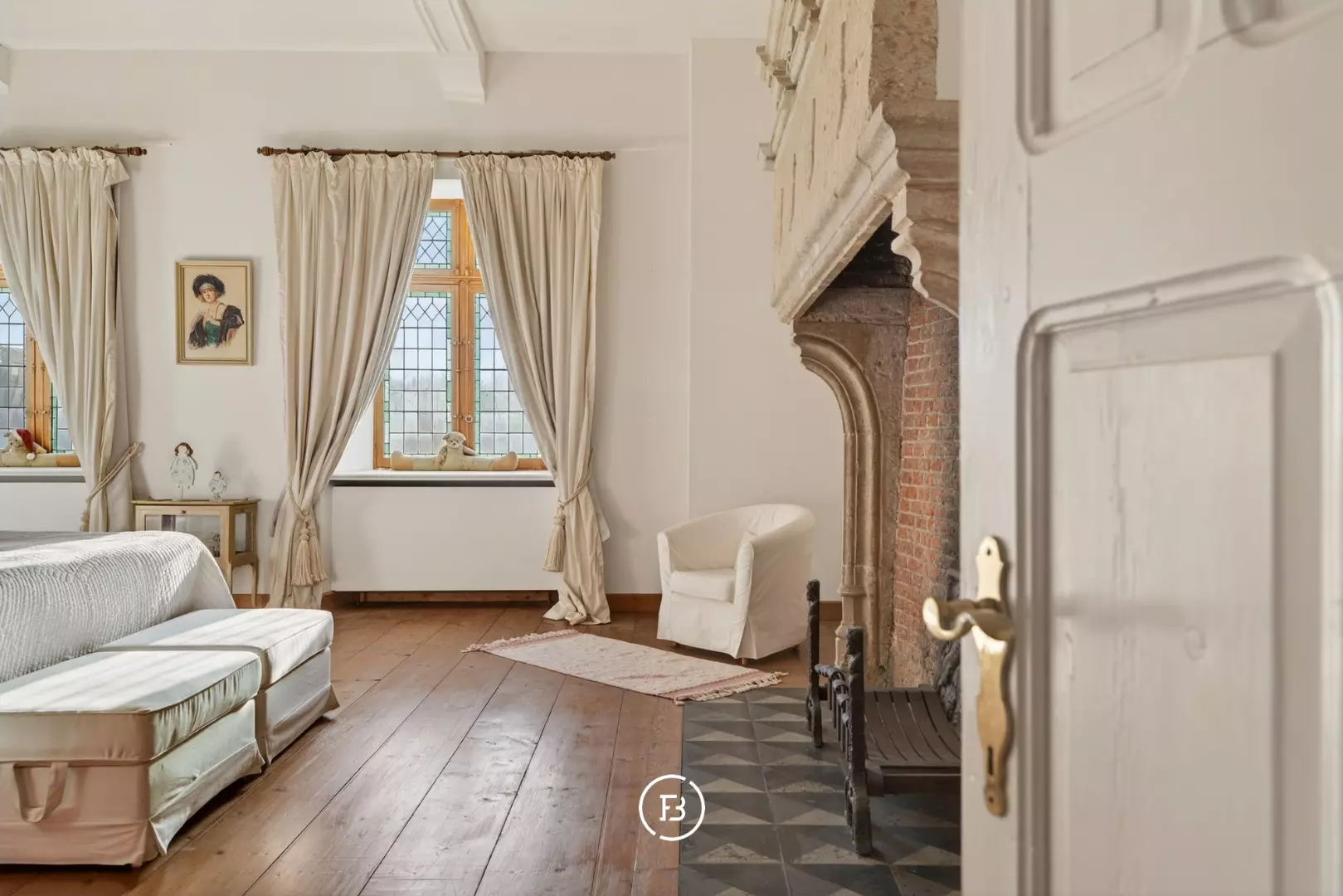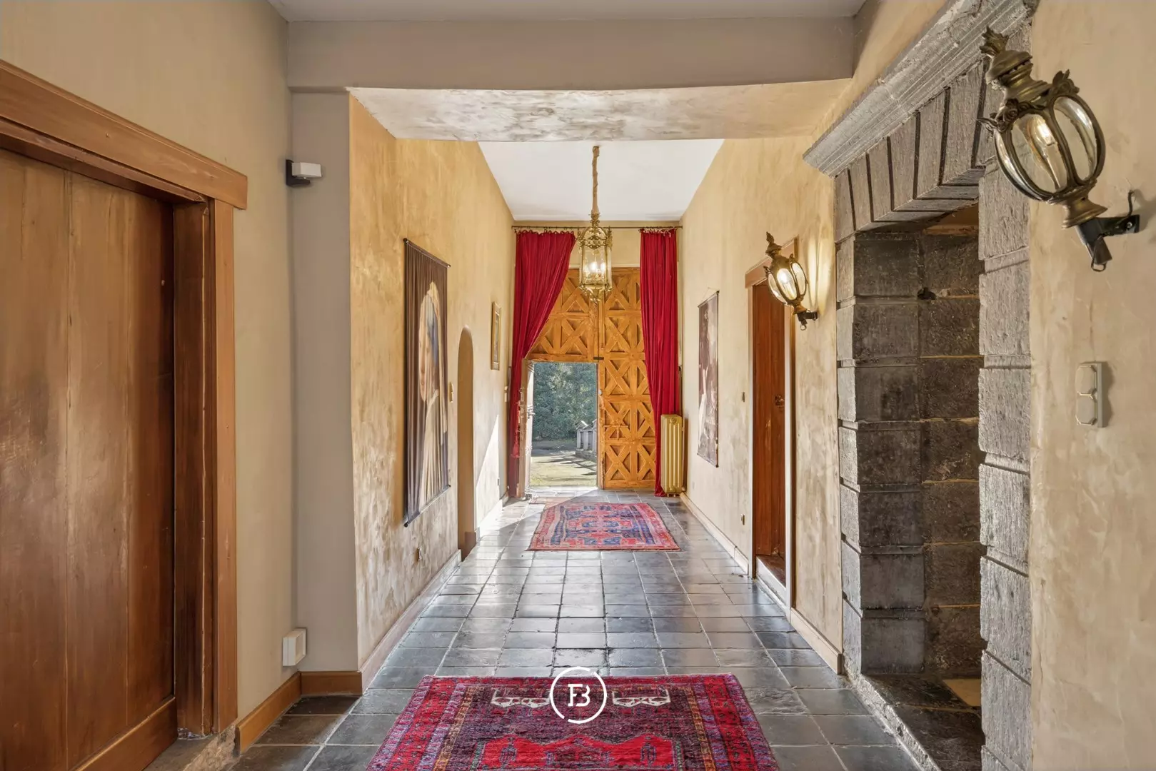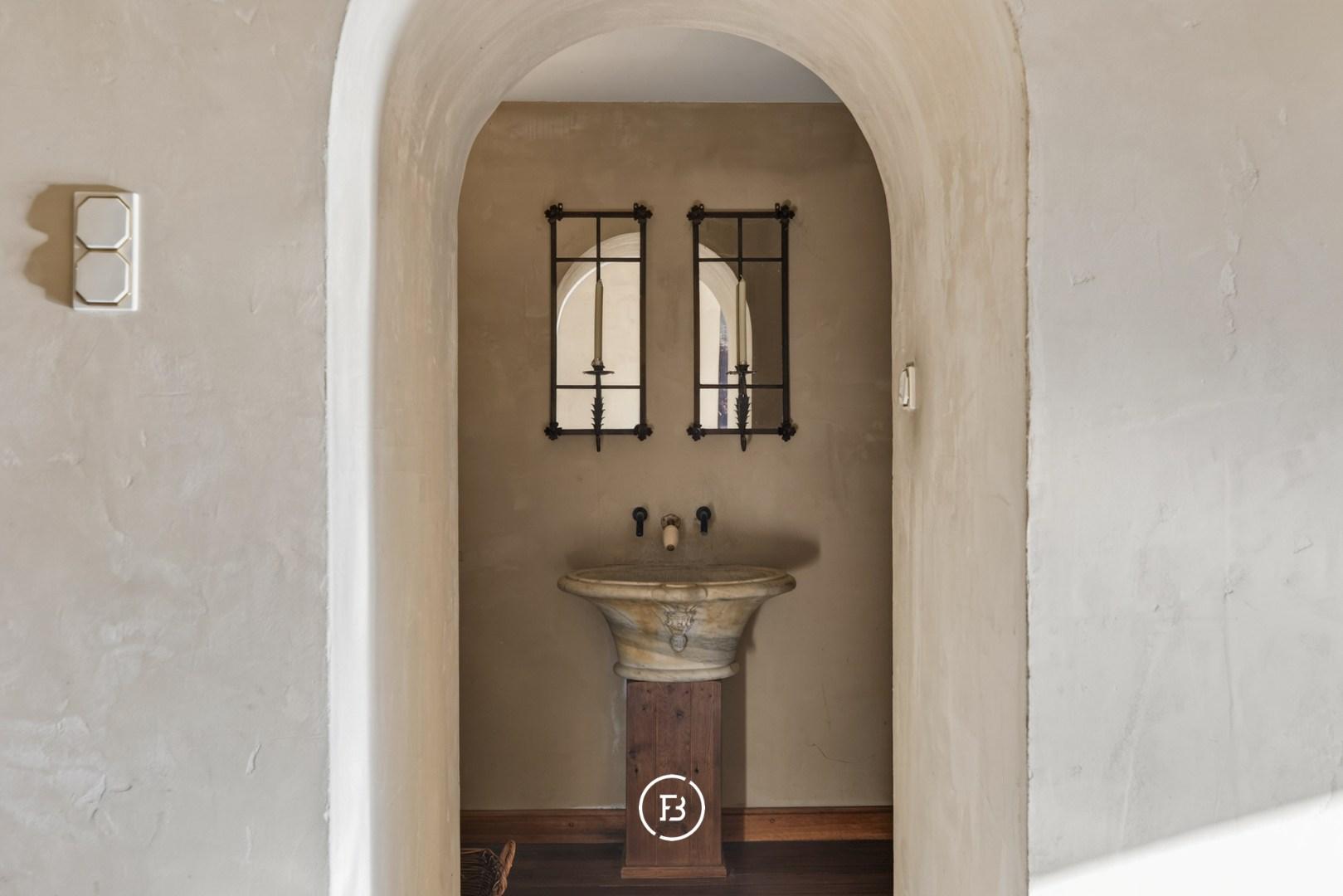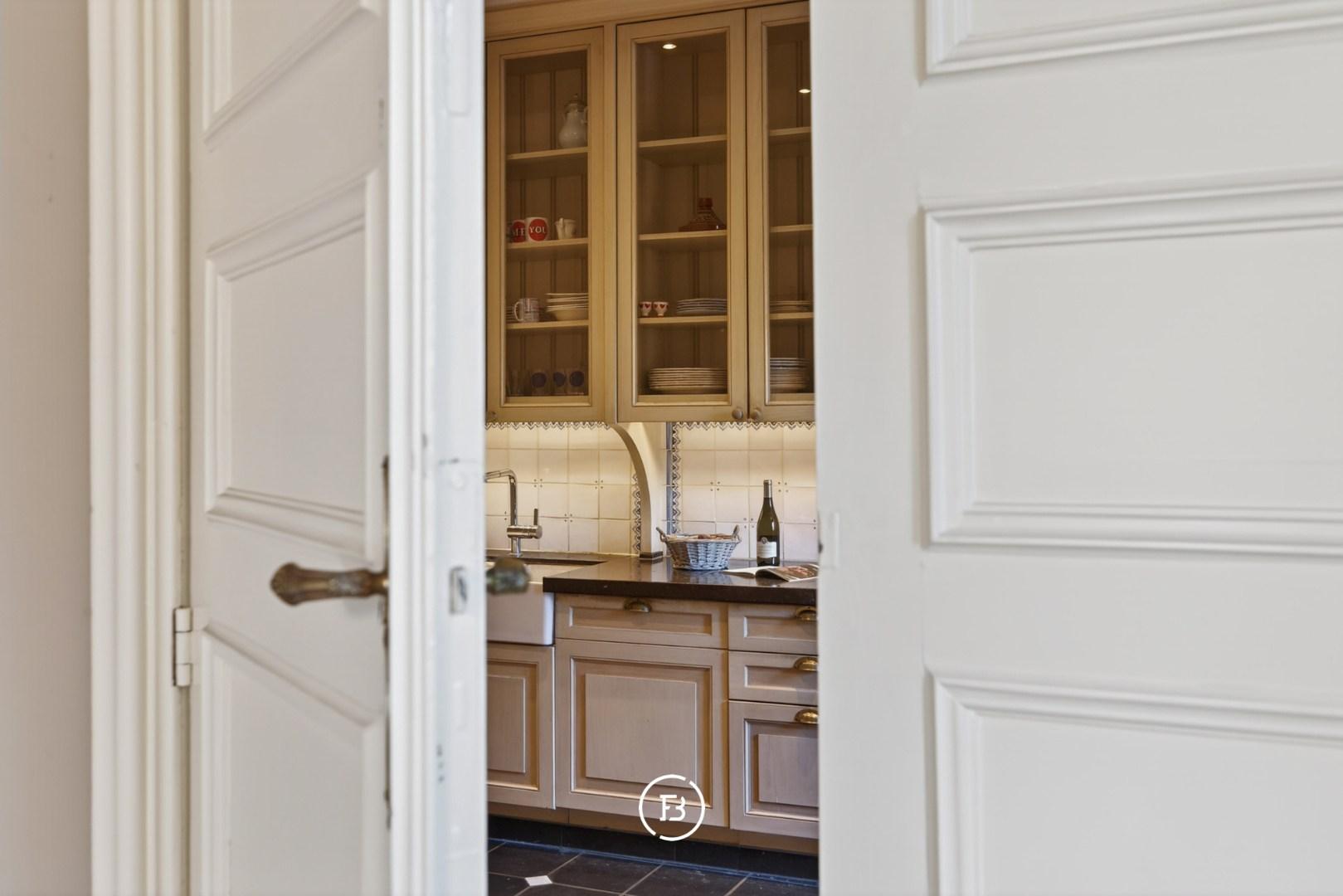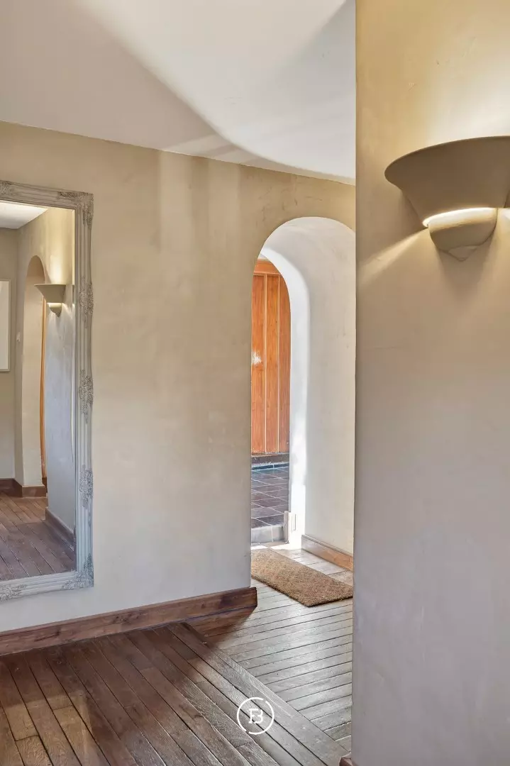 Doorheen het volledige eigendom bleven authentieke elementen zorgvuldig bewaard, waardoor het een sfeer uitstraalt van grandeur en rijke geschiedenis. In de toren leidt een karaktervolle trap naar de bovenverdiepingen en verder naar het dak met kantelen, waar u geniet van een adembenemend panoramisch uitzicht over de omliggende streek.