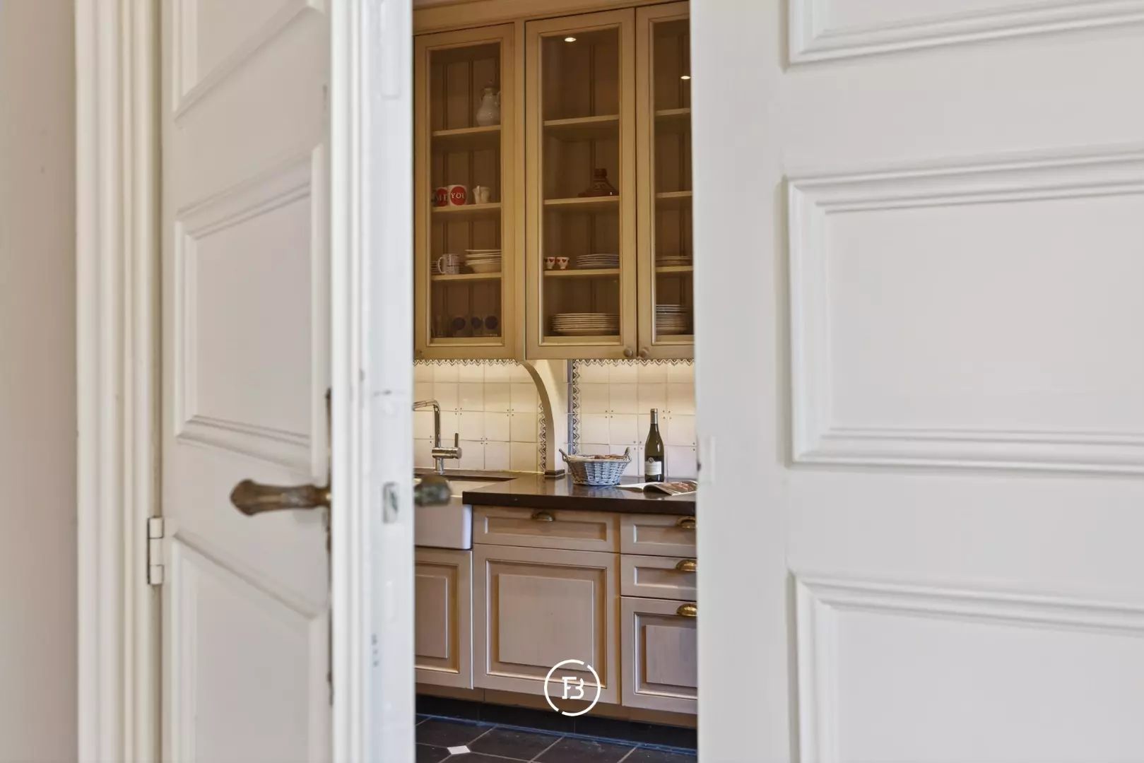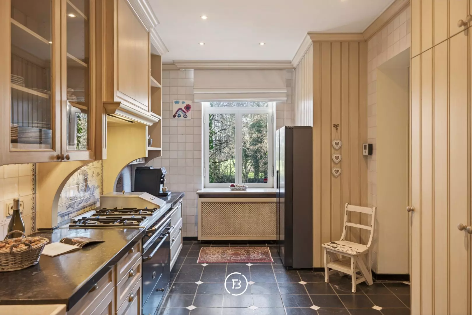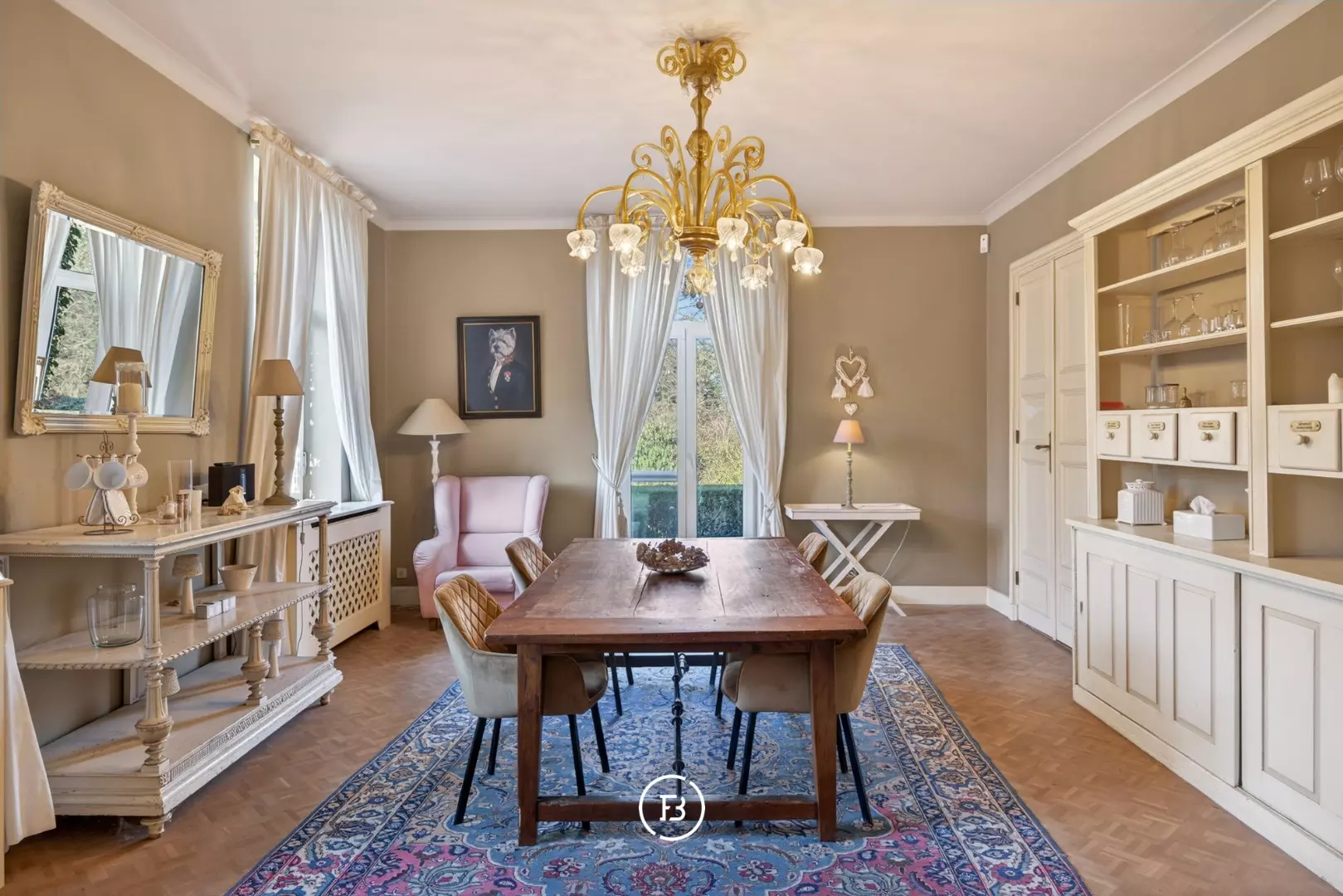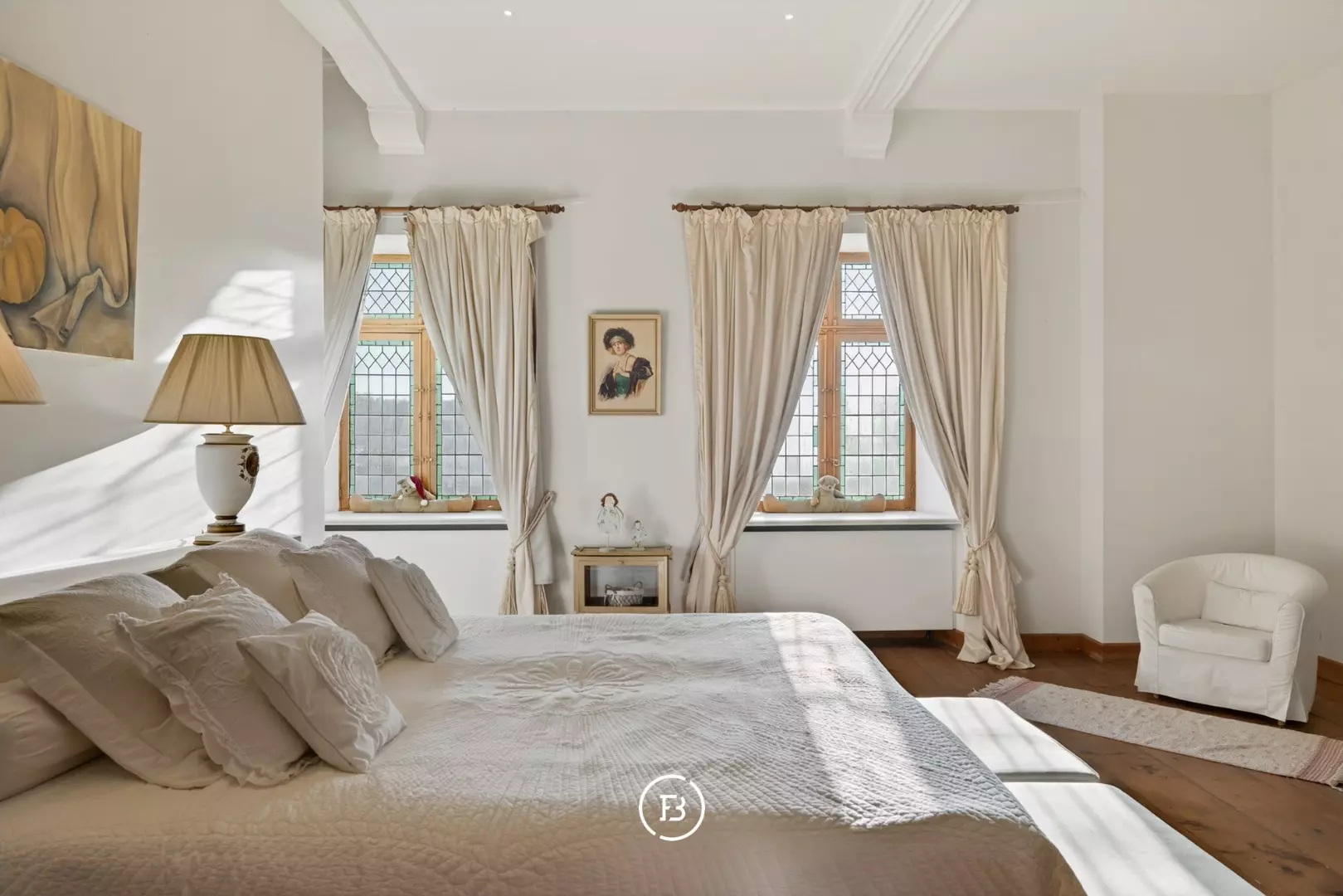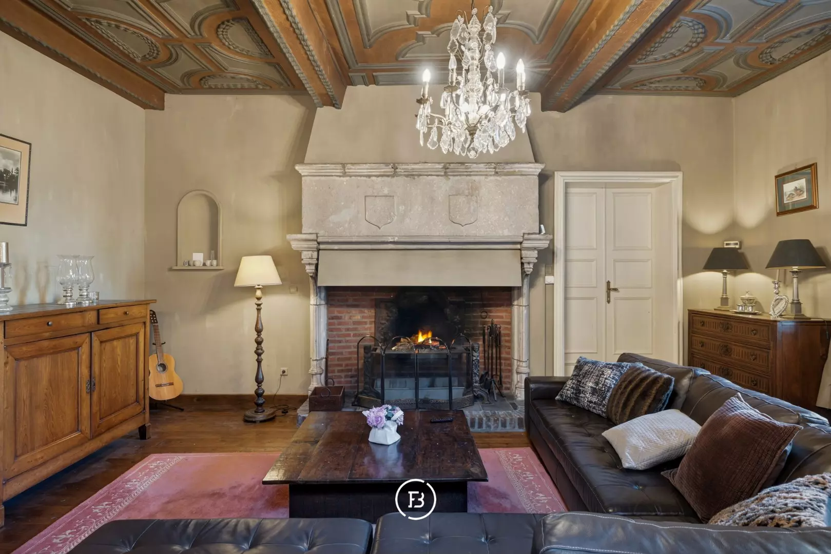 Doorheen het volledige eigendom bleven authentieke elementen zorgvuldig bewaard, waardoor het een sfeer uitstraalt van grandeur en rijke geschiedenis. In de toren leidt een karaktervolle trap naar de bovenverdiepingen en verder naar het dak met kantelen, waar u geniet van een adembenemend panoramisch uitzicht over de omliggende streek.