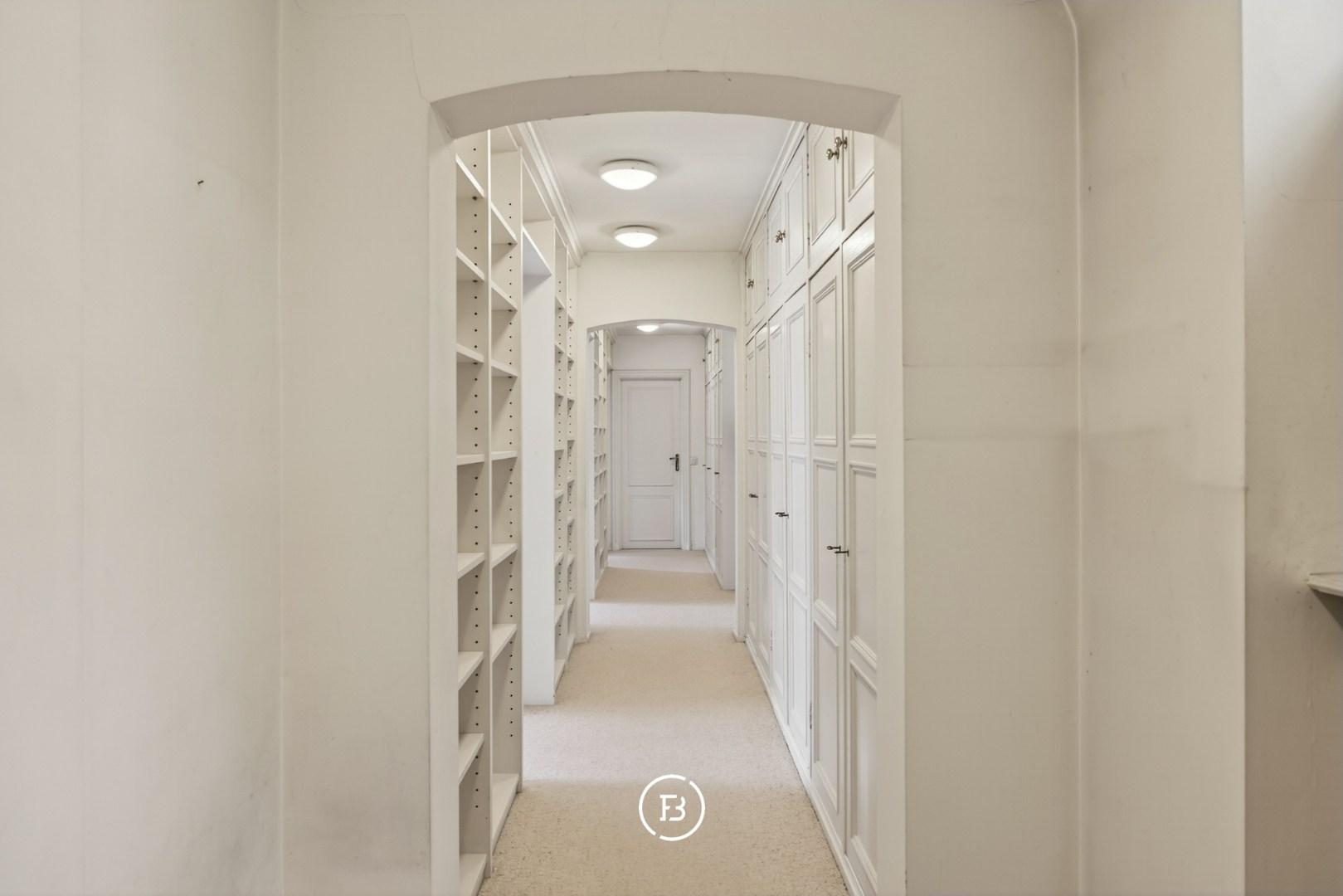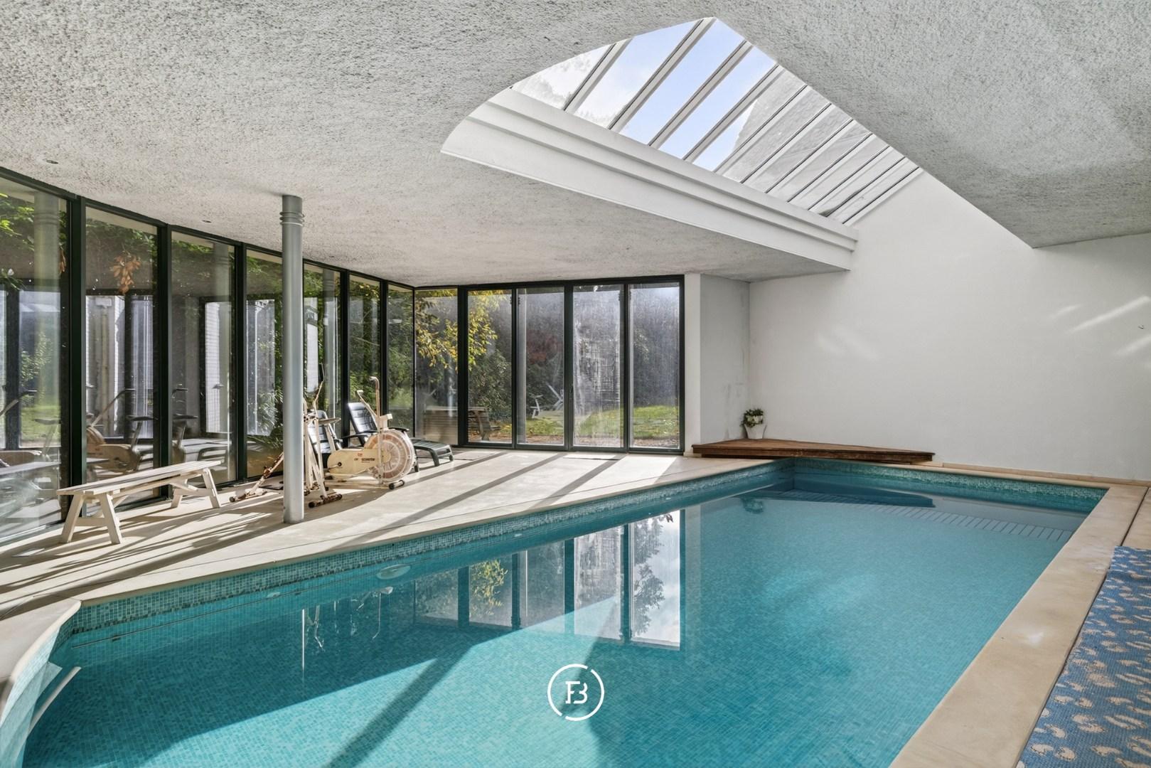Het gelijkvloers omvat verschillende leefruimtes en een eetkamer, een aparte keuken, een dienstingang en een dubbele garage. Daarnaast is er een afzonderlijke vleugel met eigen ingang, voorzien van een slaapkamer en badkamer, ideaal voor gasten of personeel. Verder beschikt het gelijkvloers over een binnenzwembad met douchefaciliteiten.