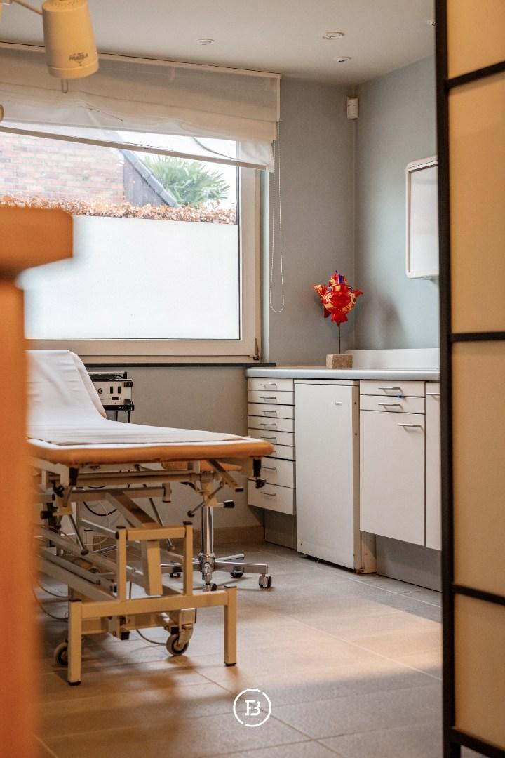Het praktijkgedeelte (apart perceelnummer) beschikt over een volledig aparte inkomhal met toilet, een wachtkamer, een eerste kabinet en een ruim secretariaat. Daarnaast is er een mogelijkheid tot uitbouw van een tweede kabinet (vergunning dd. 2002).